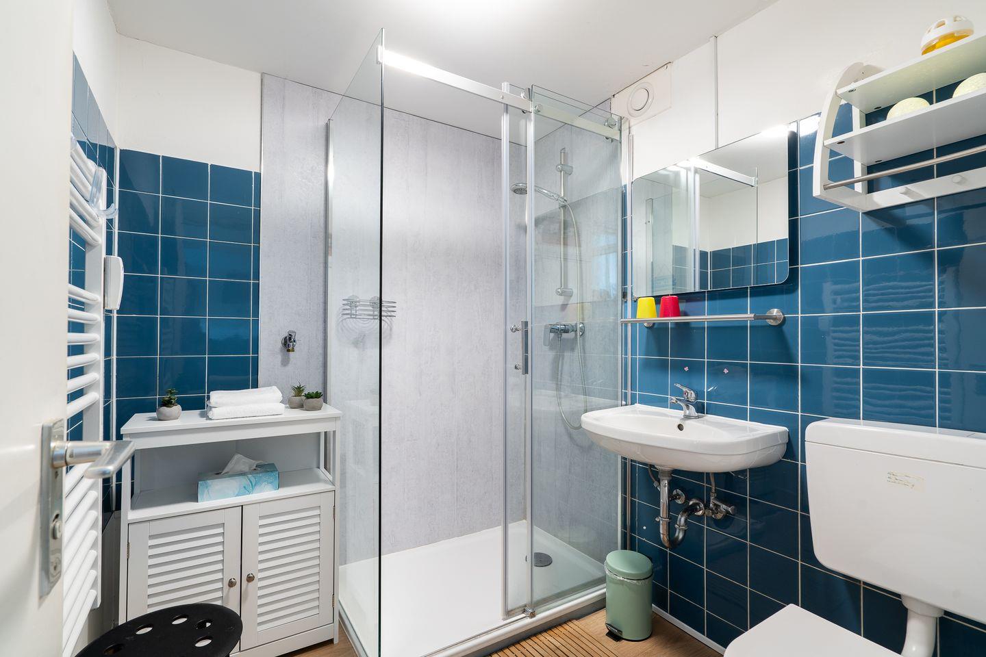 Das Badezimmer ist funktional gestaltet und mit einer Dusche mit niedrigem Einstieg ausgestattet. Ein Haartrockner ist vorhanden und sorgt für zusätzlichen Komfort während Ihres Aufenthalts.