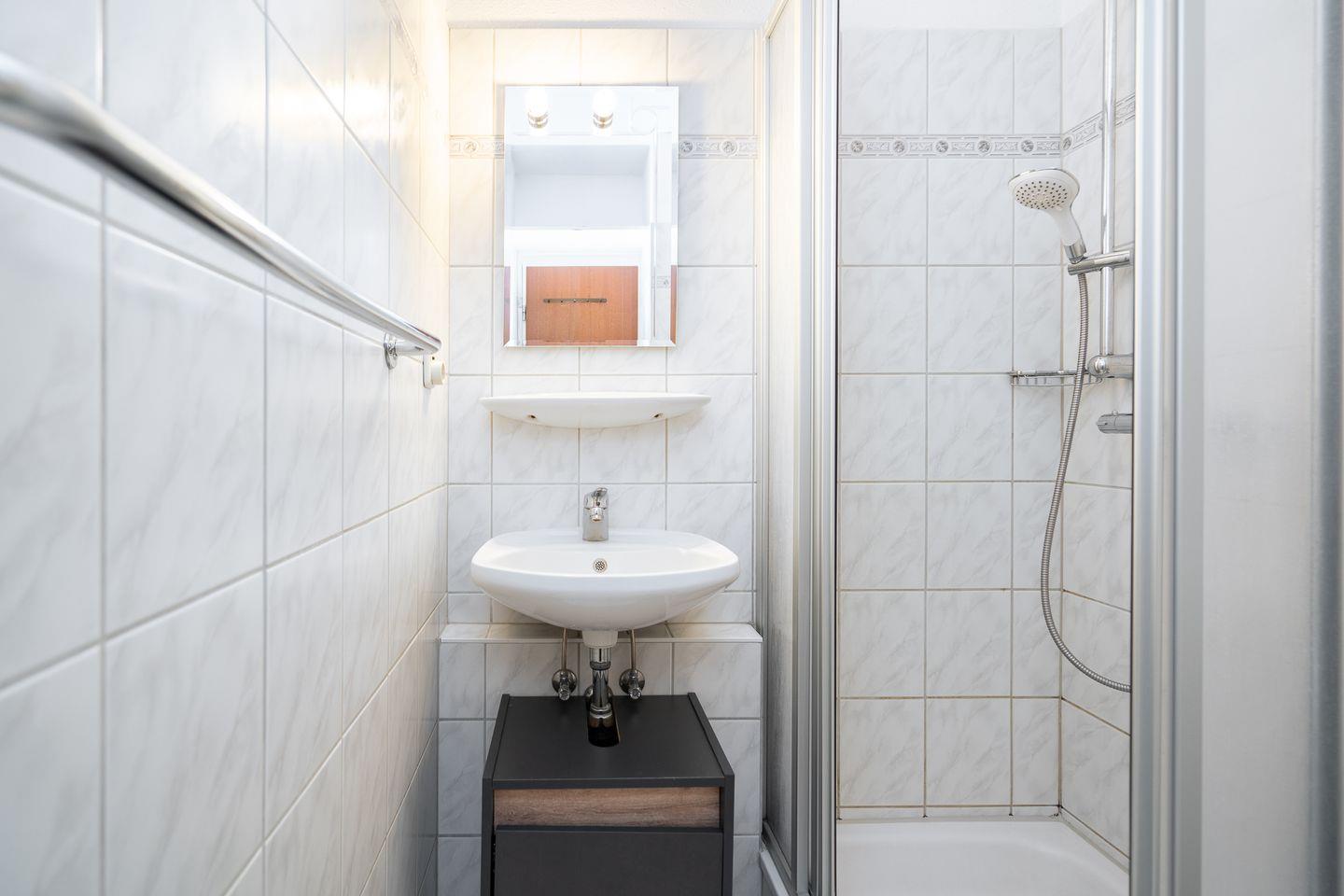 Das Badezimmer ist mit einer Dusche ausgestattet und funktional eingerichtet. Für längere Aufenthalte stehen gemeinschaftliche Waschmaschinen- und Trocknermöglichkeiten in der Anlage zur Verfügung (kostenpflichtig).