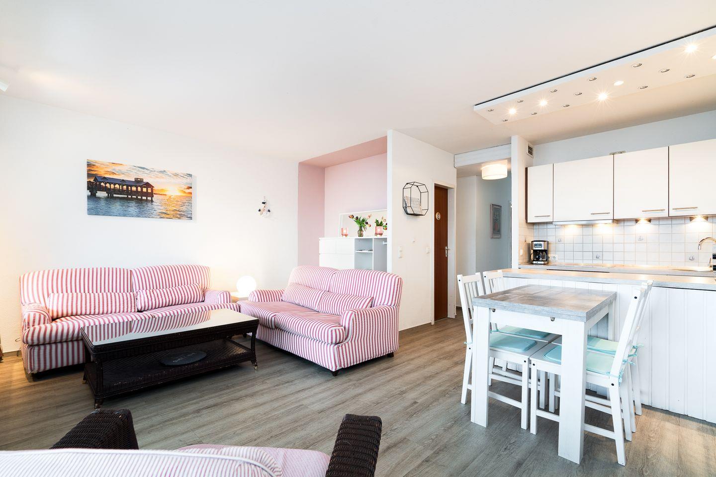 Der Wohnbereich ist gemütlich gestaltet und lädt nach einem erlebnisreichen Tag zum Entspannen ein. Ein Essplatz bietet Raum für gemeinsame Mahlzeiten oder Spieleabende. WLAN steht Ihnen in der gesamten Ferienwohnung kostenfrei zur Verfügung, ebenso ein TV für Unterhaltung am Abend.