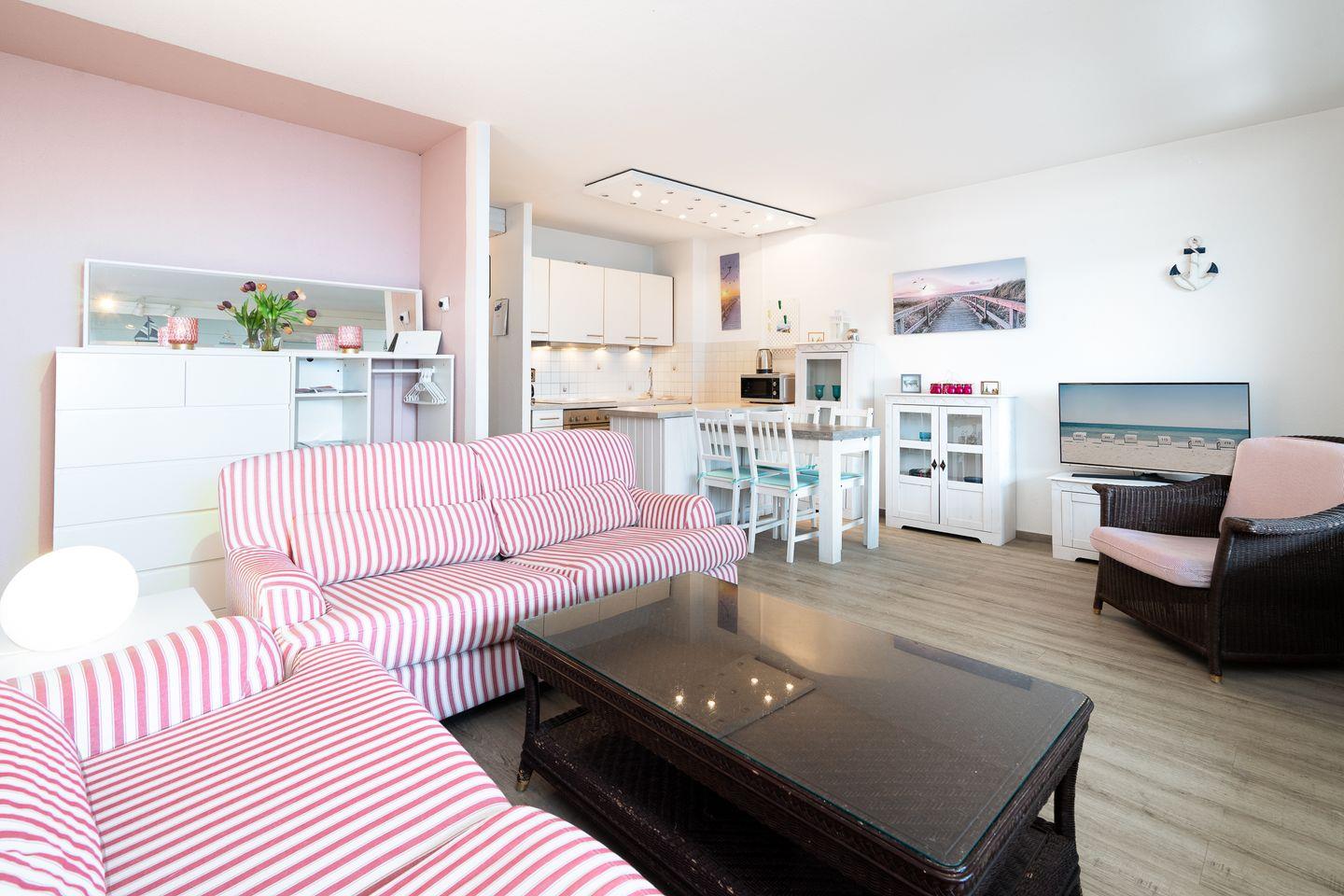 Ein Highlight der Ferienwohnung ist die möblierte Terrasse, auf der Sie die frische Ostseeluft genießen und den Tag entspannt beginnen oder ausklingen lassen können. Meerblick sorgt für echtes Urlaubsgefühl zu jeder Jahreszeit.