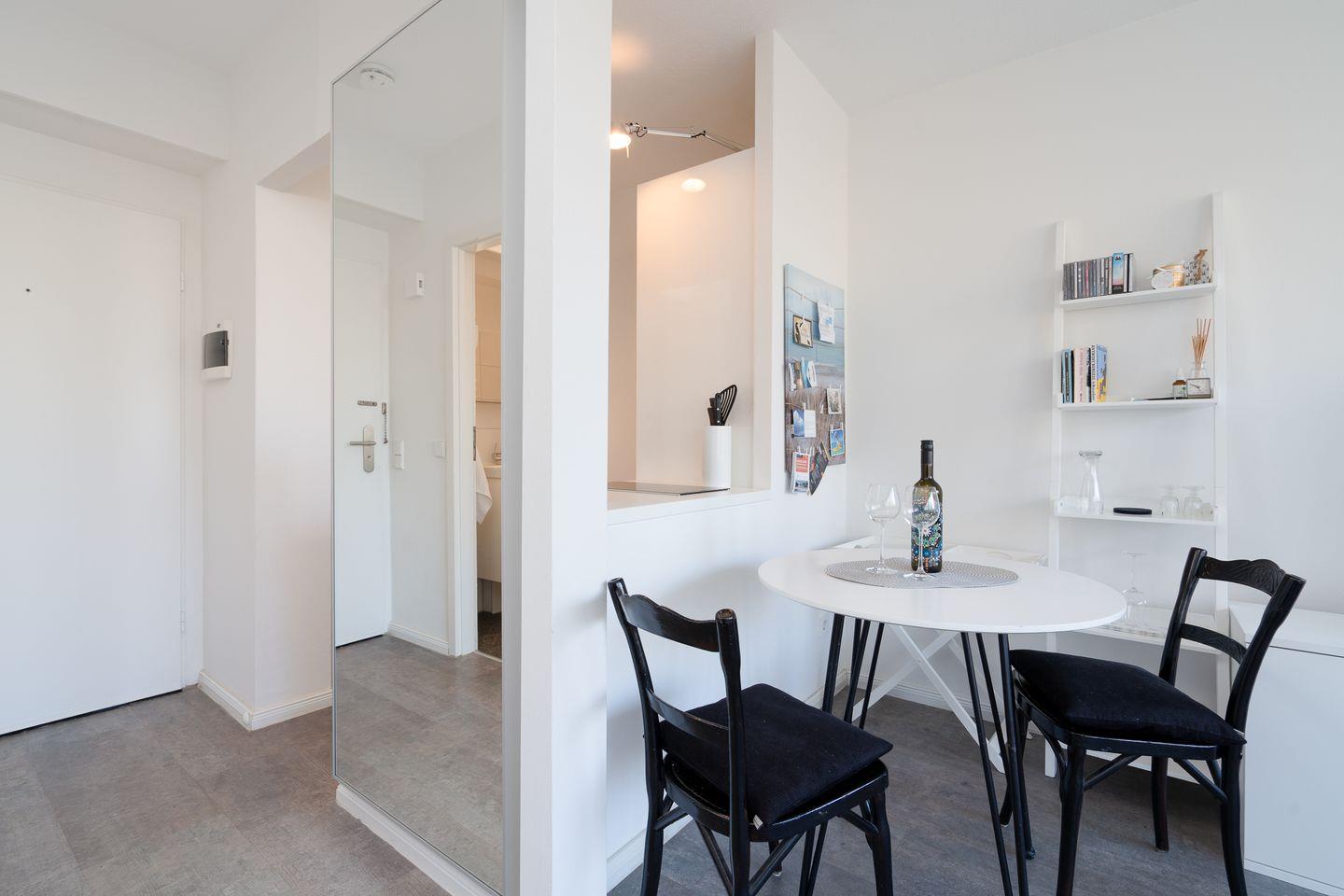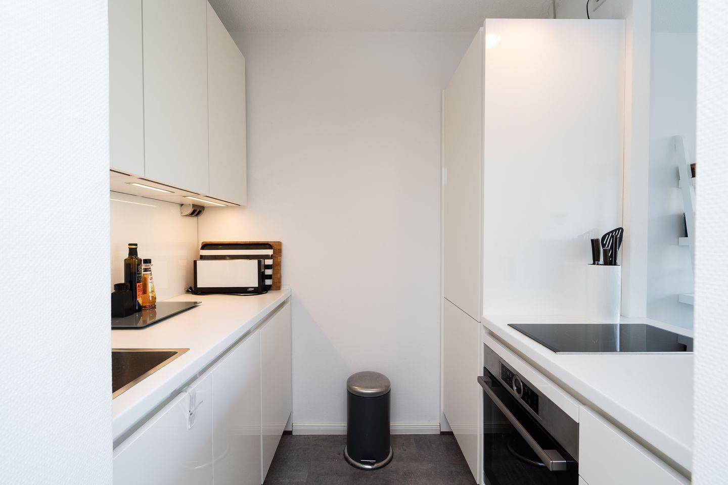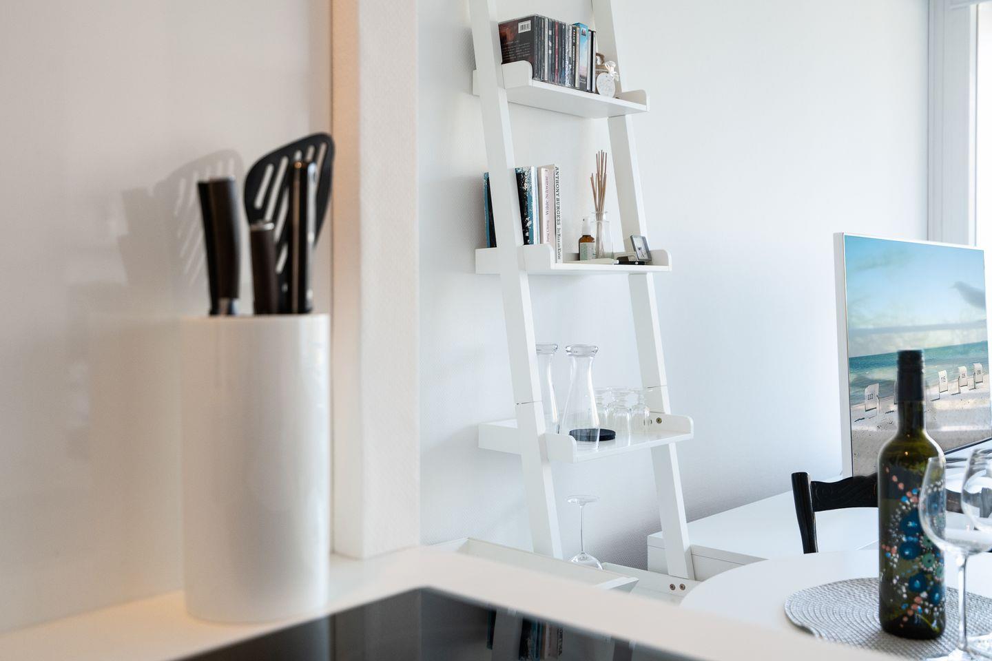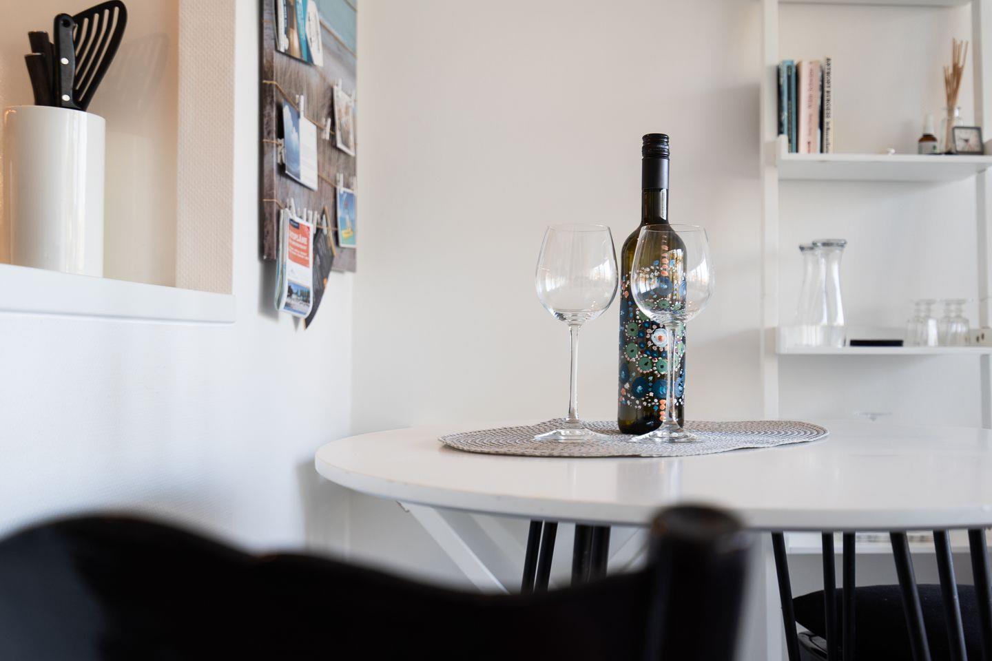 Die offene Küche ist hell und funktional eingerichtet und verfügt unter anderem über ein 2-Platten-Cerankochfeld, Kühlschrank mit Gefrierfach, Kaffeemaschine, Wasserkocher und Toaster. Ein Essbereich ist ebenfalls vorhanden.