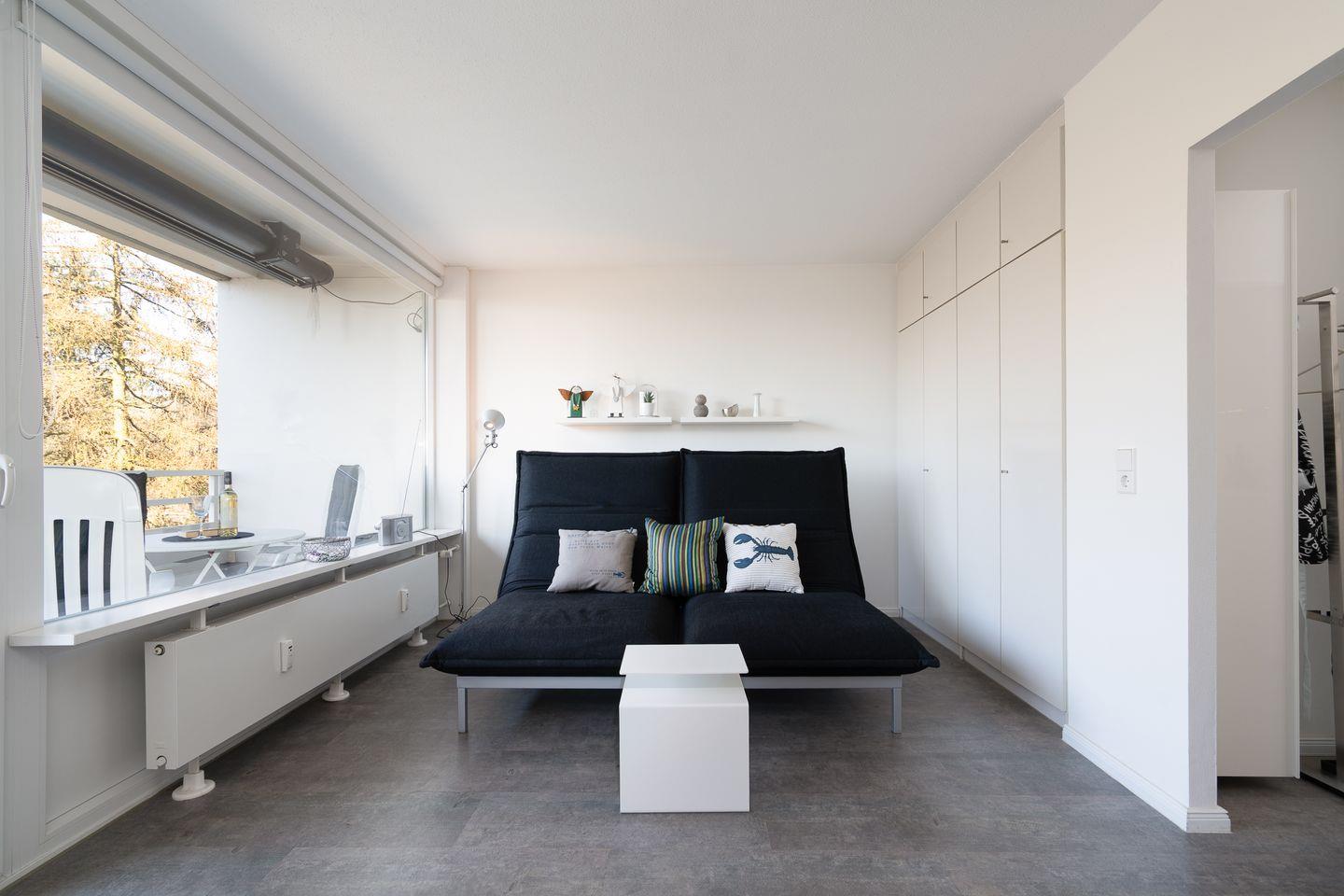Der helle Wohnbereich überzeugt mit großen Fensterflächen und Zugang zum möblierten Balkon, von dem aus sich ein schöner, seitlicher Blick auf die Ostsee genießen lässt. Eine elektrische Markise sorgt bequem für Sonnenschutz. Hier lässt sich der Tag entspannt bei frischer Meeresluft beginnen oder ausklingen. Der kombinierte Wohn- und Schlafbereich ist mit einem komfortablen Schlafsofa (ca. 180 x 200 cm) ausgestattet, Verdunklung zur Nacht ist über Rollos möglich.
