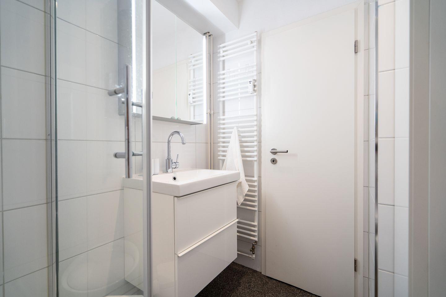 Das modern gestaltete Badezimmer ist mit Dusche, Spiegel mit Beleuchtung, beheizbarem Handtuchhalter und WC ausgestattet.