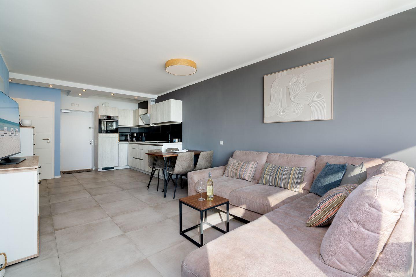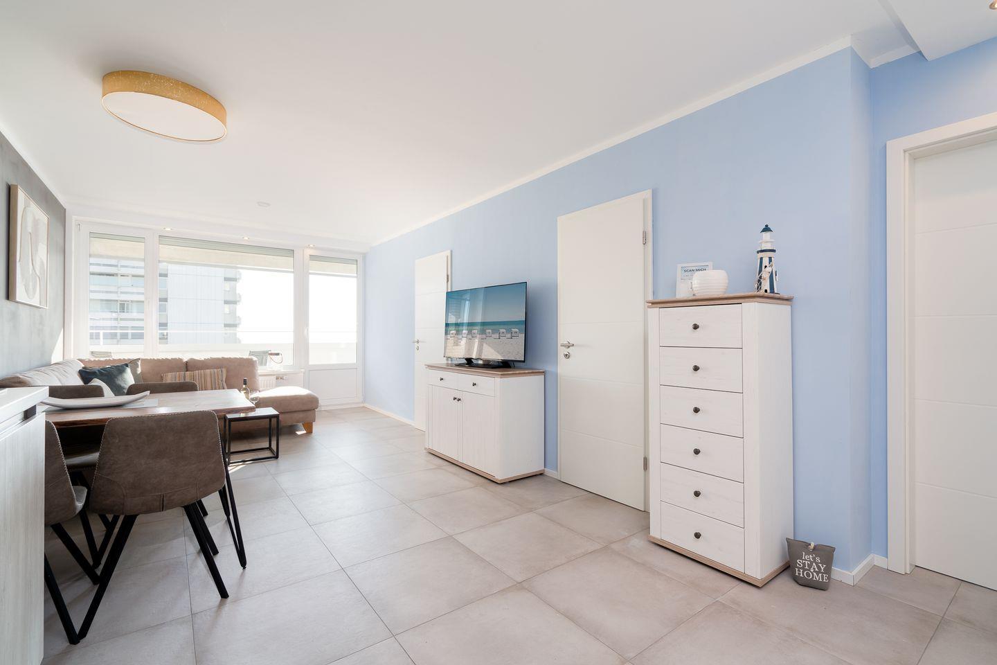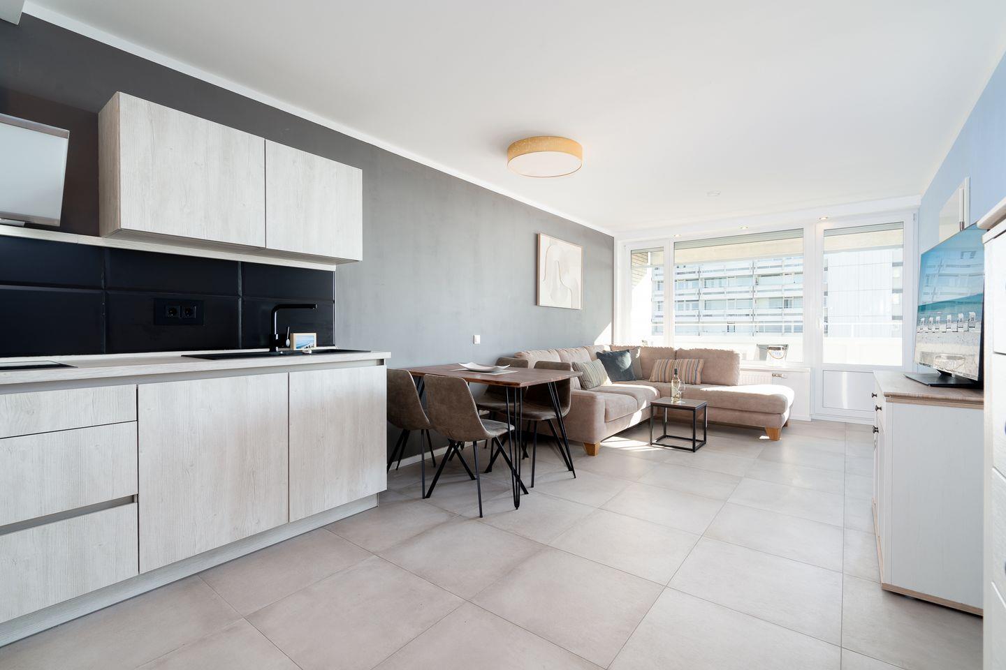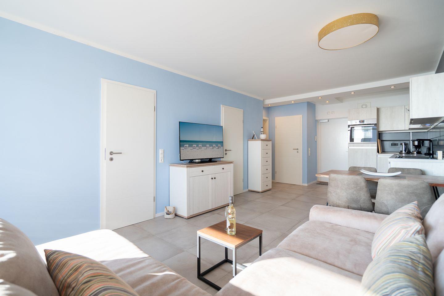 Der lichtdurchflutete Wohnbereich verfügt über eine gemütliche Sitzecke mit Smart-TV sowie Panoramablick über die Ostsee. Von hier aus gelangen Sie direkt auf den Balkon – perfekt für ein Frühstück mit Meeresrauschen oder einen entspannten Tagesausklang mit uneingeschränktem Meerblick.