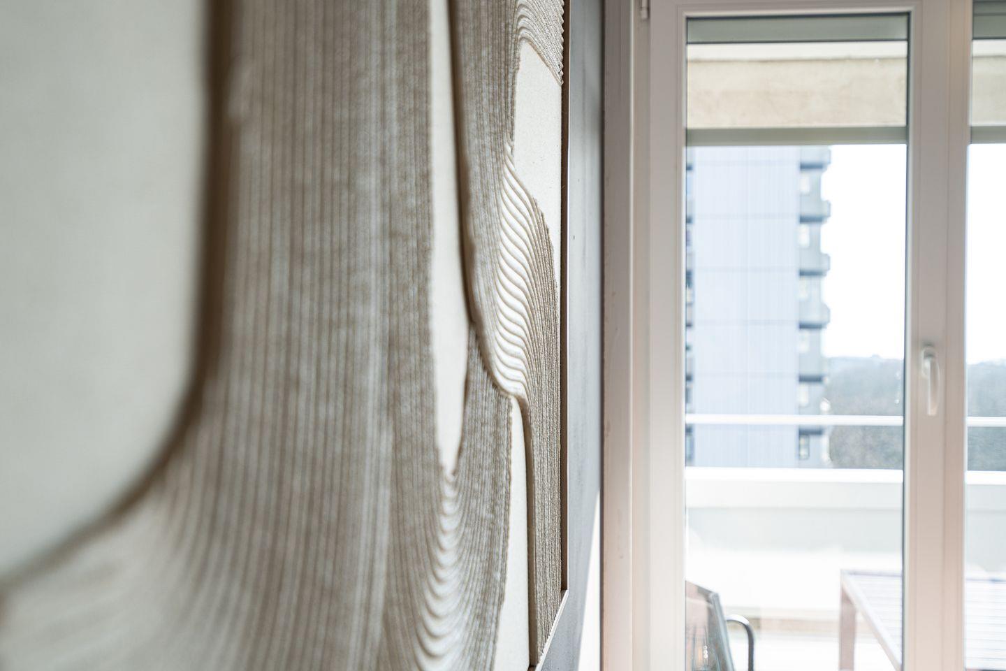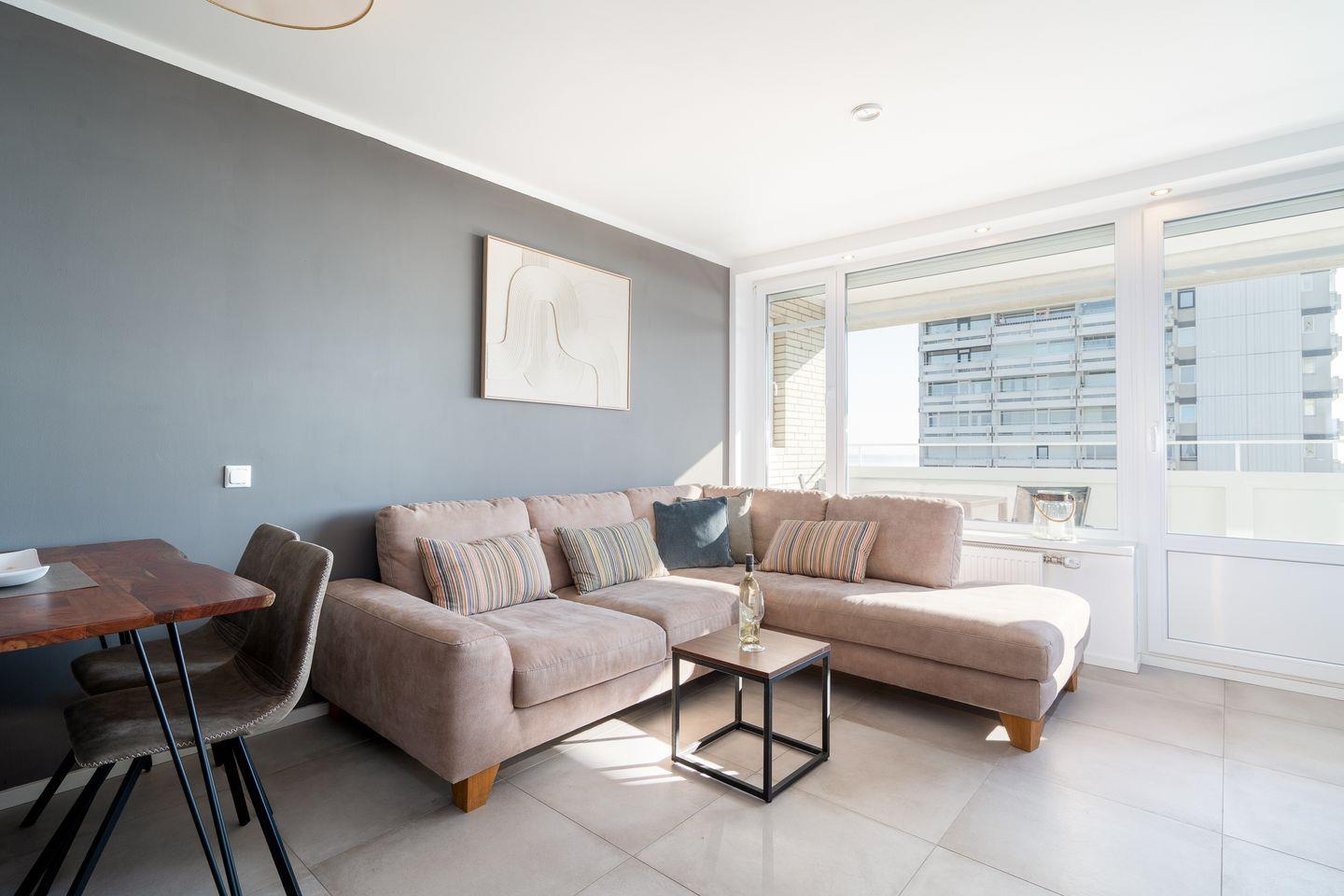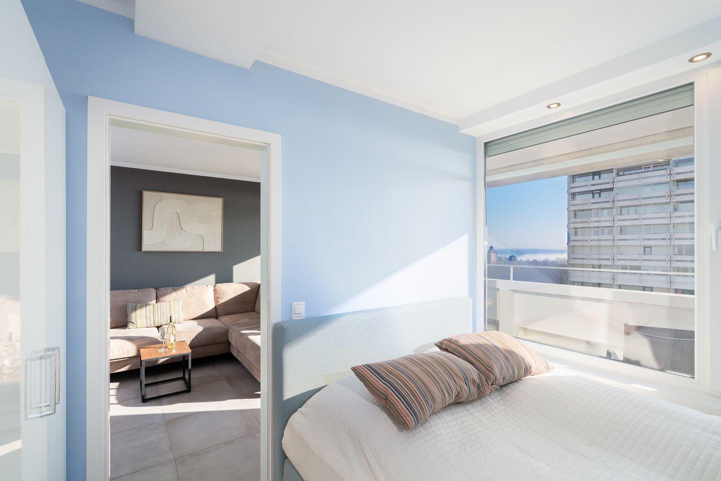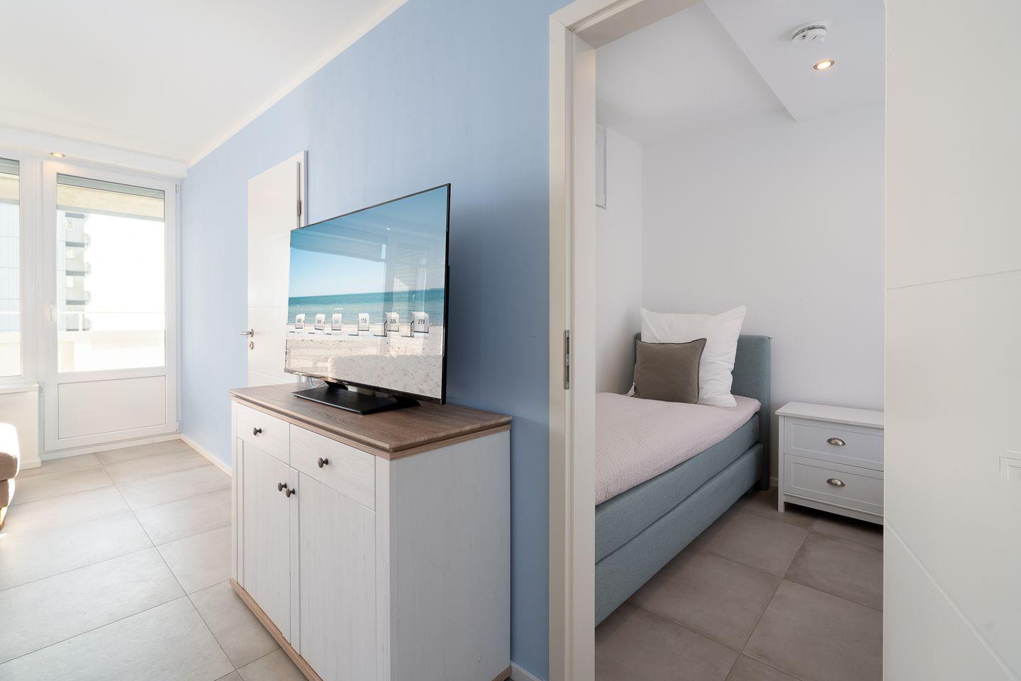 Der lichtdurchflutete Wohnbereich verfügt über eine gemütliche Sitzecke mit Smart-TV sowie Panoramablick über die Ostsee. Von hier aus gelangen Sie direkt auf den Balkon – perfekt für ein Frühstück mit Meeresrauschen oder einen entspannten Tagesausklang mit uneingeschränktem Meerblick.