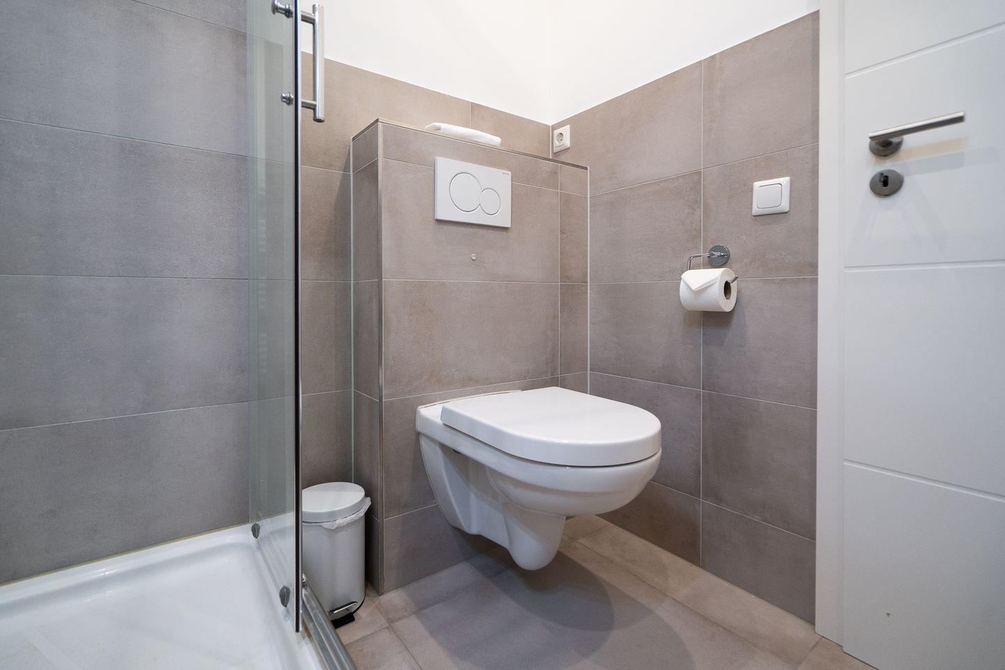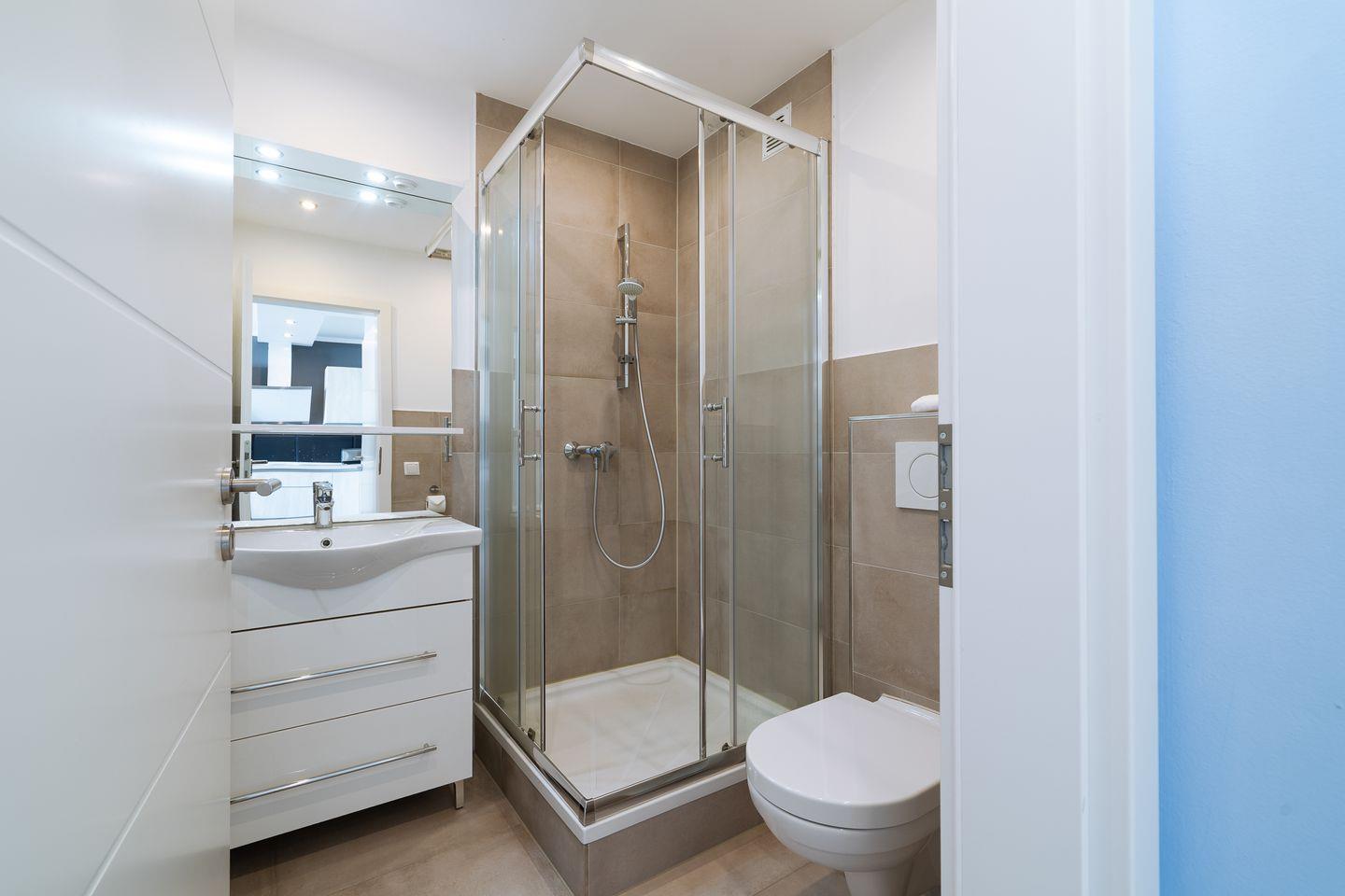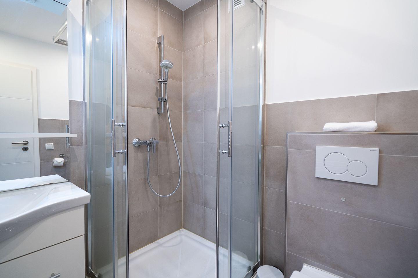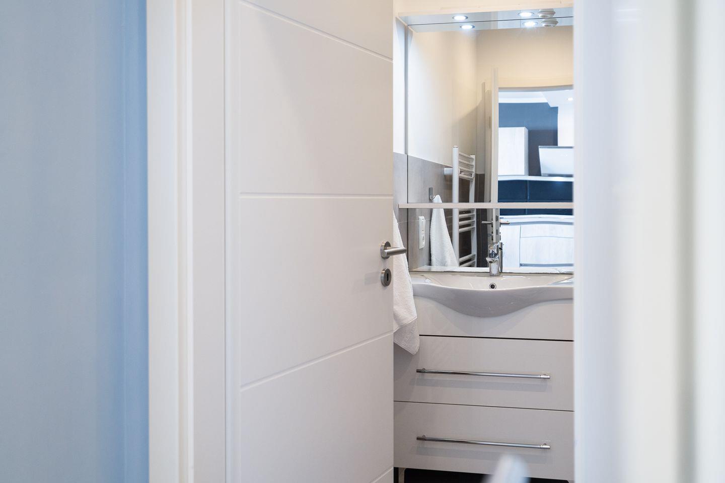 Das Badezimmer ist geschmackvoll in hellen Farbtönen gestaltet und mit Dusche, Waschtisch, Spiegel und WC ausgestattet. In einer separaten Abstellkammer steht ein Waschtrockner für die Urlaubswäsche zur Verfügung.