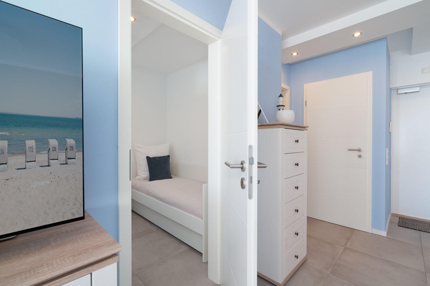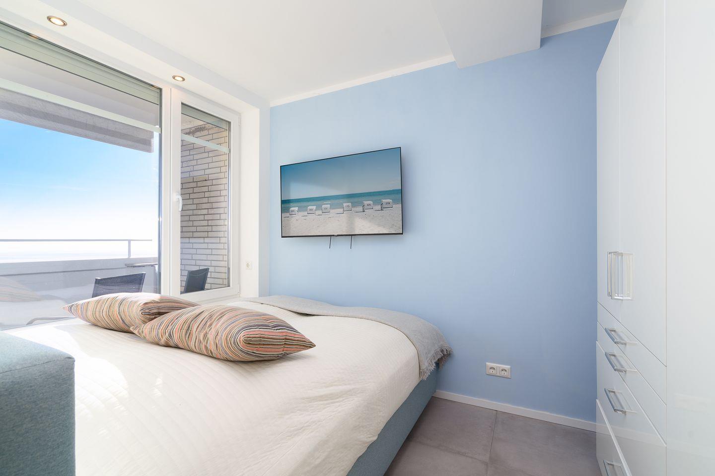 Ein Schlafzimmer ist mit einem französischem Doppelbett ausgestattet (Liegefläche ca. 160 x 200cm) und begeistert auch hier mit herrlichem Meerblick, ein geräumiger Kleiderschrank nimmt problemlos die Urlaubsgarderobe auf. Das zweite Schlafzimmer ist innenliegend und bietet zwei Einzelbetten (je 90 x 200cm). Beide Räume können zentral über im Hauptschlafzimmer positionierte elektronische Jalousien verdunkelt werden, sodass einem erholsamen Schlaf nichts im Wege steht.