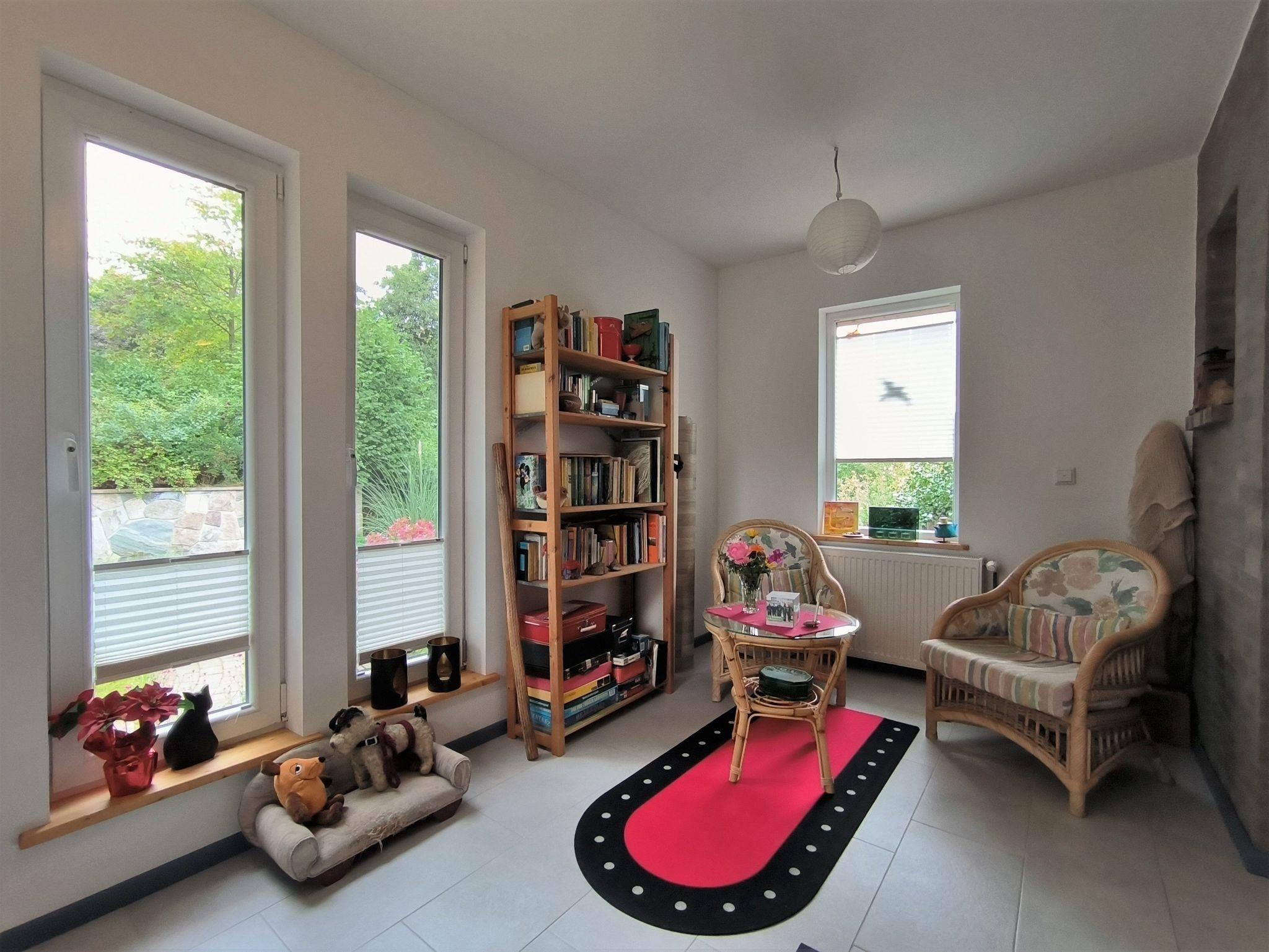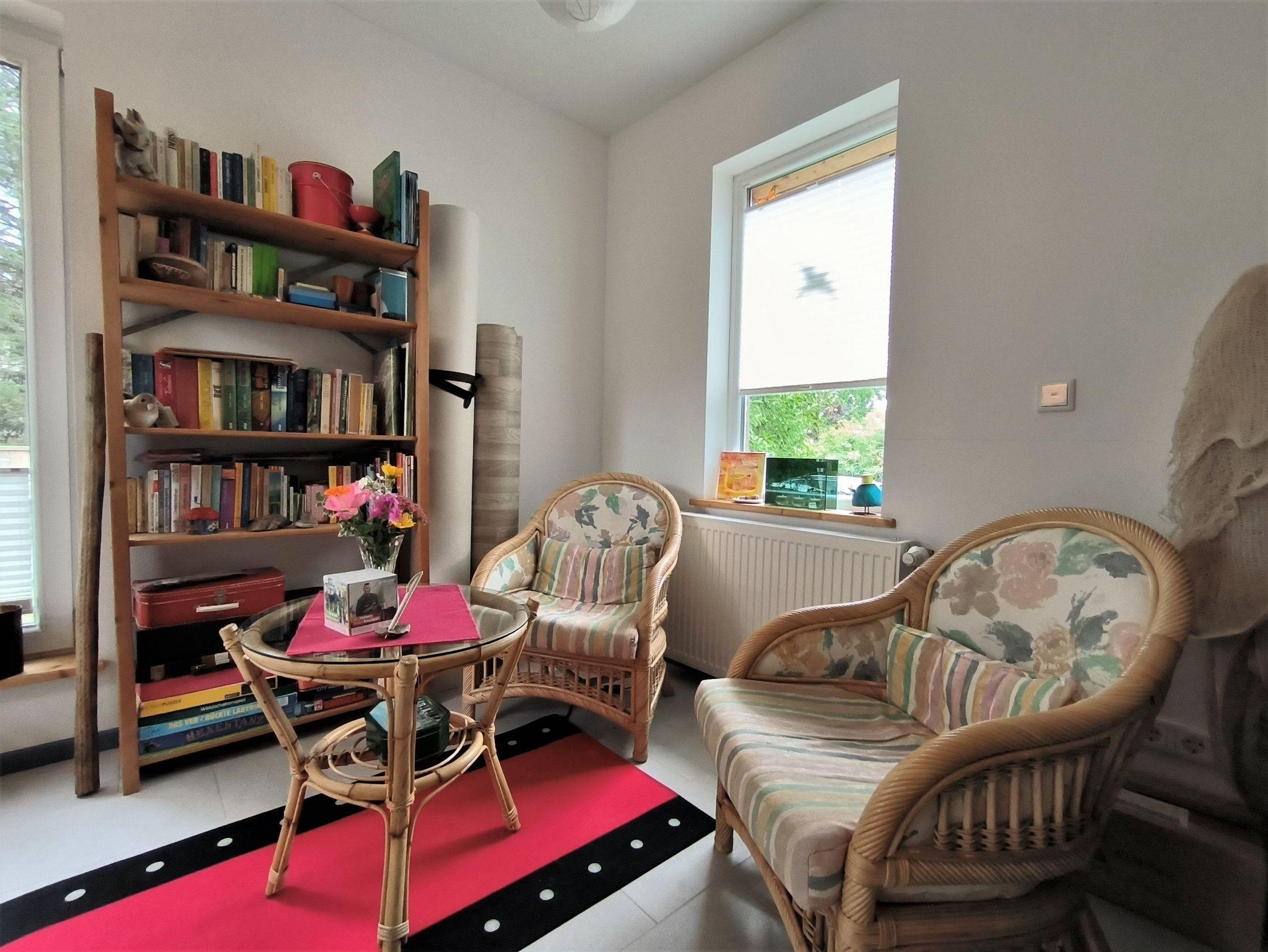 Das Gästezimmer mit franzözischem Bett (1,40 x 2,00 m) ist mit einem offenen Kleiderschrank und Verdunklungsrollo sowie einem Fliegengitter ausgestattet. Gleich nebenan ist ein Aufenthaltsraum mit Küchenzeile (Waschbecken, zwei Herdplatten Kühlschrank), einem Geschirrschrank, einem Esstisch für zwei Personen sowie einem kleinen Sofa und TV. Im geräumigen Badezimmer mit Tageslicht finden die Gäste ein Waschbecken, eine Toilette und die Badewanne sowie einen Wäscheständer und einen Föhn. Im Eingangsbereich kann man auf zwei Korbstühlen oder im Vorgarten auf zwei Gartenstühlen sitzen.