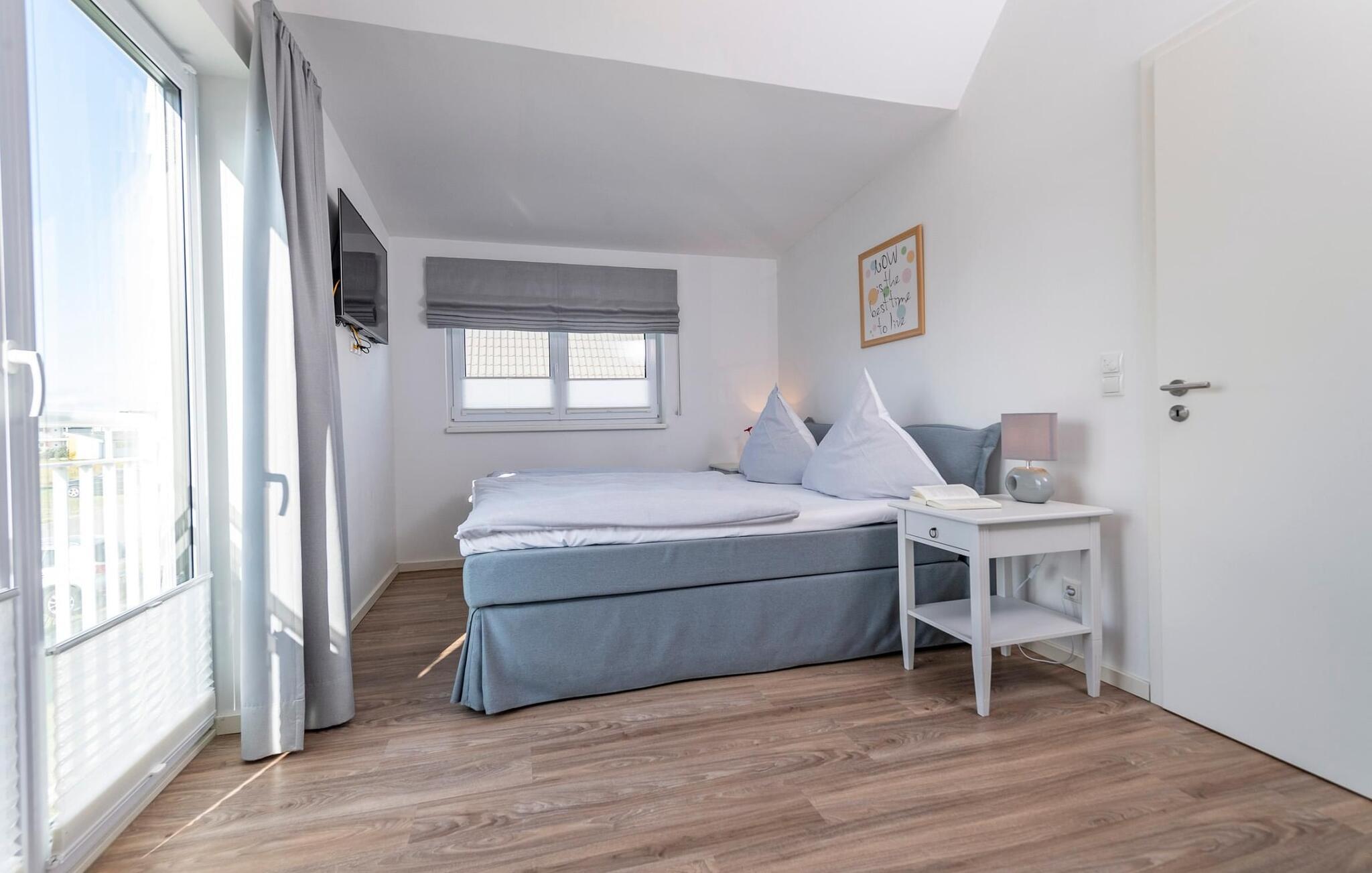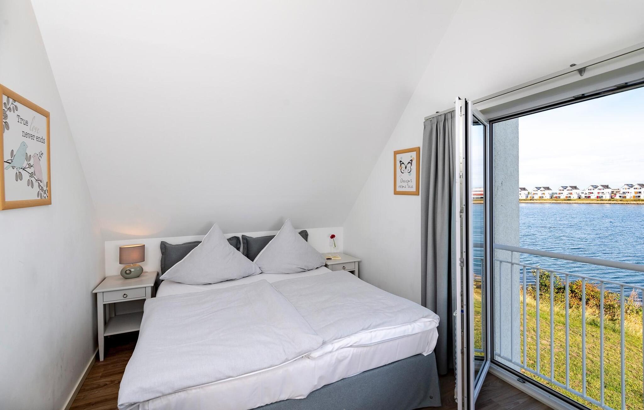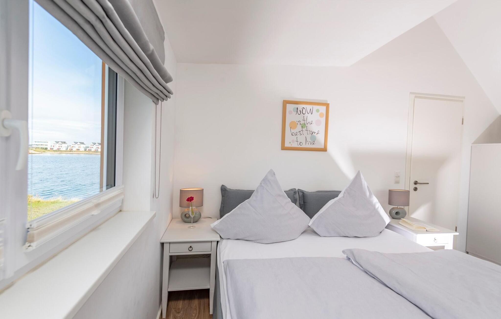 Im ersten Obergeschoss befinden sich zwei Schlafzimmer. Während das Hauptschlafzimmer mit einem traumhaften Blick auf Hafen und Ostsee überzeugt, verfügt das zweite Schlafzimmer über einen zusätzlichen Flatscreen-TV mit Home Entertainment Programm.