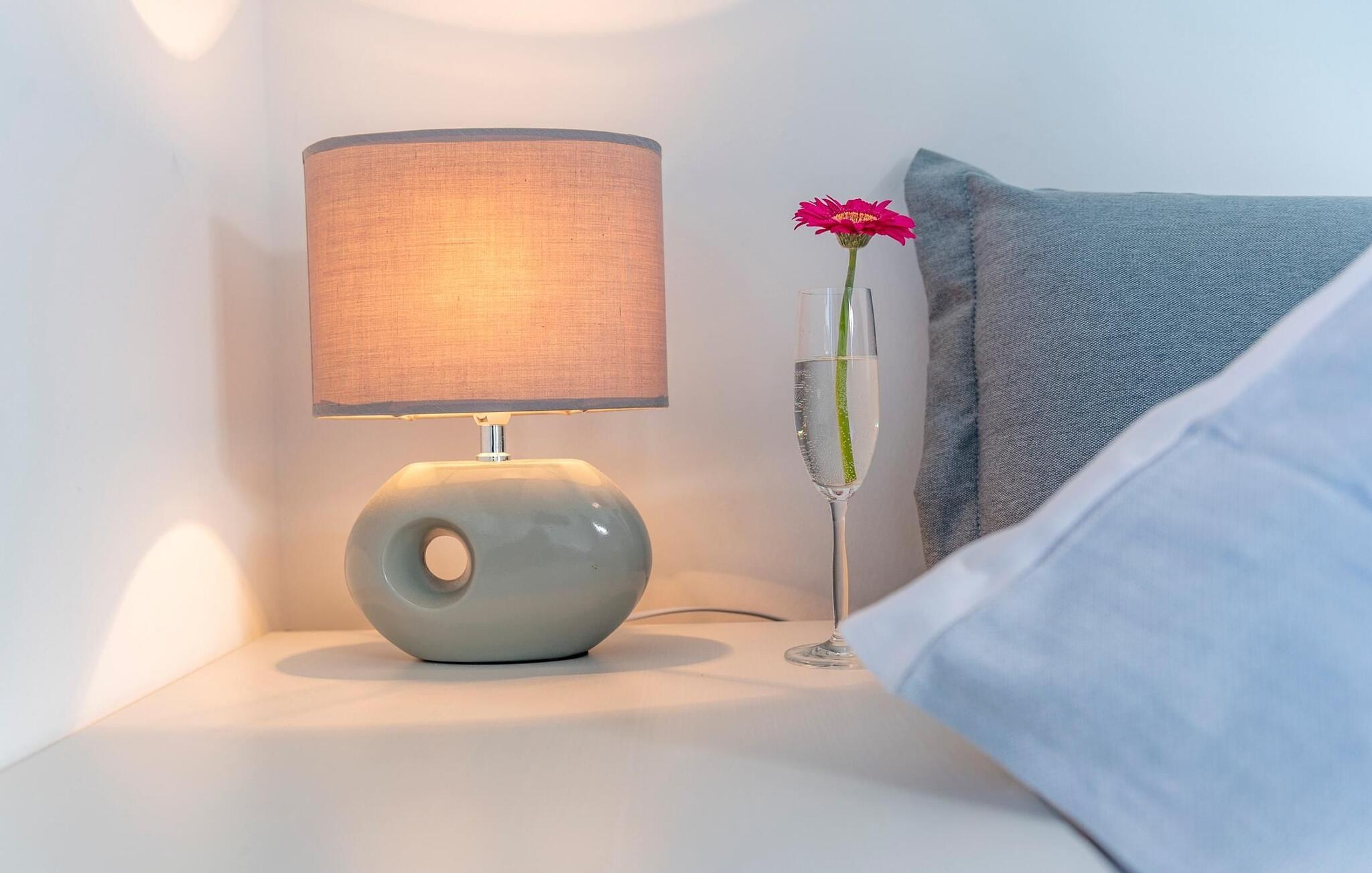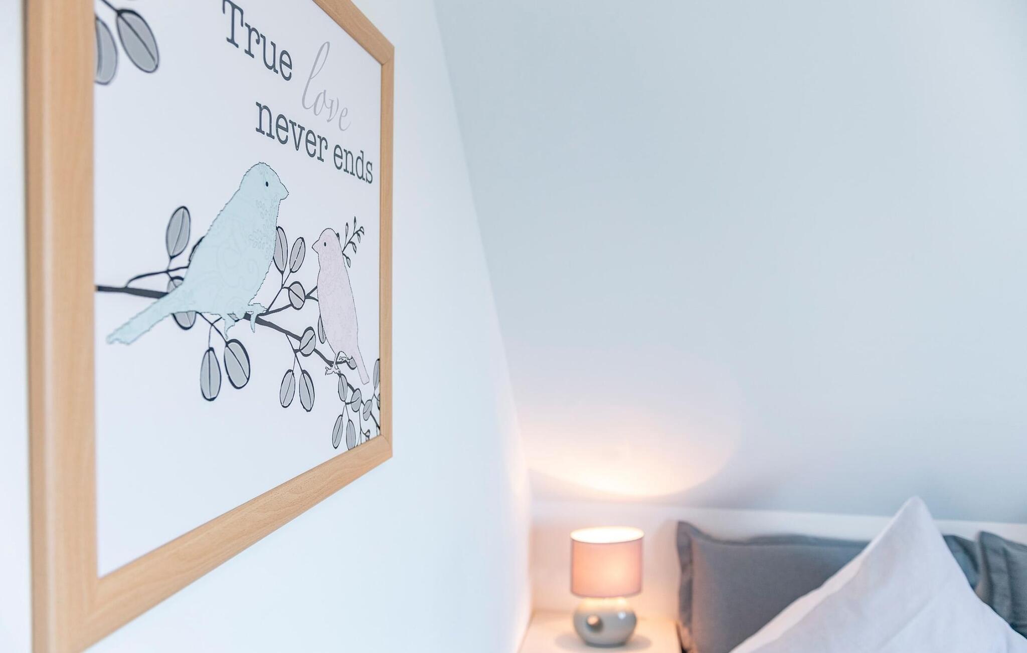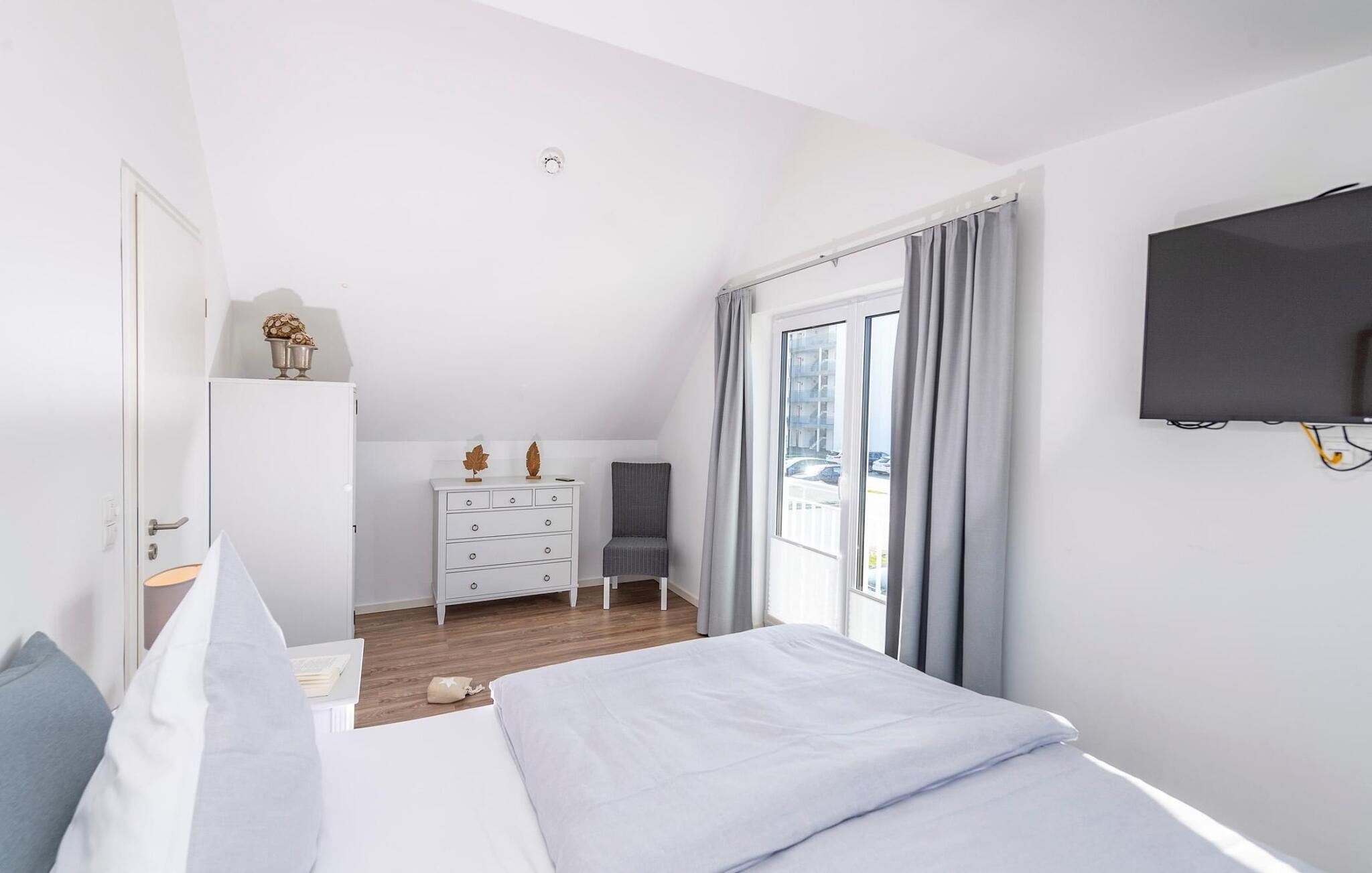 Im ersten Obergeschoss befinden sich zwei Schlafzimmer. Während das Hauptschlafzimmer mit einem traumhaften Blick auf Hafen und Ostsee überzeugt, verfügt das zweite Schlafzimmer über einen zusätzlichen Flatscreen-TV mit Home Entertainment Programm.