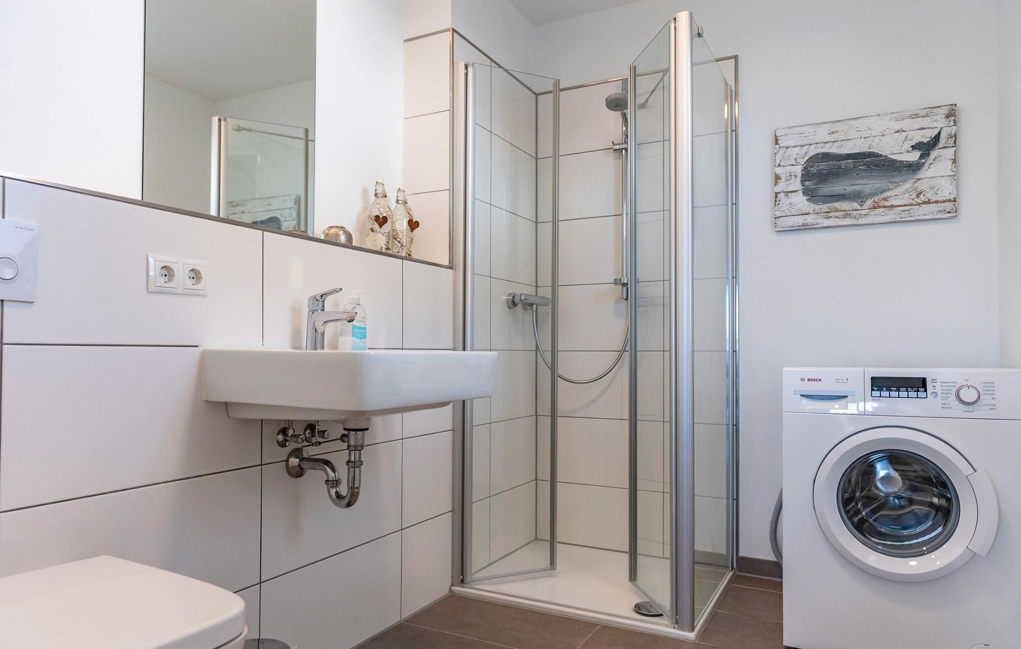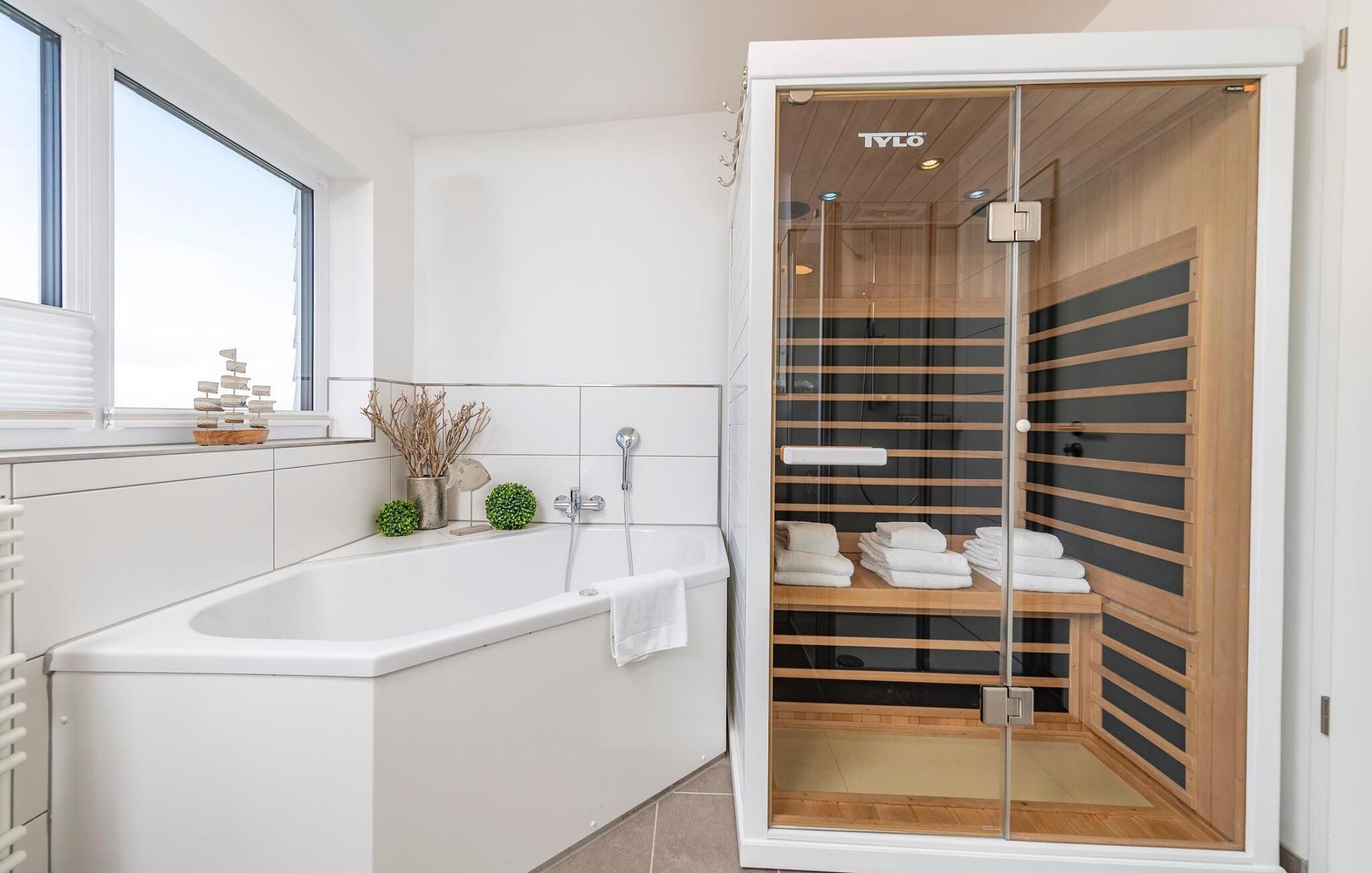 Das Ferienhaus Sommer Kajüte bietet den Luxus zweier Badezimmer, eines auf jeder Wohnebene. Wellness pur versprechen hierbei Sauna (Infrarot Wärmekabine) und Eck-Whirlwanne im ersten Obergeschoss. Ein phänomenaler Ausblick bietet sich außerdem beim Zähneputzen, denn im Spiegel eröffnen vorbeifahrende Segelschiffe vor traumhafter Kulisse neue Perspektiven. Für zusätzlichen Komfort sorgt ein Duschbad im Erdgeschoss.