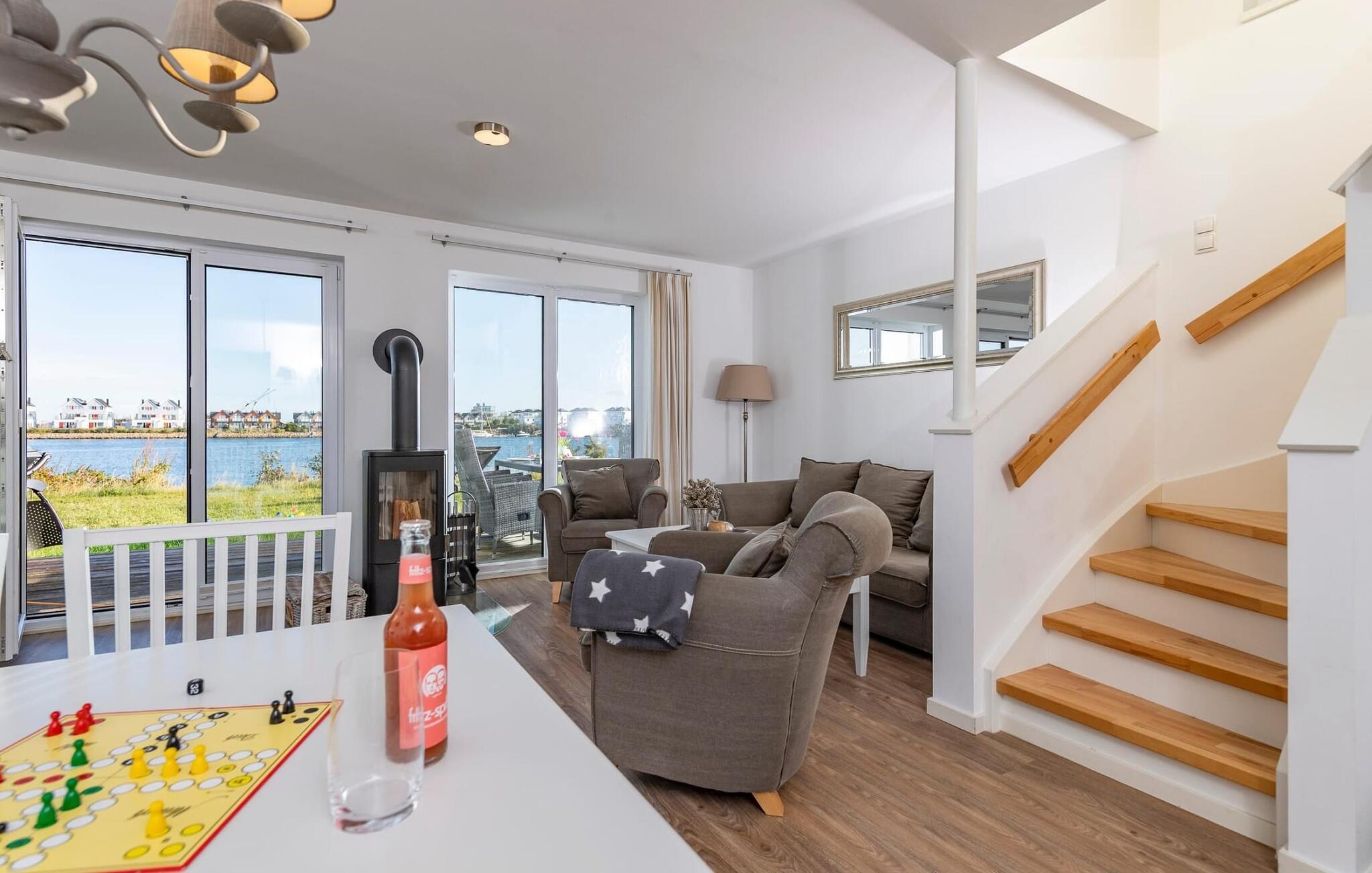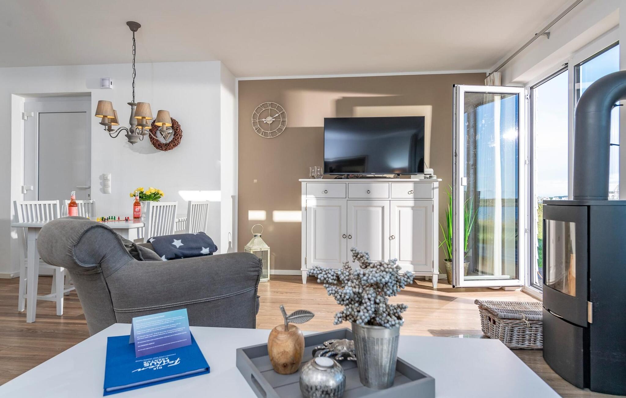 Der offen gestaltete Wohn- /Essbereich im Erdgeschoss stellt den Mittelpunkt des Hauses dar. Der direkte Meerblick lässt sich hier sowohl beim gemeinsamen Essen als auch vom Wohnzimmer aus während eines gemütlichen Kaminabends genießen. Für Entertainment sorgt außerdem der Flatscreen-TV mit Home Entertainment Programm.
