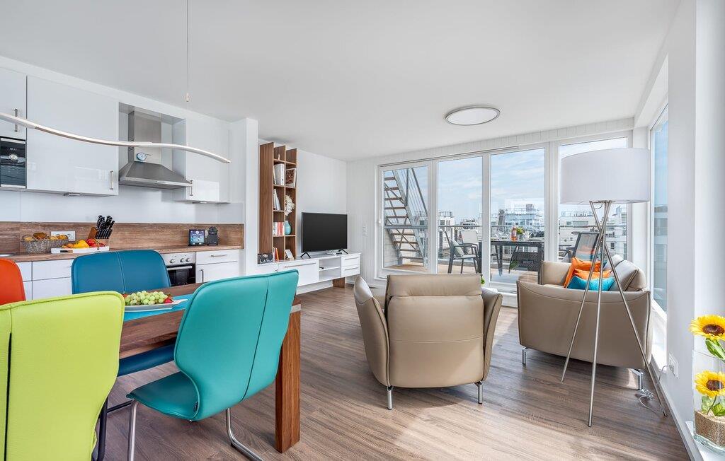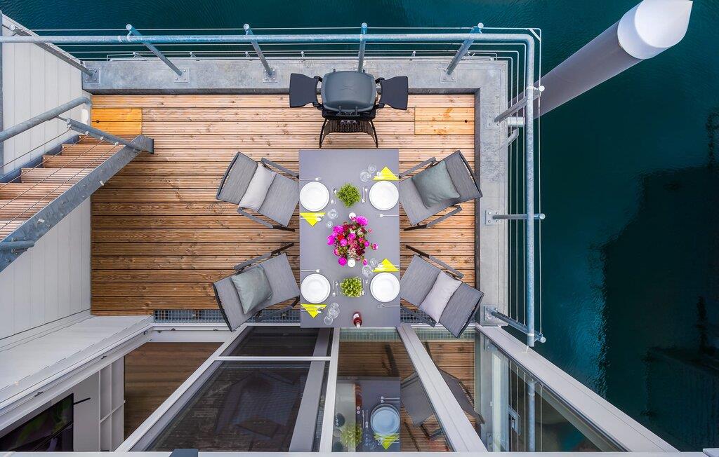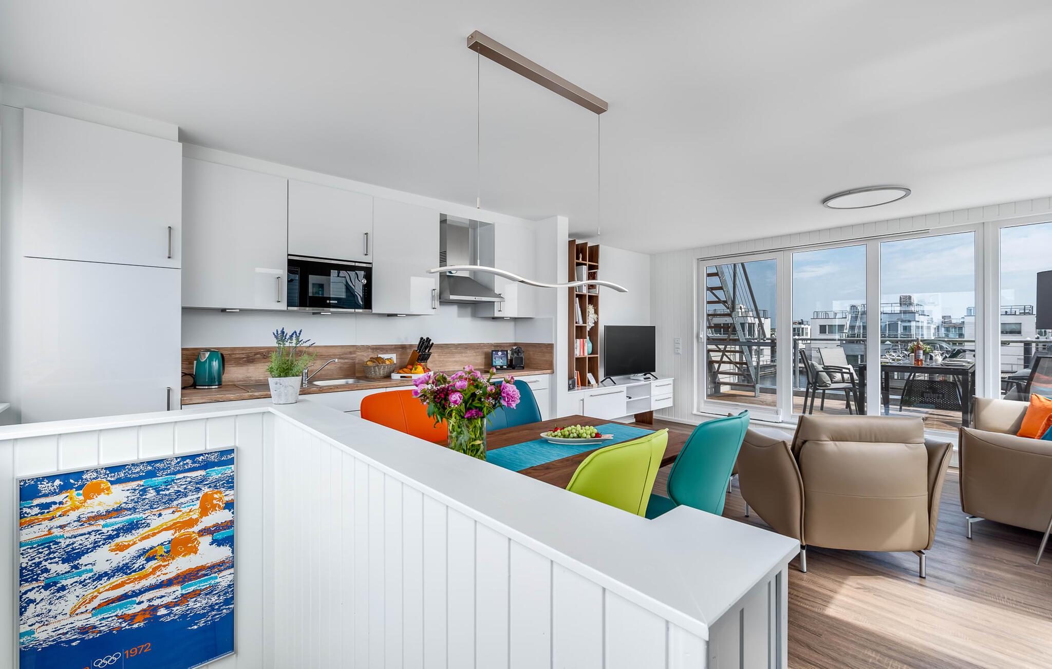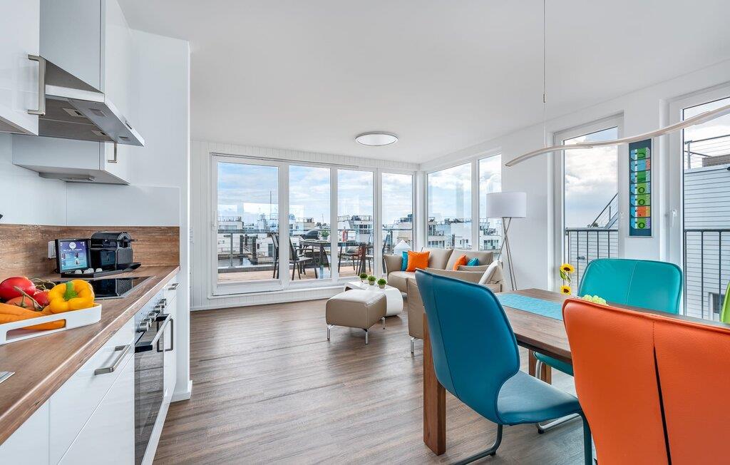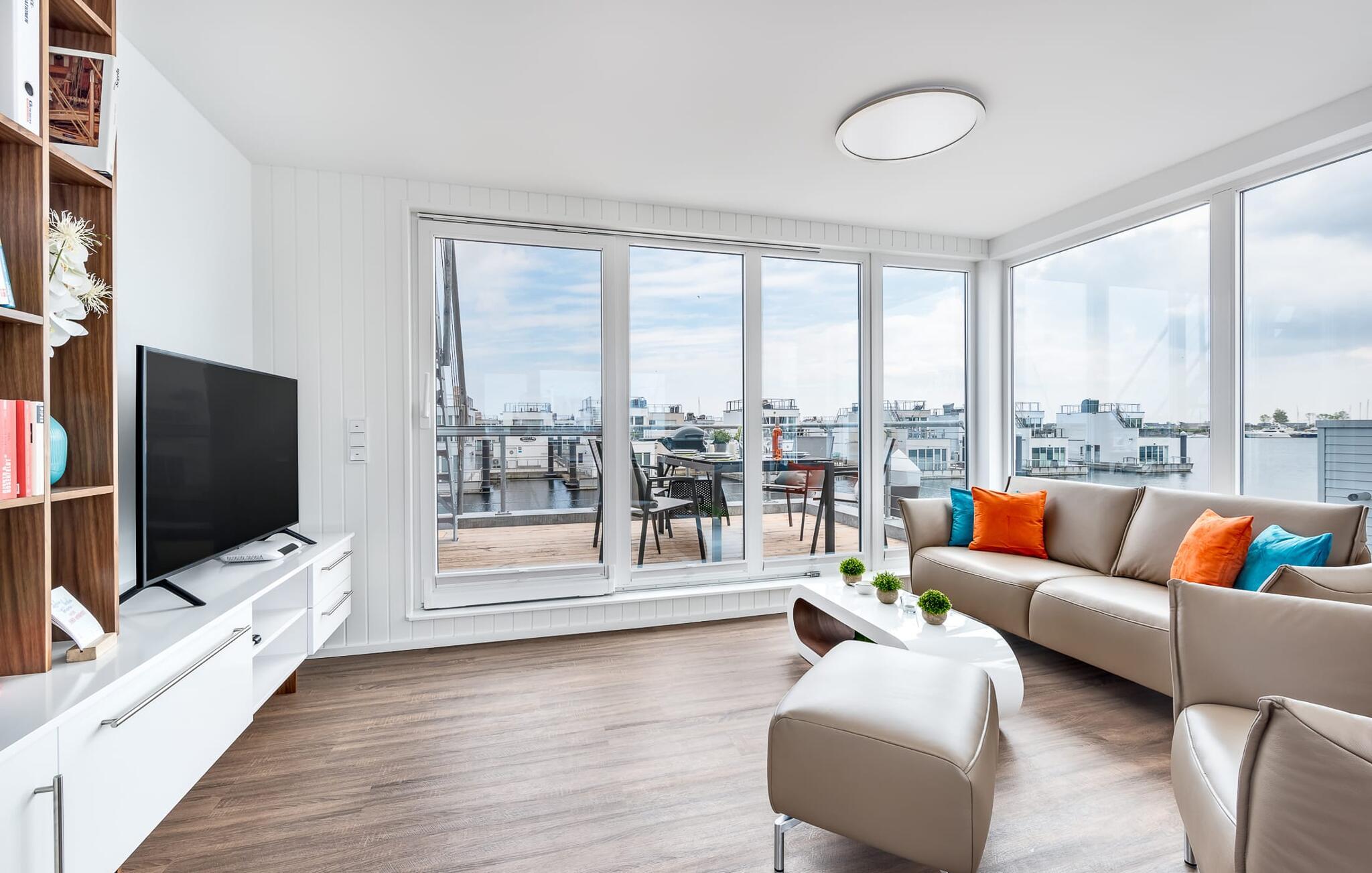 Die erste Etage empfängt ihre Gäste mit erhöhtem Blick aufs Wasser! Die bestens ausgestattete Küche mit Essplatz für 4 Personen geht nahtlos in den Wohnbereich über. Die luftige Atmosphäre wird unterstützt von stylischen und sehr gemütlichen Möbeln. Couch und Sessel laden zum Verweilen ein. Und wenn das Hafenkino nicht ausreicht, steht auch hier ein Fernseher mit Magenta TV sowie ein Internetradio bereit. Die an den Wohnbereich anschließende Terrasse ist mit einem großen Gartentisch und vier bequemen Stühlen bestens gerüstet für ein ausgiebiges Frühstück in der Morgensonne oder einen schönen Grillabend.