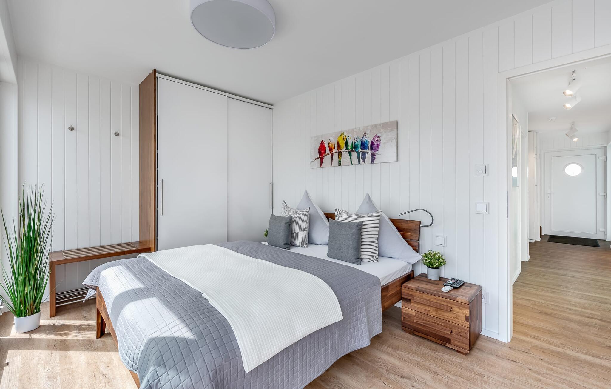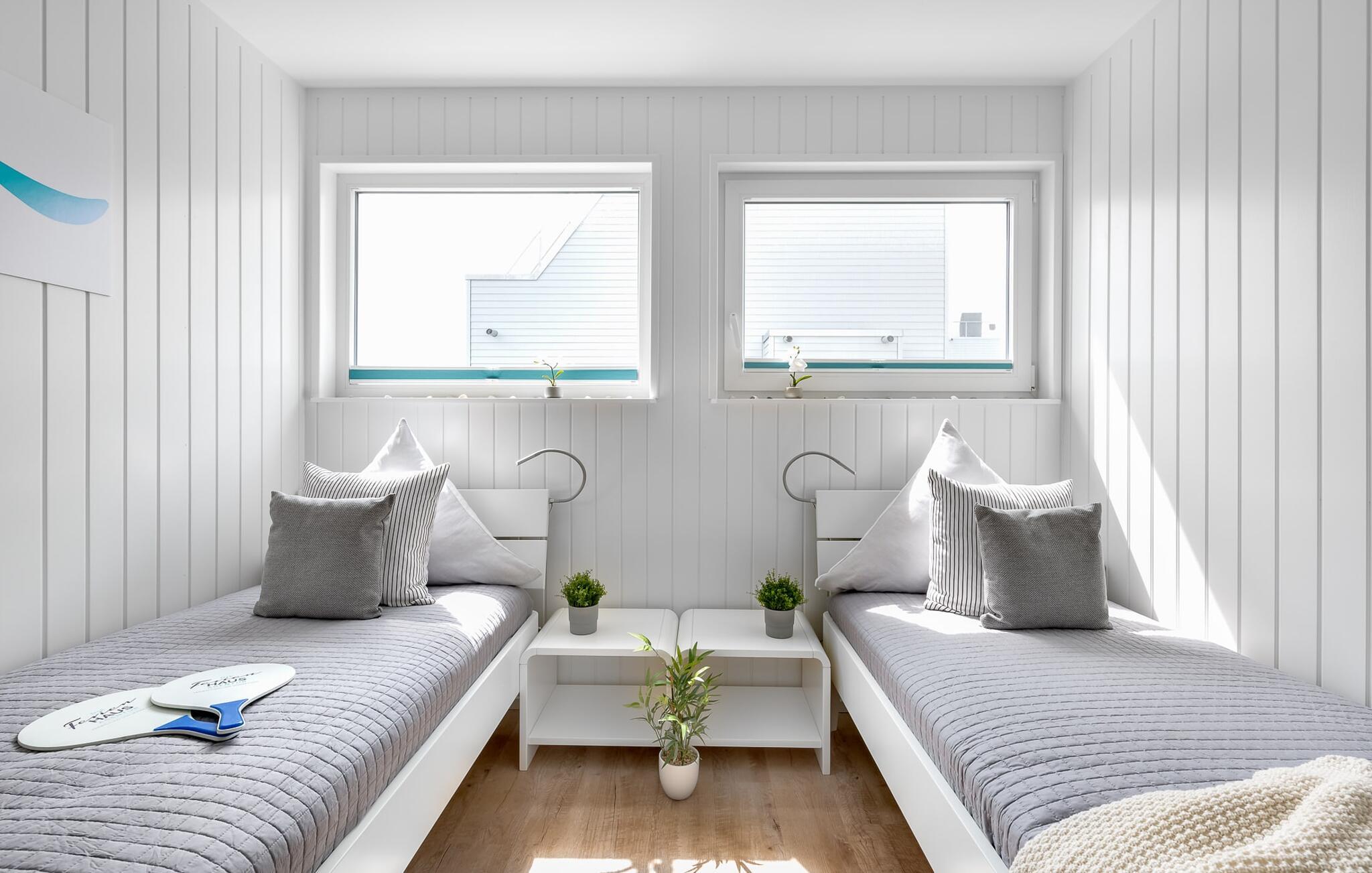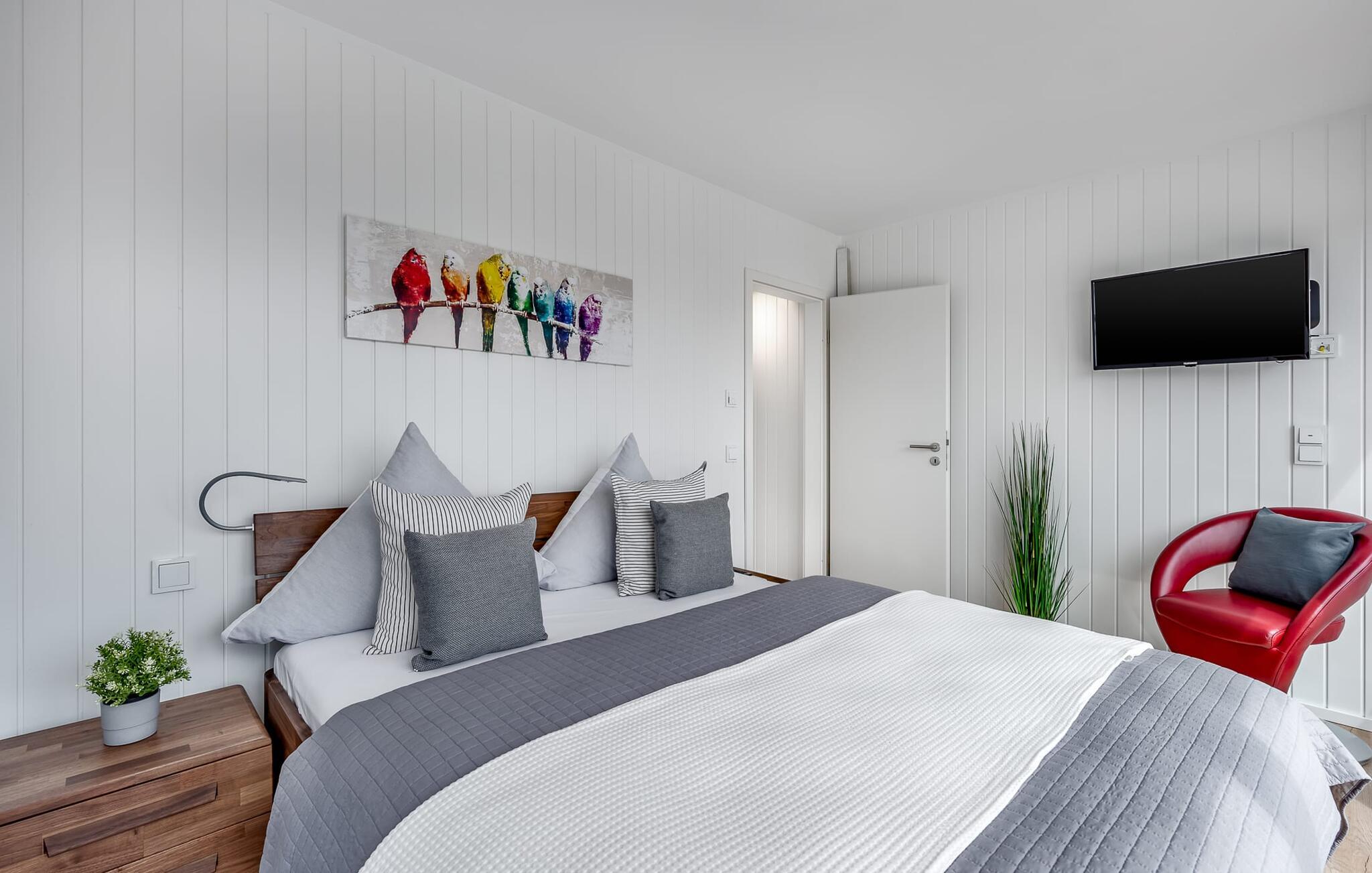 Im ersten Schlafzimmer erwartet euch ein bequemes Doppelbett mit einer Liegefläche von 1,60 x 2,00 m, von dem ihr aus im Liegendank der bodentiefen Fenstervöllig entspannt aufs Wasser und in den Himmel schauen könnt. Im zweiten Schlafzimmer findet ihr zwei Einzelbetten vor. In beiden Schlafzimmern steht euch jeweils ein Fernseher zur Verfügung. Einbauschränke mit Kofferablagen und ausreichend Haken bieten viel Stauraum. Verfolgt die leichten Wellen auf der rundum laufenden Terrasse direkt von der Liege aus. Näher an der Ostsee geht nicht!