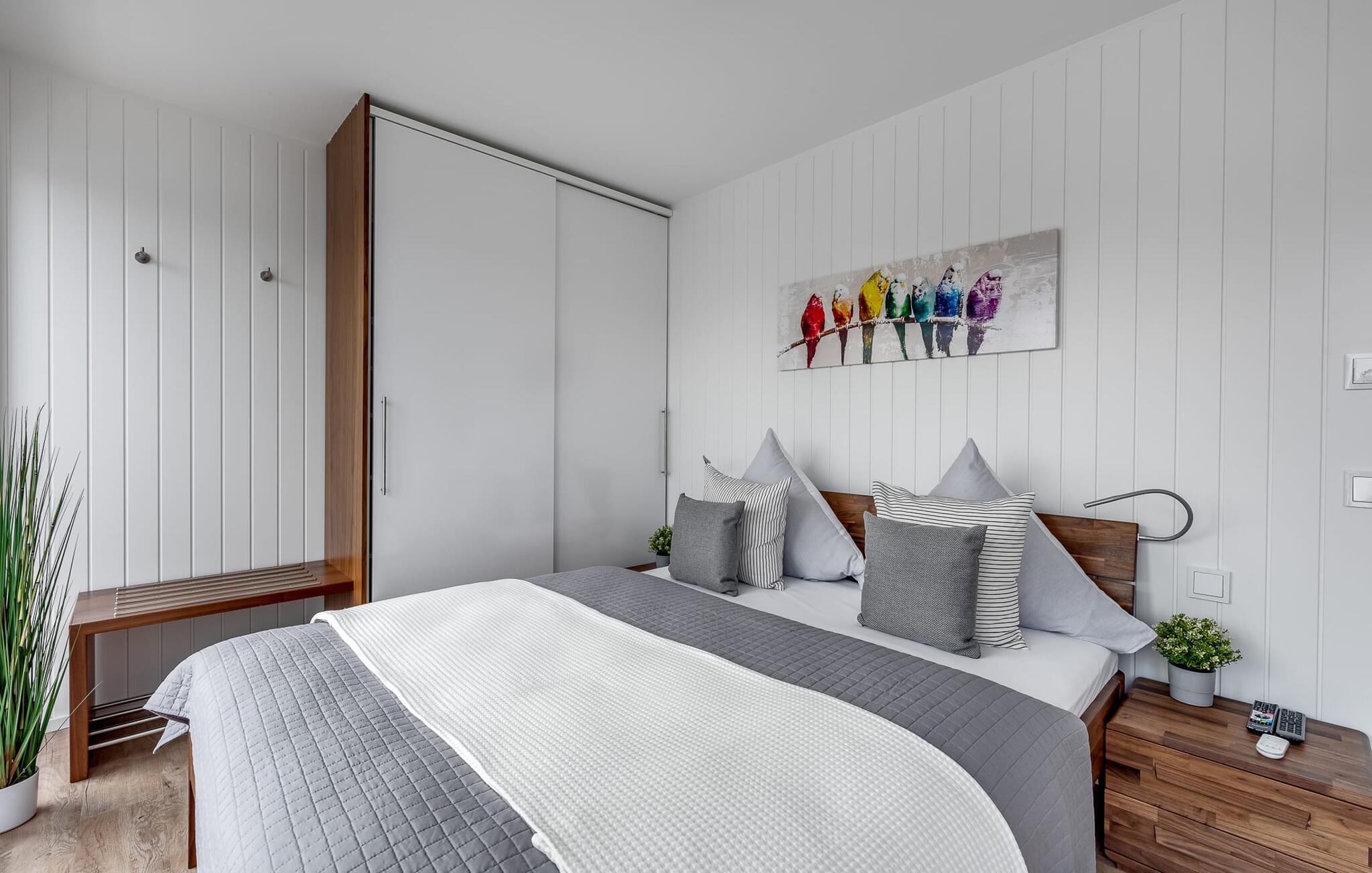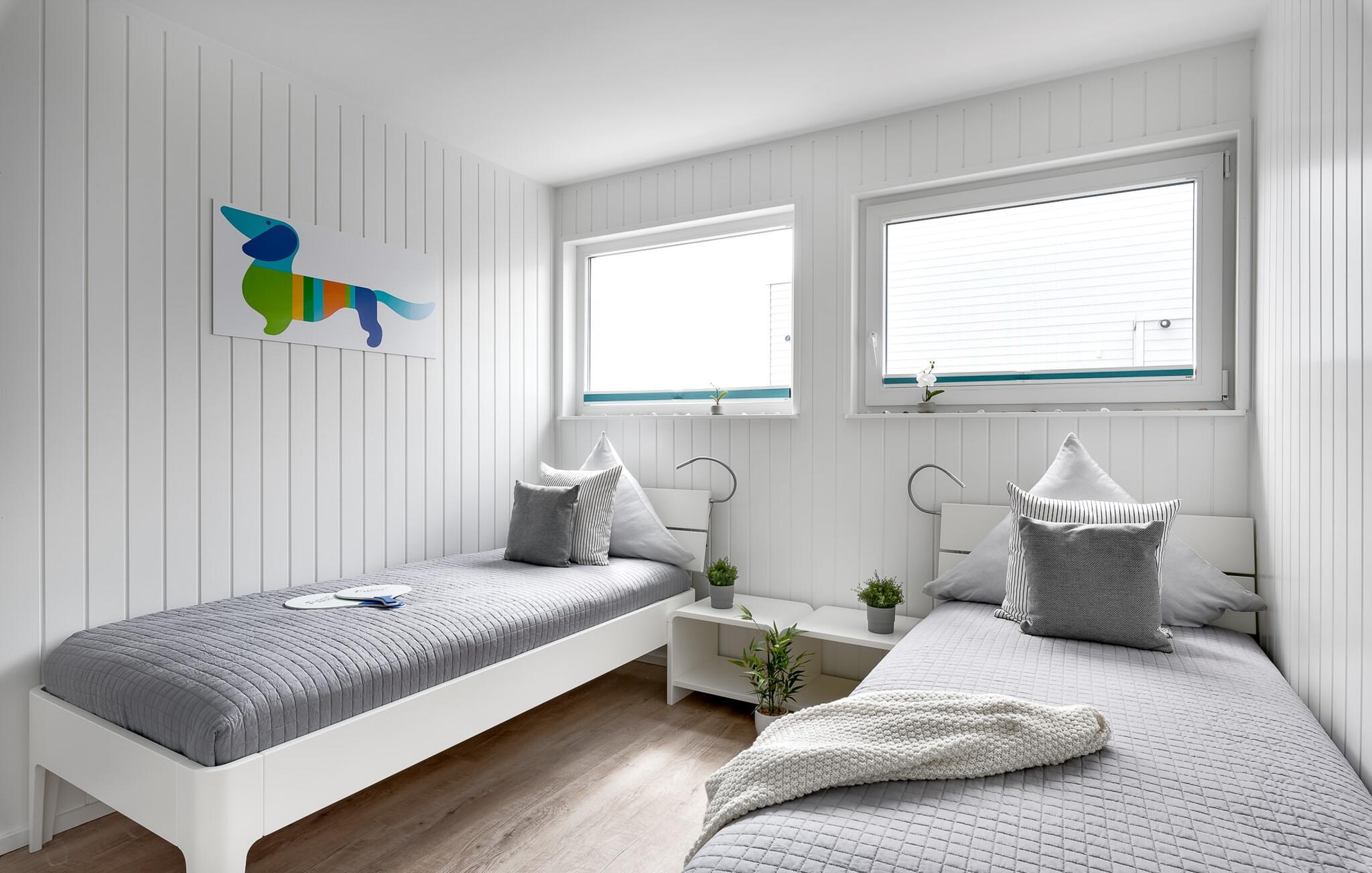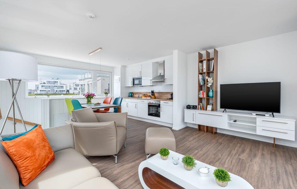 Im ersten Schlafzimmer erwartet euch ein bequemes Doppelbett mit einer Liegefläche von 1,60 x 2,00 m, von dem ihr aus im Liegendank der bodentiefen Fenstervöllig entspannt aufs Wasser und in den Himmel schauen könnt. Im zweiten Schlafzimmer findet ihr zwei Einzelbetten vor. In beiden Schlafzimmern steht euch jeweils ein Fernseher zur Verfügung. Einbauschränke mit Kofferablagen und ausreichend Haken bieten viel Stauraum. Verfolgt die leichten Wellen auf der rundum laufenden Terrasse direkt von der Liege aus. Näher an der Ostsee geht nicht!