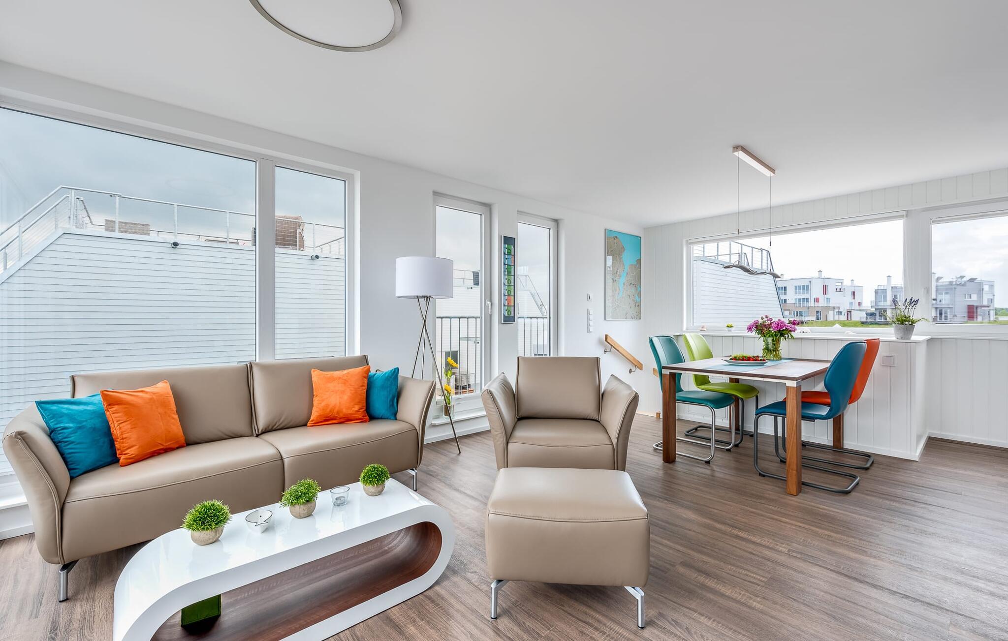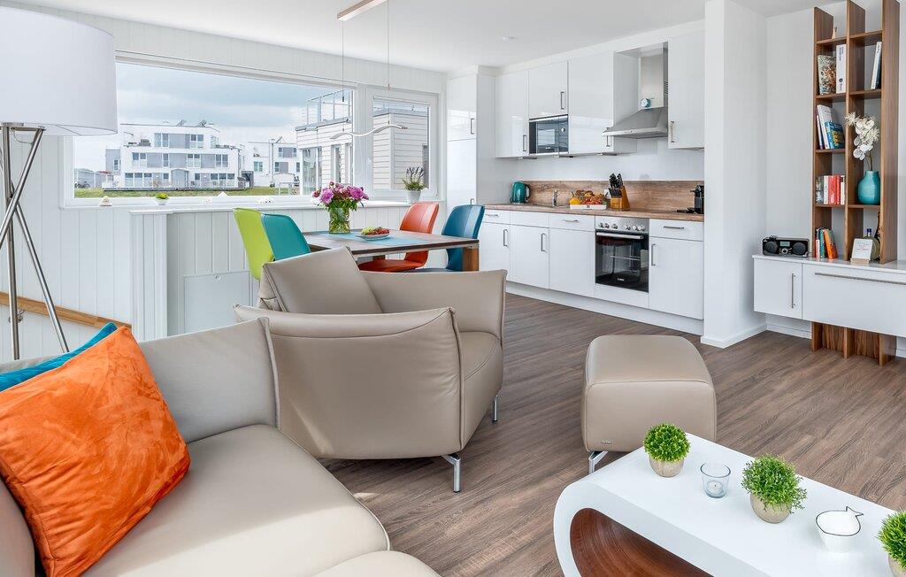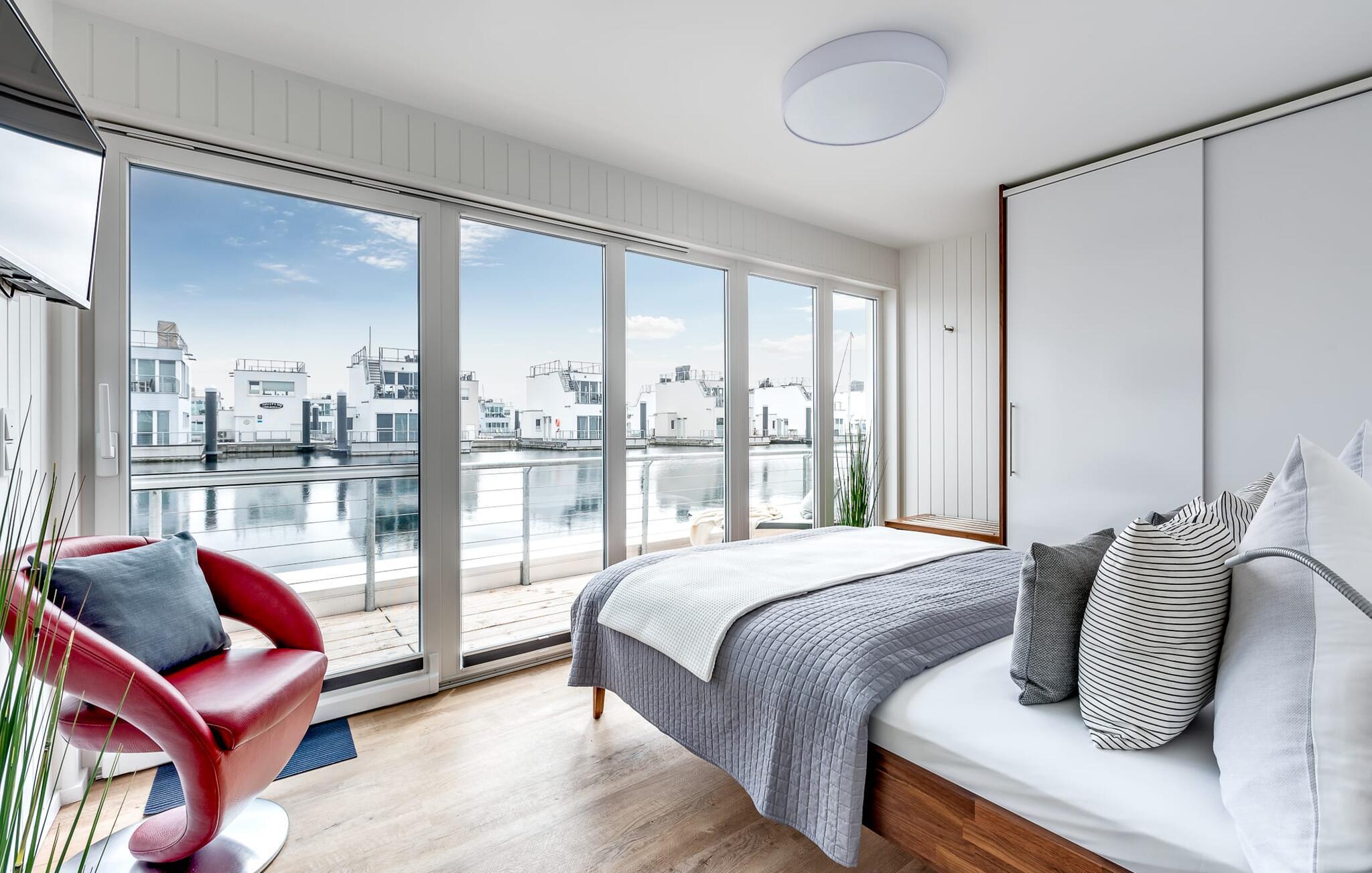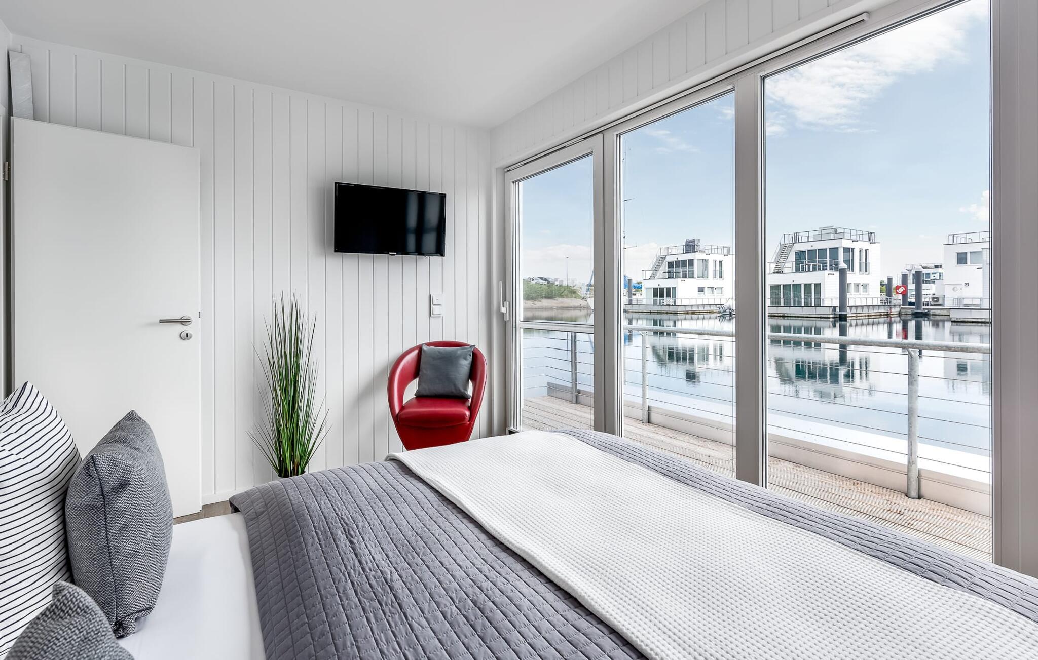Das exklusive schwimmende Ferienhaus Sommer72 am OstseeResort Olpenitz bietet modernen Komfort und einen traumhaften Meerblick.