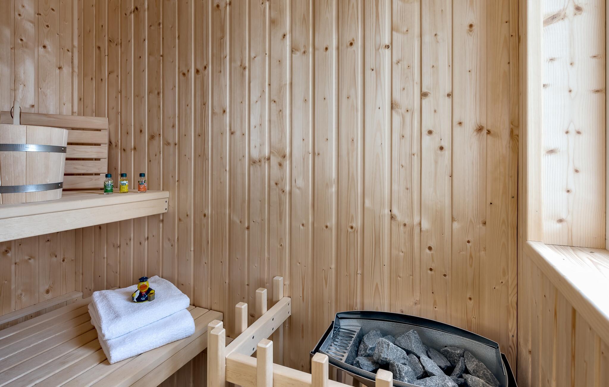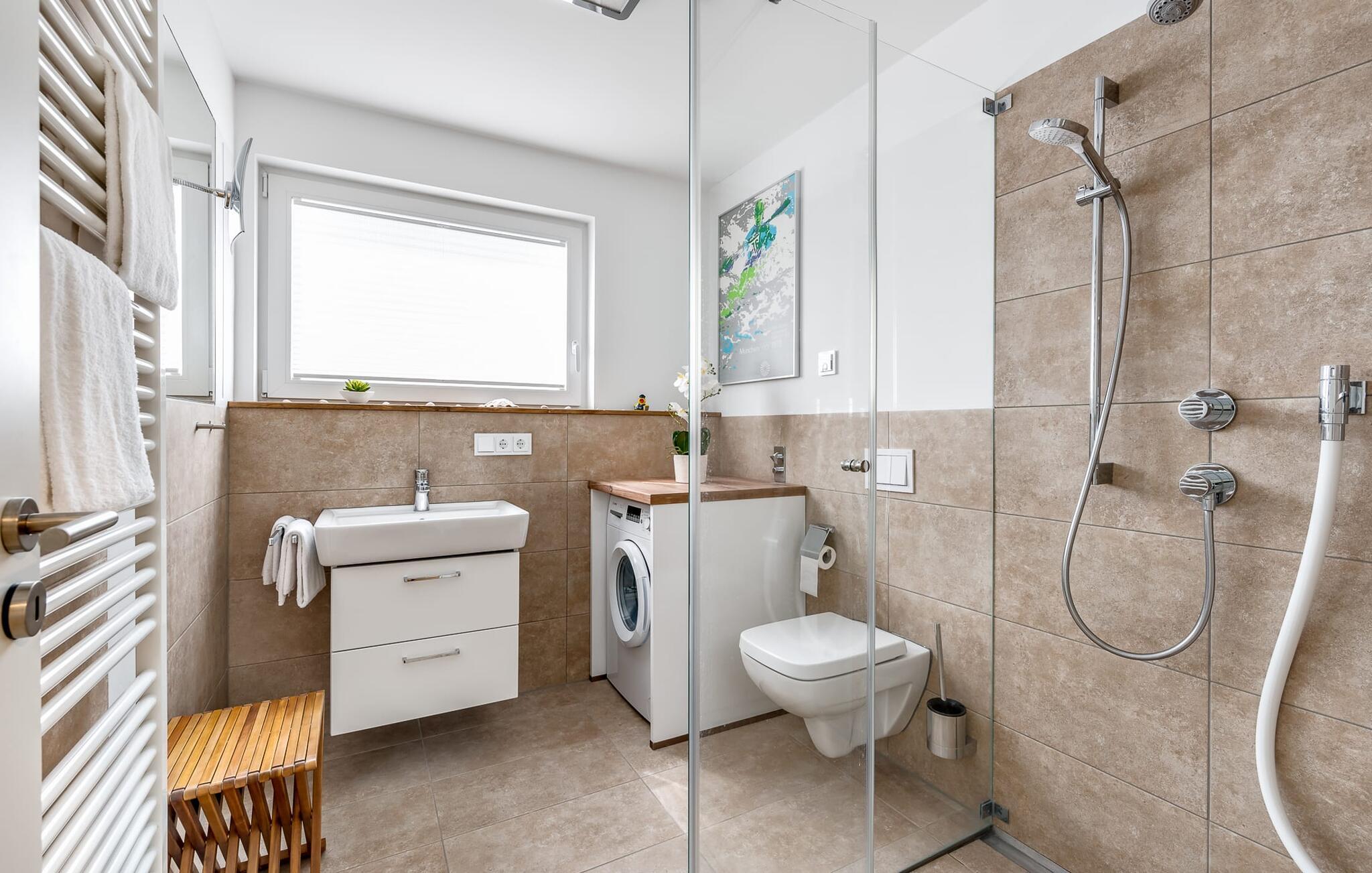 So sportiv es auch klingt, man muss nicht sportbegeistert sein, um sich in dieser exklusiven Ferienwohnung wohlzufühlen. Dafür sorgen u.a. eine Sauna mit Blick aufs Wasser sowie im geräumigen Badezimmer eine bodengleiche Dusche mit Hand- und Kopfbrause und Kneippschlauch.