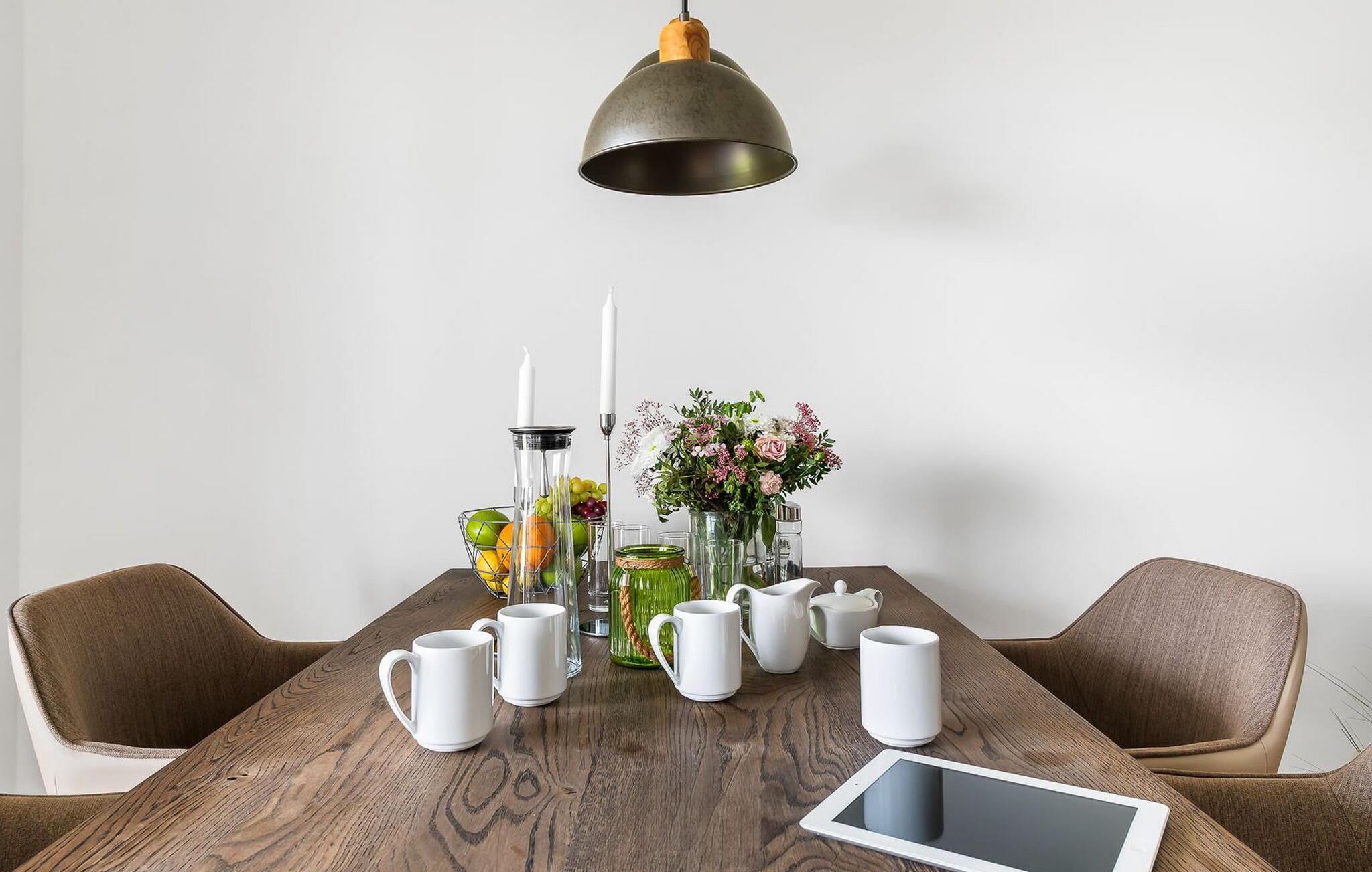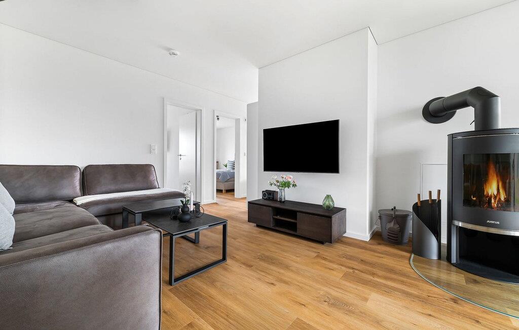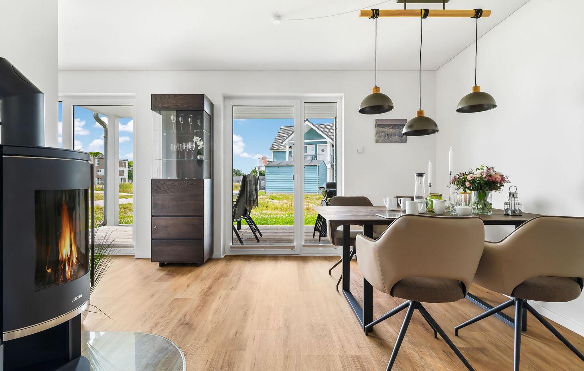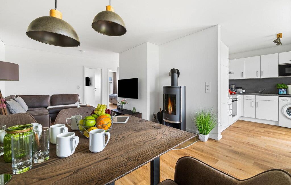 Der offene Wohn-/Essbereich ist das Herz der Wohnung. Hier können auf der Wohnlandschaft oder am Esstisch zahlreiche entspannende Urlaubsstunden verbracht werden. An nordischeren Tagen sorgt der Kamin für gemütliche Stimmung. Macht es euch bequem und genießt euren Urlaub in der Schleiregion.