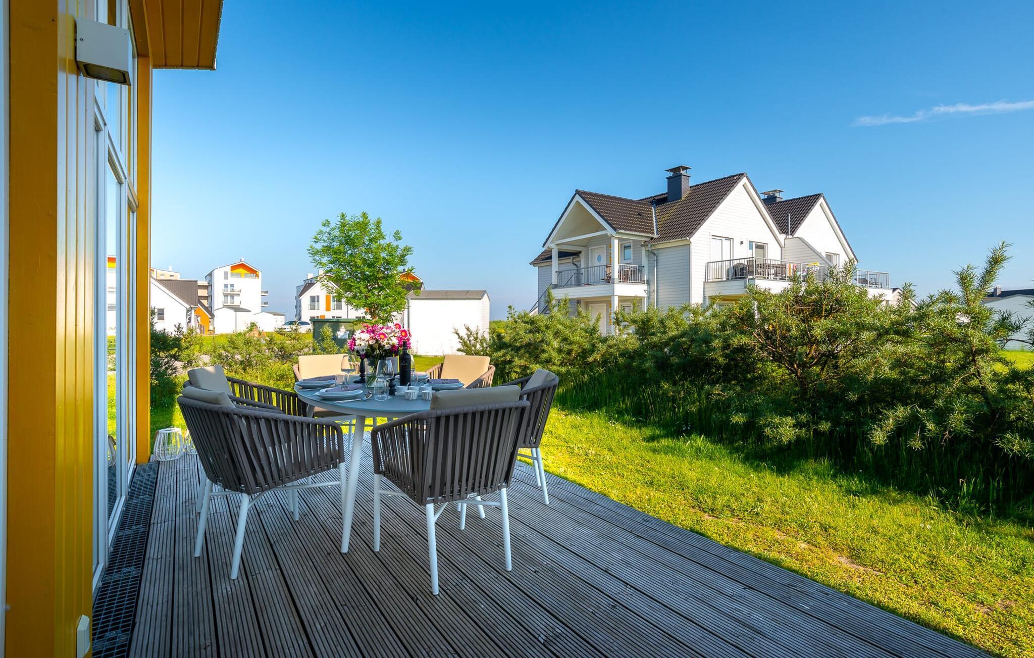 Von der hochwertig und komplett ausgestatteten hellen Küche hat man Zugang zur nach Südwesten ausgerichteten Holzterrasse. Hier laden ein Grill, moderne Gartenmöbel und ein Sonnenschirm zu unbeschwerten Stunden im Freien ein. Vor Wind und neugierigen Blicken schützen Sanddornhecken.