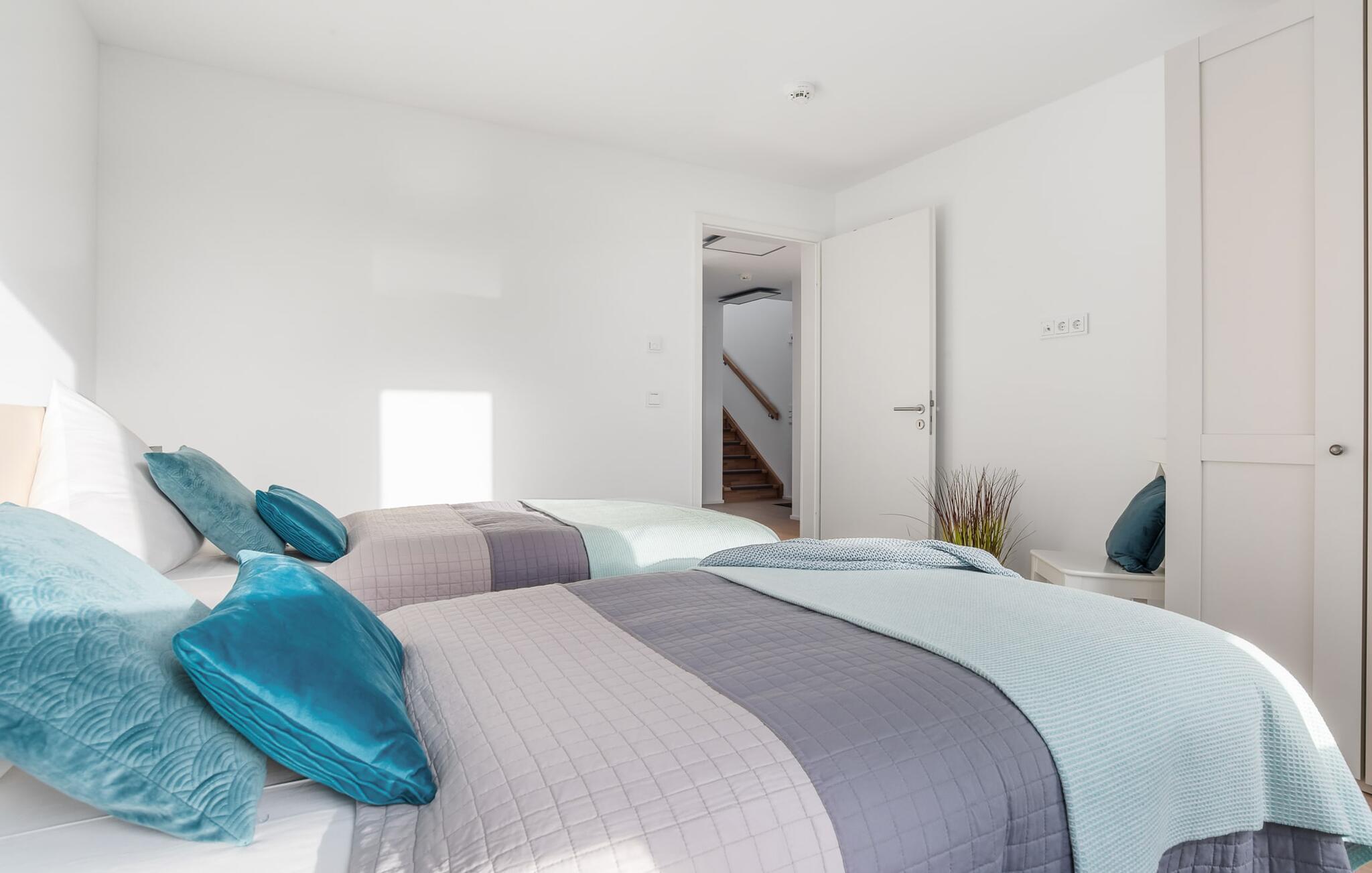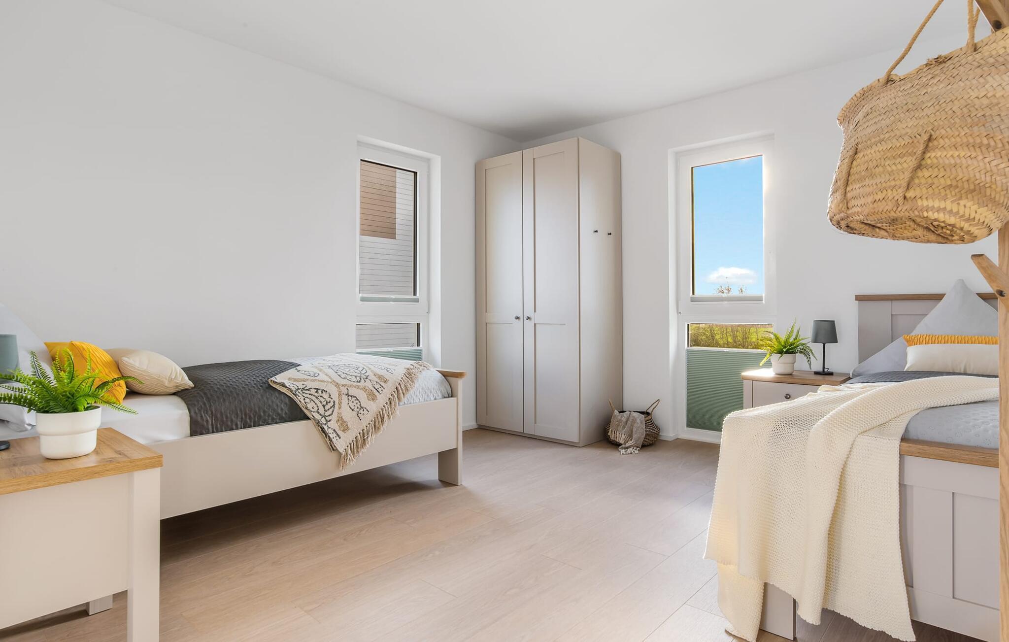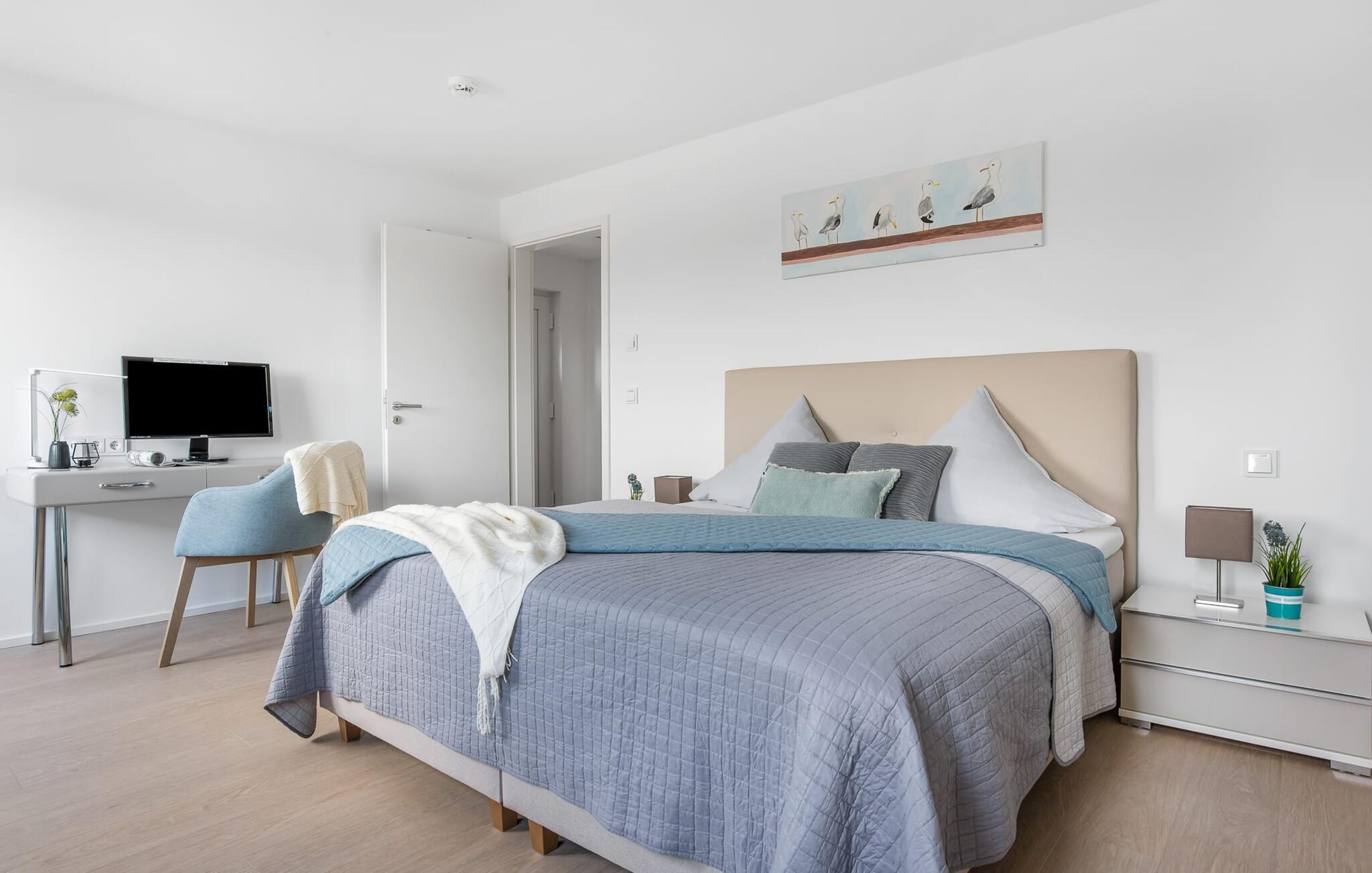 Im Hauptschlafzimmer lädt ein großes Doppelbett zum Träumen ein. Falls die ein oder andere Kleinigkeit im Urlaub abgearbeitet werden soll, ist dies hier bequem möglich, da ihr einen großen Schreibtisch mit zusätzlichem Monitor vorfindet. Des Weiteren steht euch ein Schlafzimmer mit einem kleinen Doppelbett zur Verfügung. Das dritte Schlafzimmer lädt mit zwei Einzelbetten zu erholsamen Nächten ein.