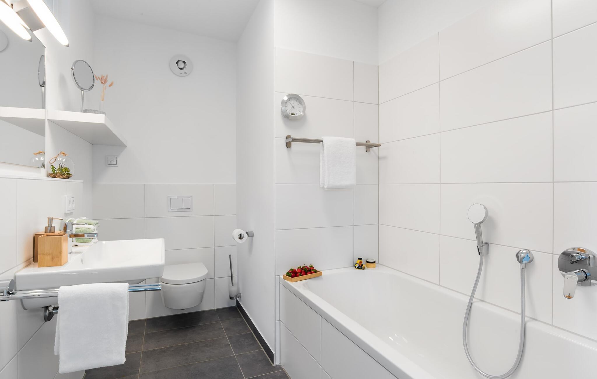 Die integrierte Küche ist perfekt ausgestattet und gemeinsames Kochen macht viel Spaß. Die fertigen Leckereien dann auf der Terrasse genießen oder einen geselligen Grillabend einläuten… Das ist Urlaub pur. Direkt vom Wohnbereich aus betretet ihr die große Terrasse mit Süd-West-Ausrichtung. Nach hinten ausgerichtet mit Blick auf die Naturschutz-Salzwiesen, Felder und gen Meer sind gemütliche Stunden vorprogrammiert. Ein zweites Vollbad mit Badewanne rundet das Komplettpaket für einen erholsamen Urlaub ideal ab.