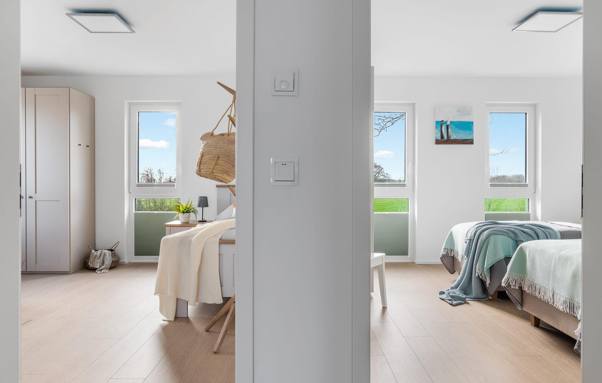 Beim Betreten der Ferienwohnung im ersten Obergeschoss, beginnt vom ersten Moment an die Entschleunigung. Ihr befindet euch direkt im Ruhebereich von SOMMERWIND. In dieser Etage befinden sich die drei Schlafzimmer der Wohnung. Egal für welches Schlafzimmer ihr euch entscheidet, erholsamer Schlaf ist euch sicher. Jedes der Schlafzimmer ist mit einem Fernsehr ausgestattet.
