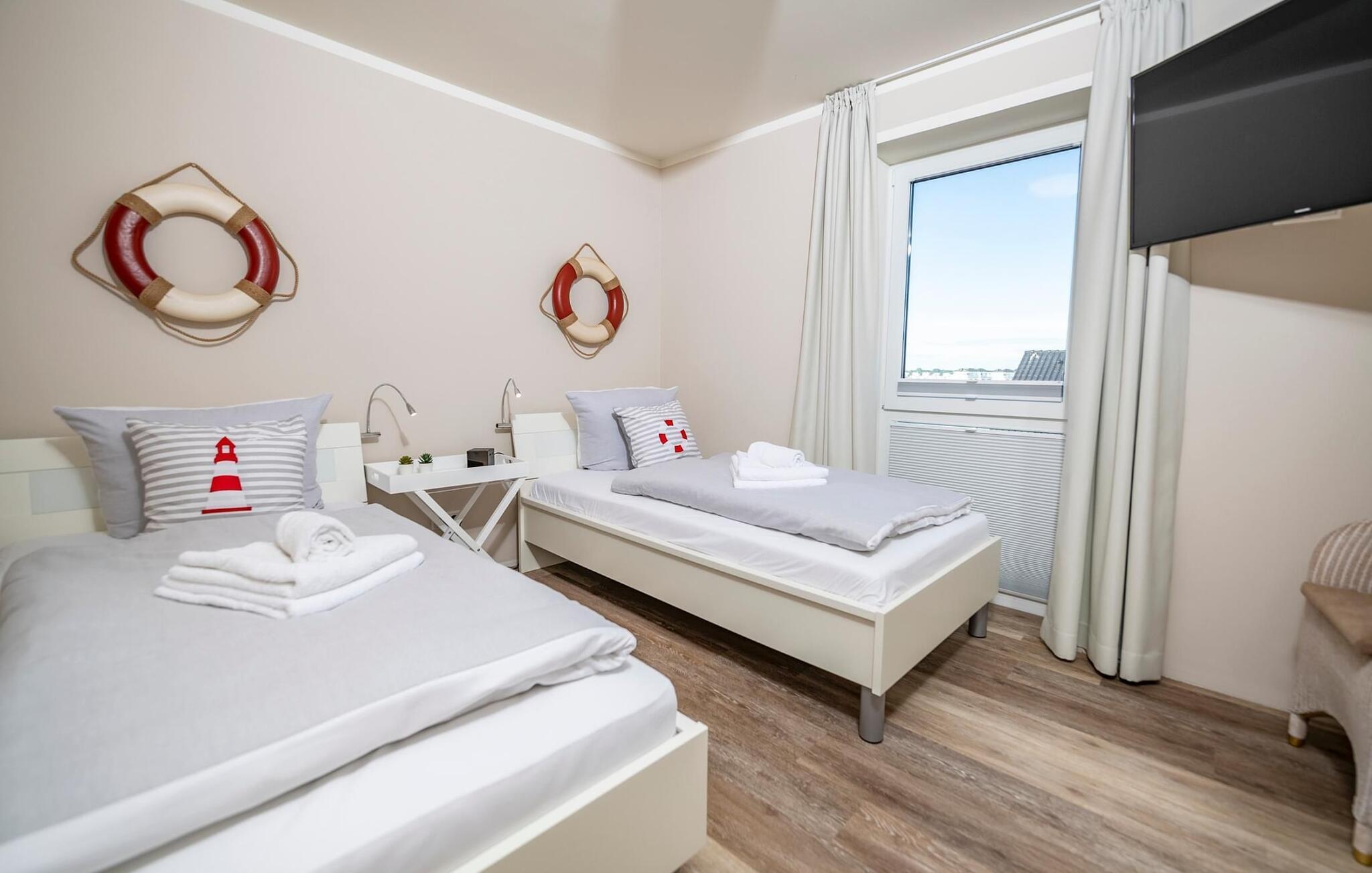 Das voll ausgestattete Badezimmer mit bodengleicher Dusche sorgt für maritime Wellnessmomente, denn in der Sauna mit Wasserblick lässt es sich tiefenentspannen.