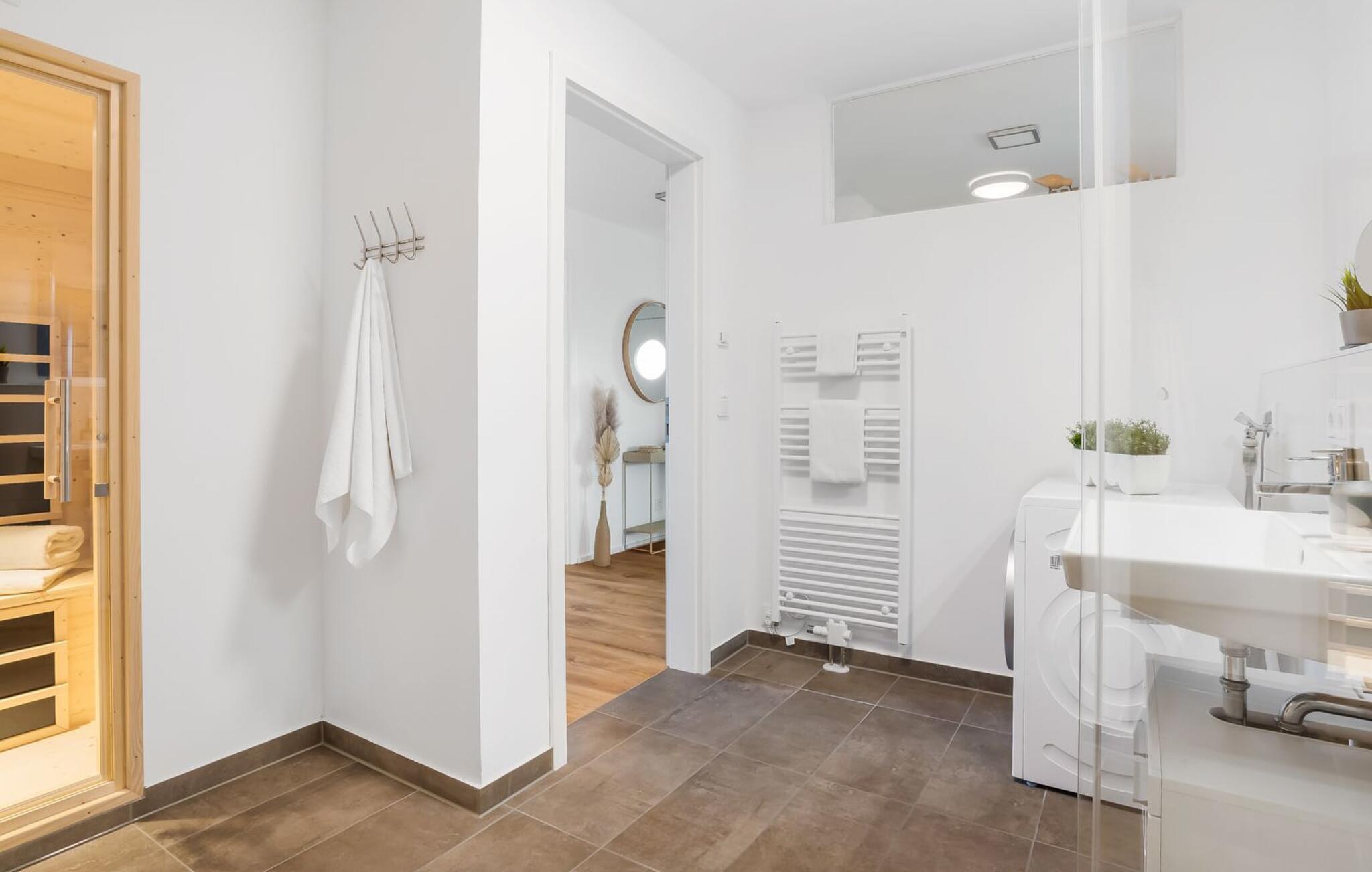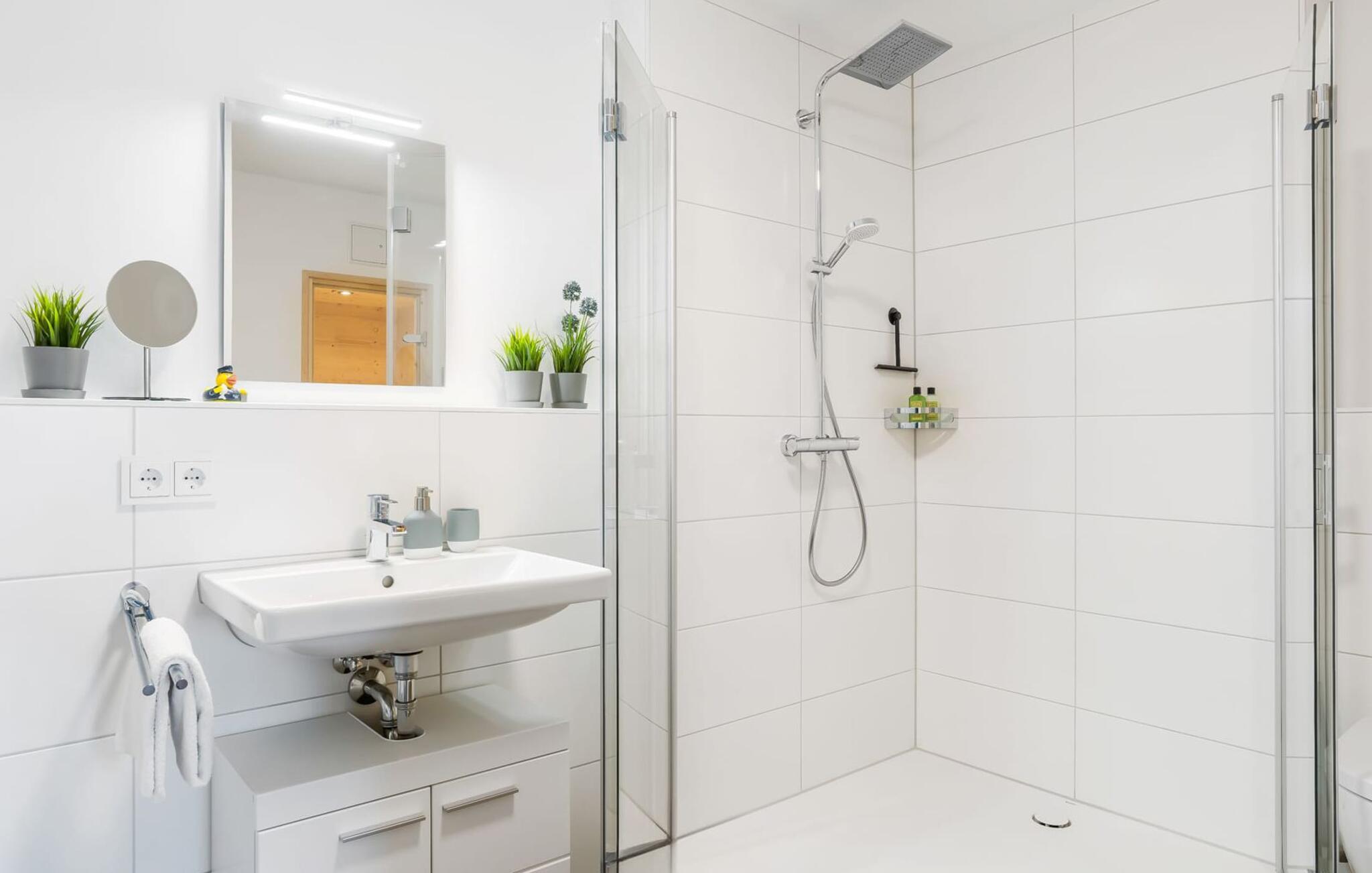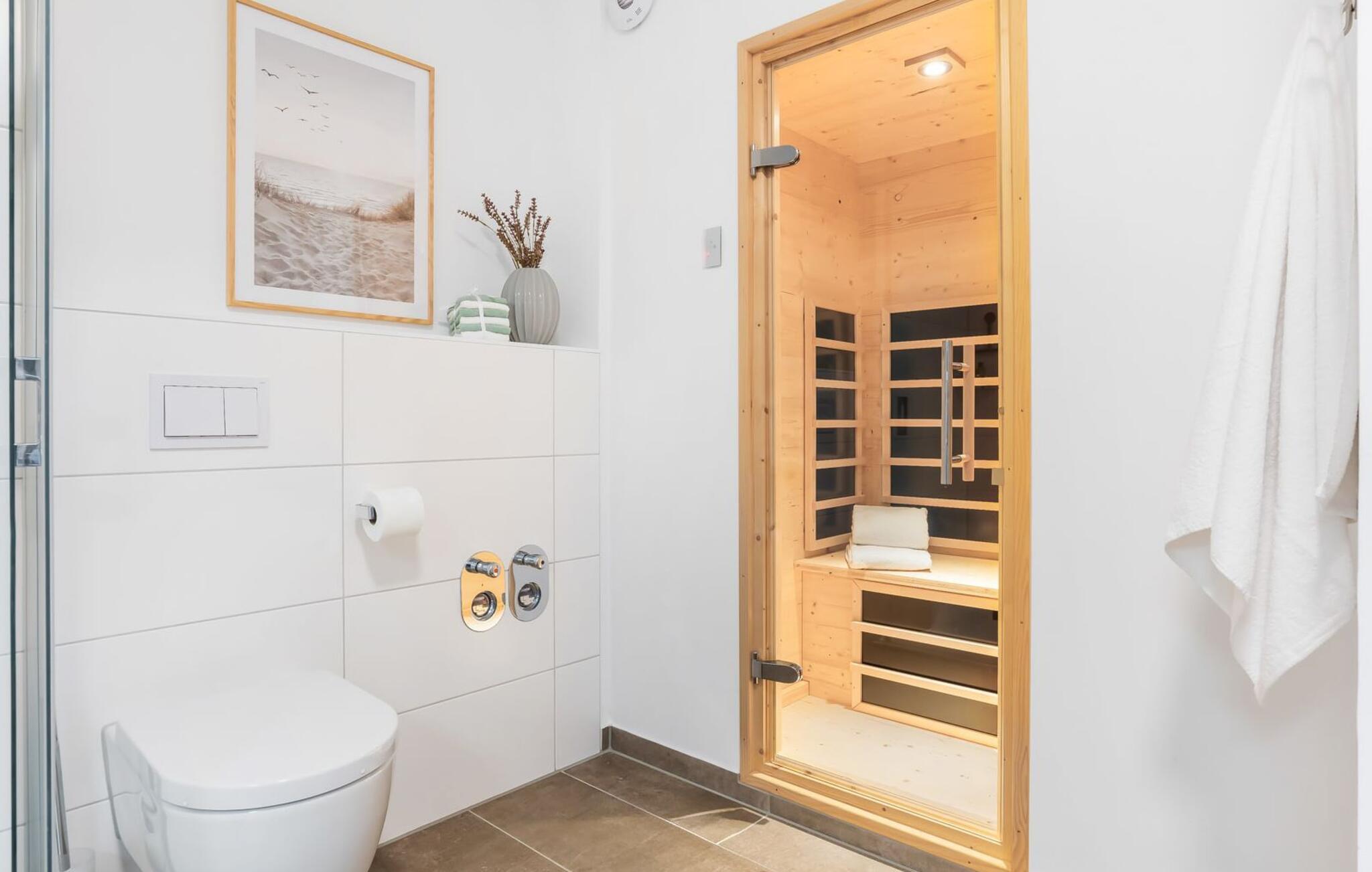 Das Duschbad mit großer Regendusche und Infrarot-Sauna sorgt für unvergessliche Wellnessmomente, von denen ihr noch lange zehren könnt.