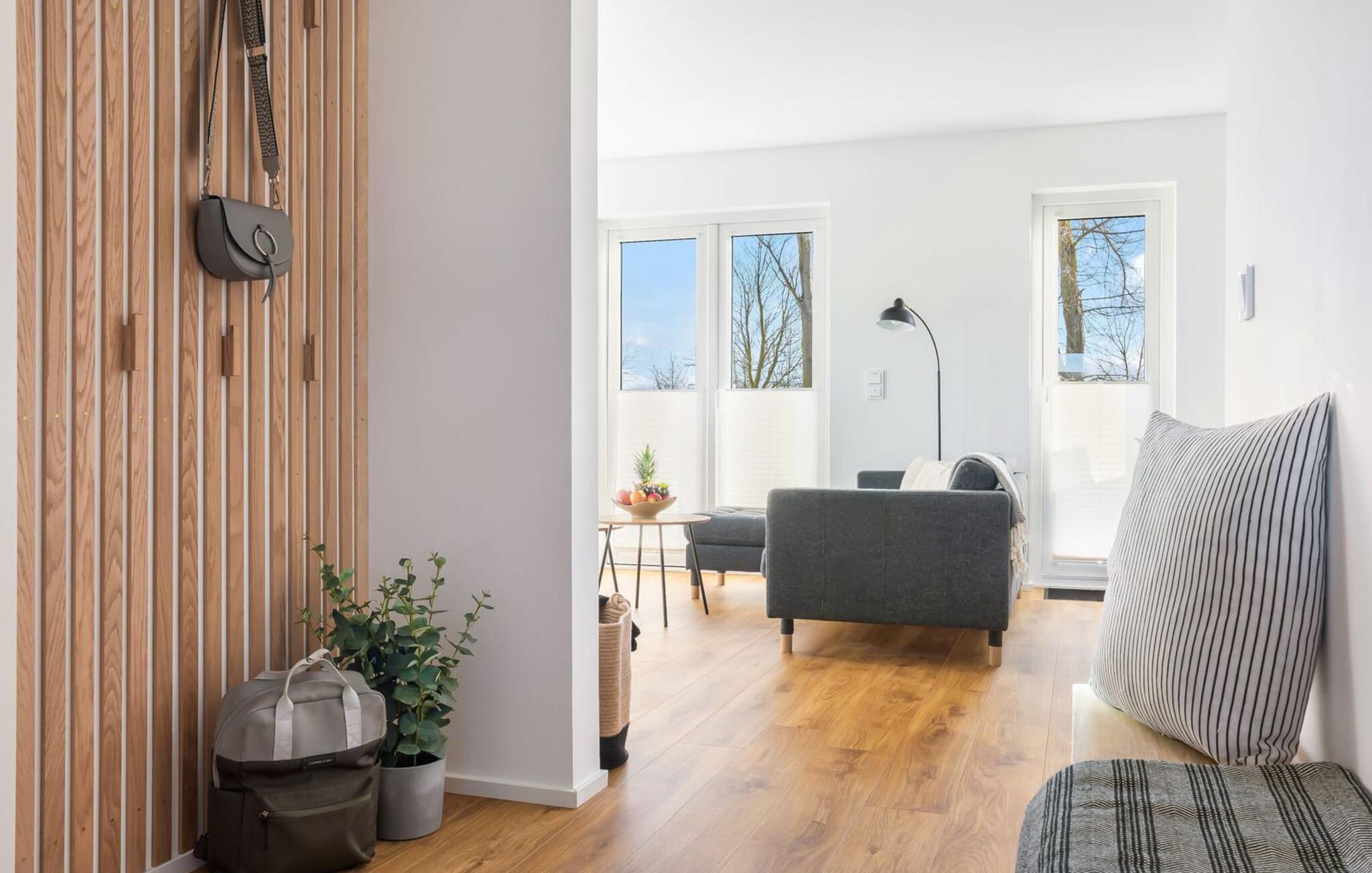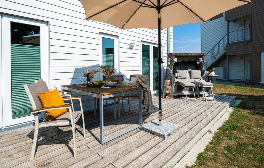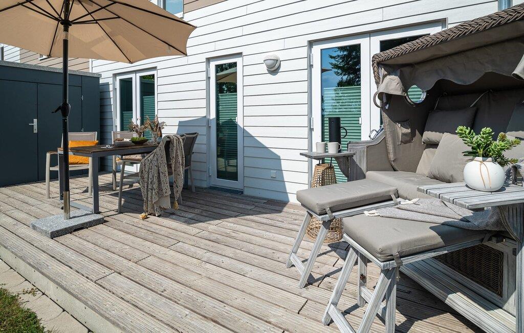 Moderne Ferienlounge mit Terrasse und Blick auf Naturschutzgebiete im OstseeResort Olpenitz.