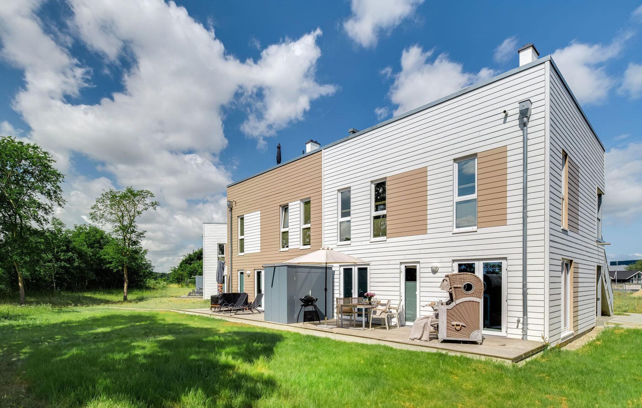 Moderne Erdgeschoss-Ferienlounge mit Blick auf Naturschutzgebiet und kostenlosem Strandkorb am OstseeResort Olpenitz.