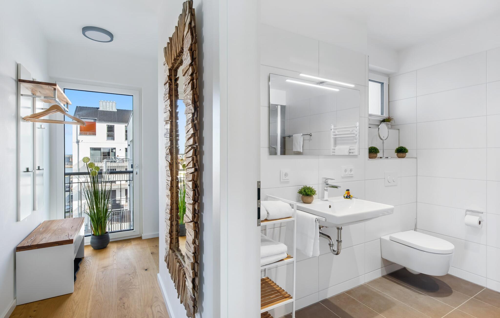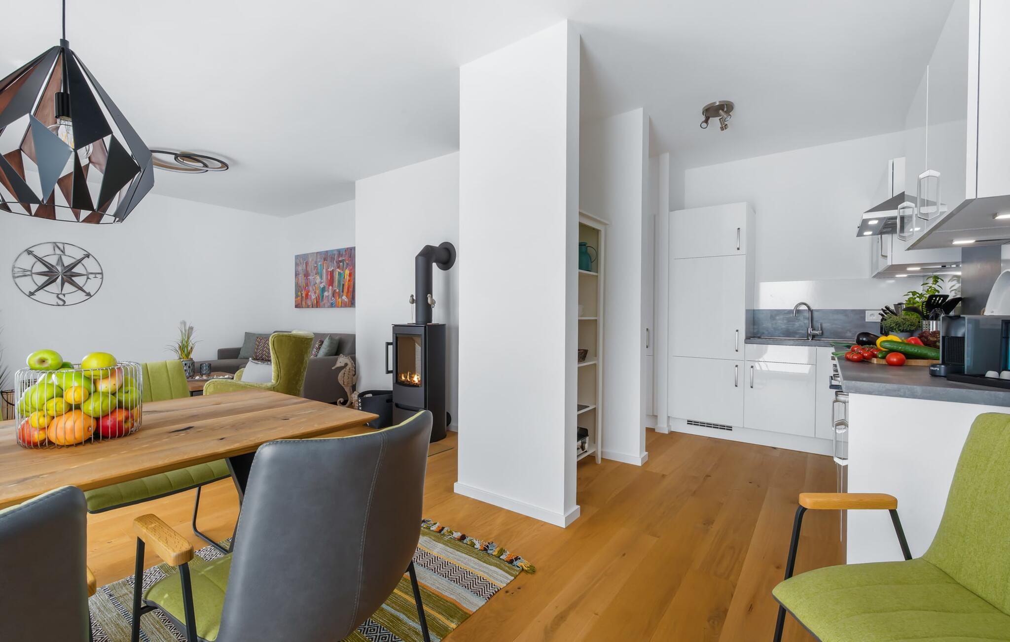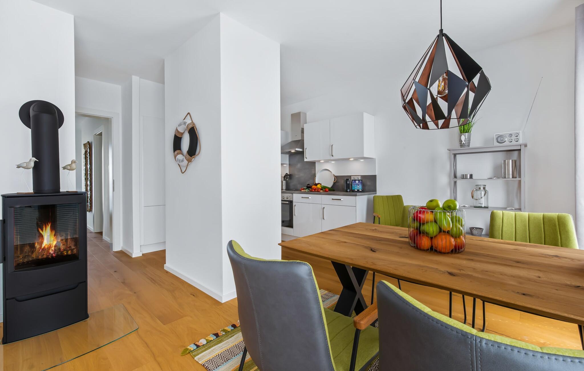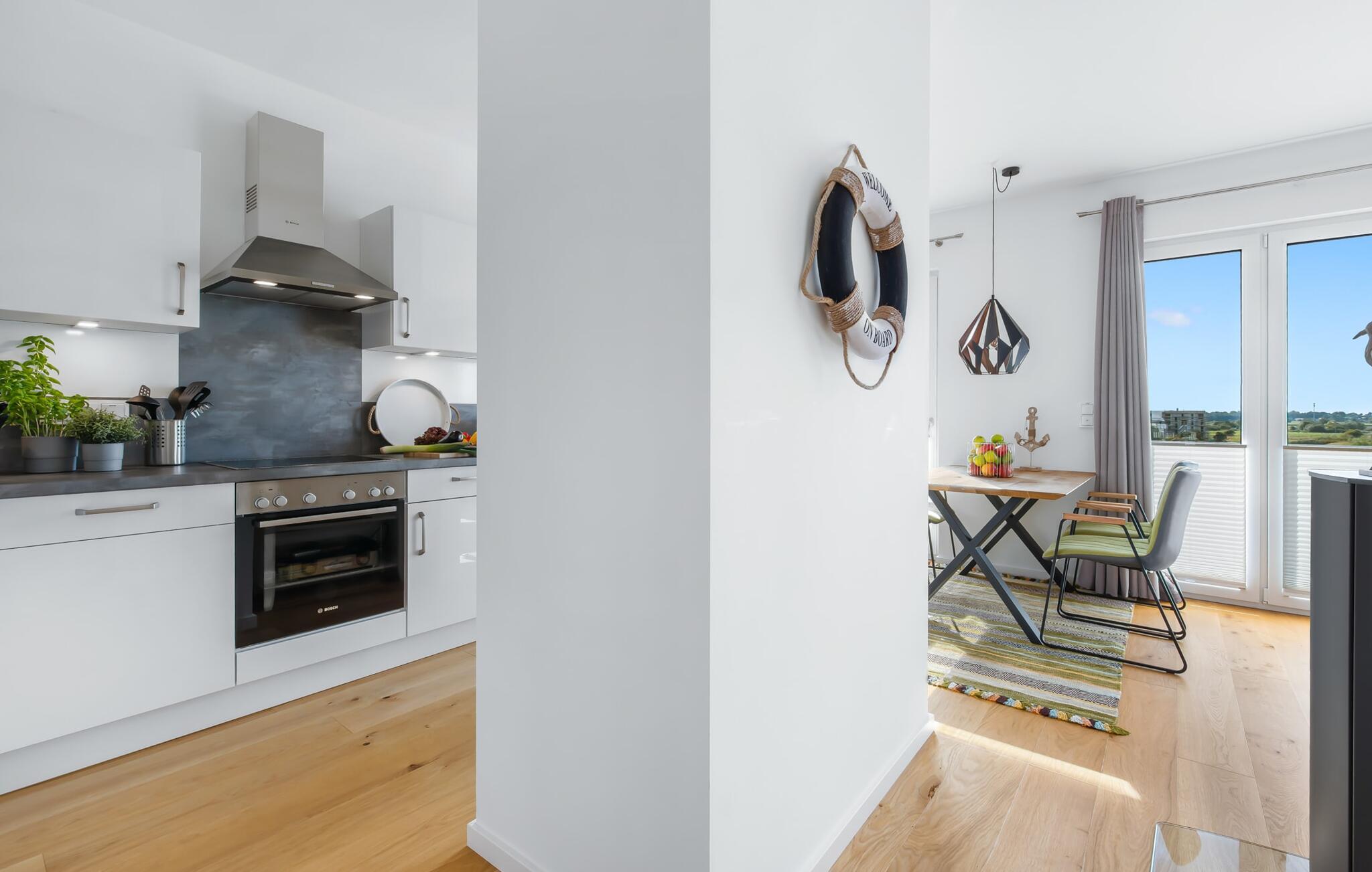 Die bodentiefe Fensterfront im offenen Wohn- und Essbereich bietet einen atemberaubenden Blick auf die weite Ostsee und sorgt für Wasserkino den ganzen Tag ohne langweilig zu werden. Tretet auf den angrenzenden Balkon und schnuppert nicht nur die frische Seeluft, sondern lauscht auch den versprochenen SOUNDS OF THE SEA.