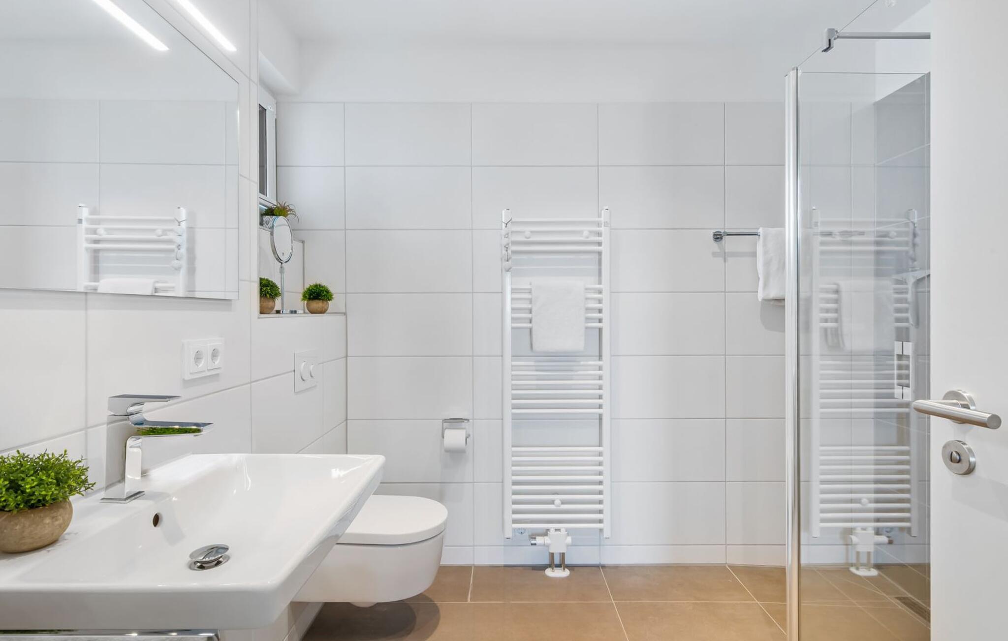 Das Duschbad mit bodengleicher Dusche lässt ebenfalls keine Wünsche offen und verfügt über alles, was der Mensch für einen gelungenen Start in einen neuen Urlaubstag braucht.
