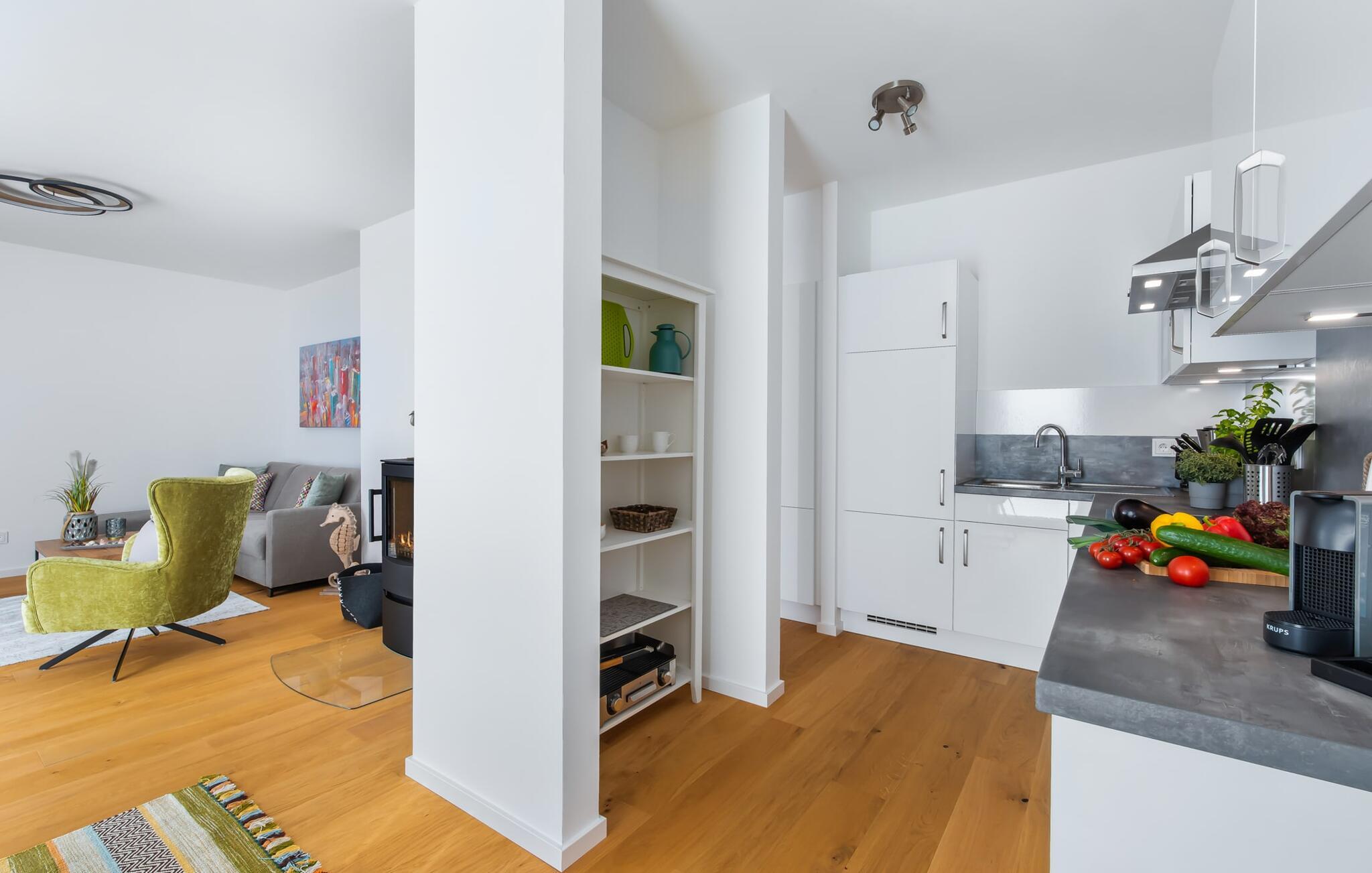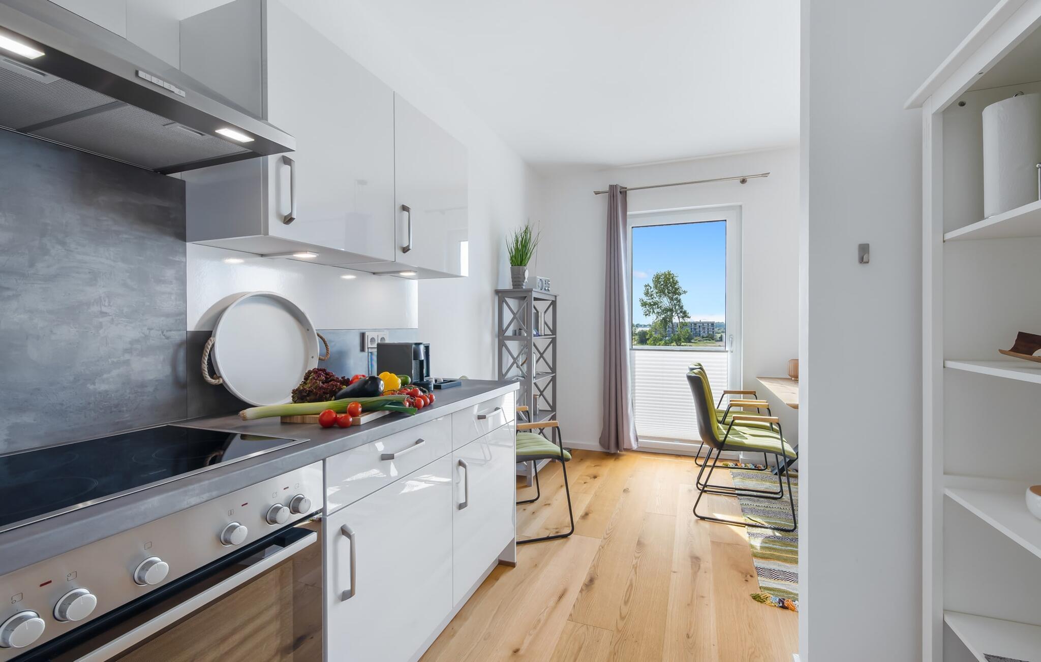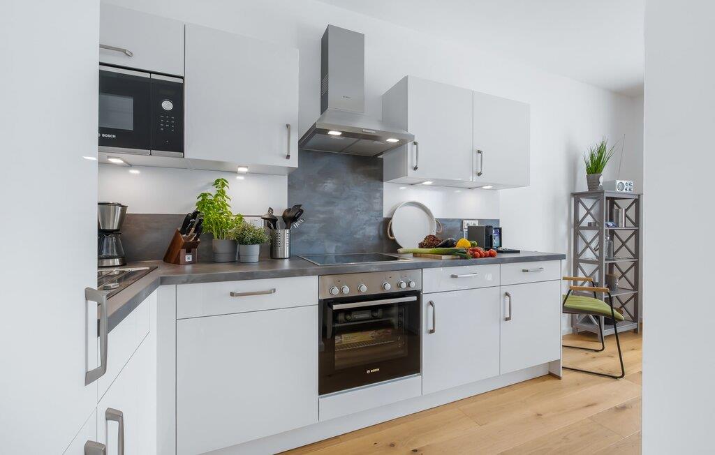 Die helle integrierte Küche bietet selbst Kochprofis alles, was man zum Zubereiten von leckeren Speisen benötigt, die dann gemeinsam auf dem Balkon mit Wasserblick ohne Ende genossen werden können.
