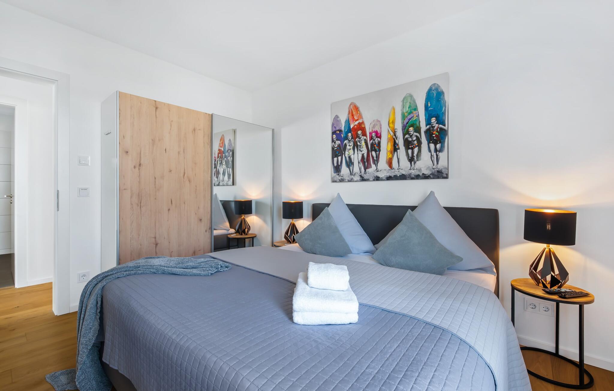 Die beiden Schlafzimmer sind jeweils mit einem Doppelboxspringbett und einem Fernseher ausgestattet und entspannter Schlaf ist somit garantiert. Ein zweiter Balkon lädt zum Sundowner mit Blick auf das große Hafenbecken, inklusive atemberaubender Sonnenuntergänge, ein.