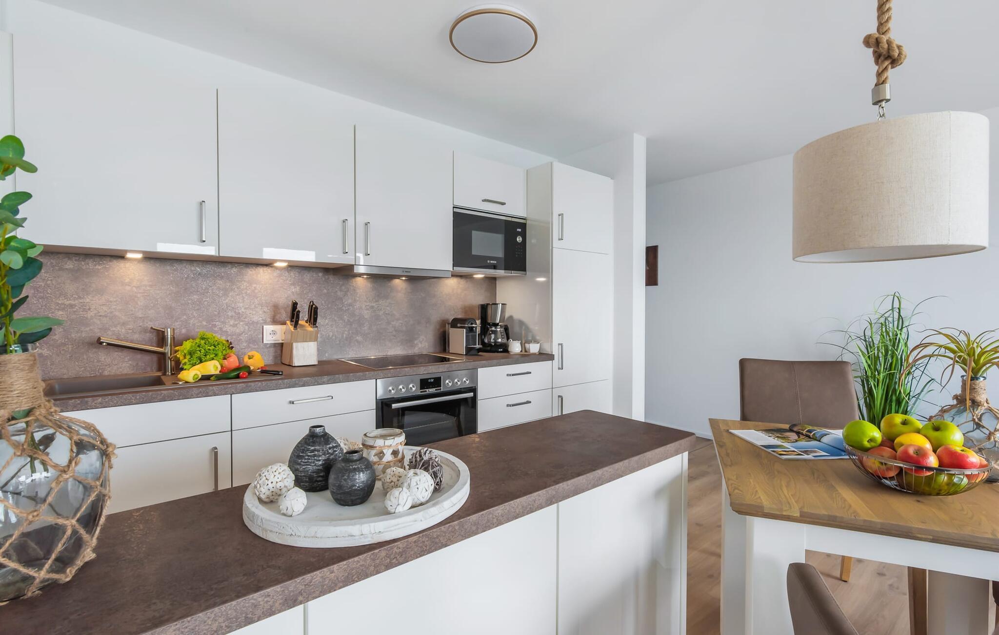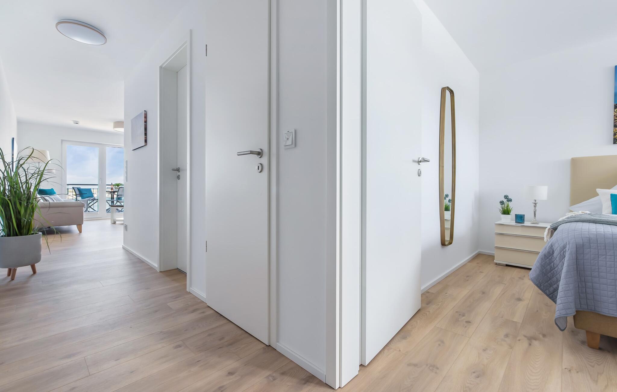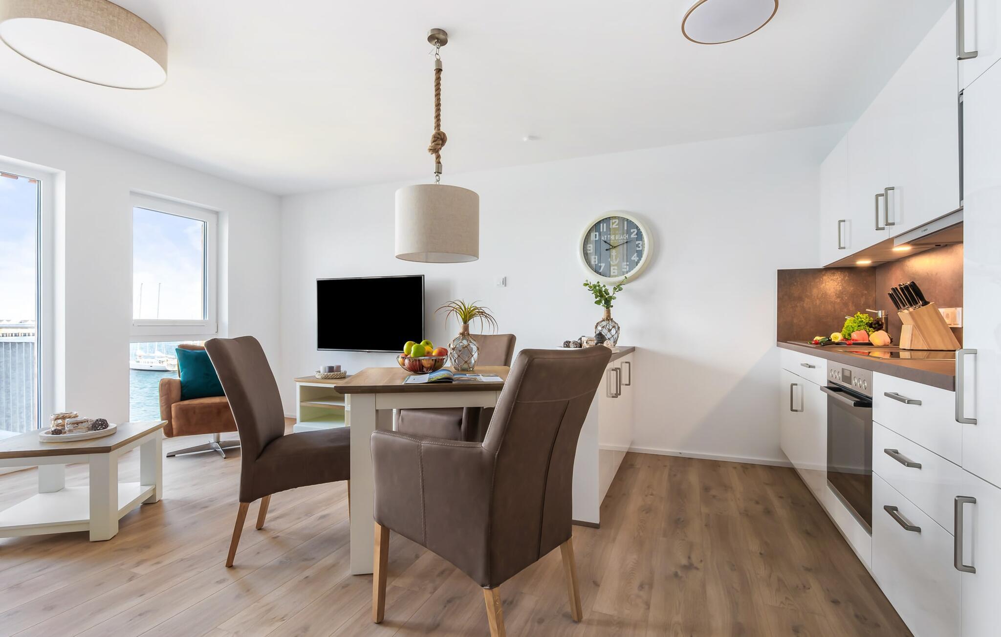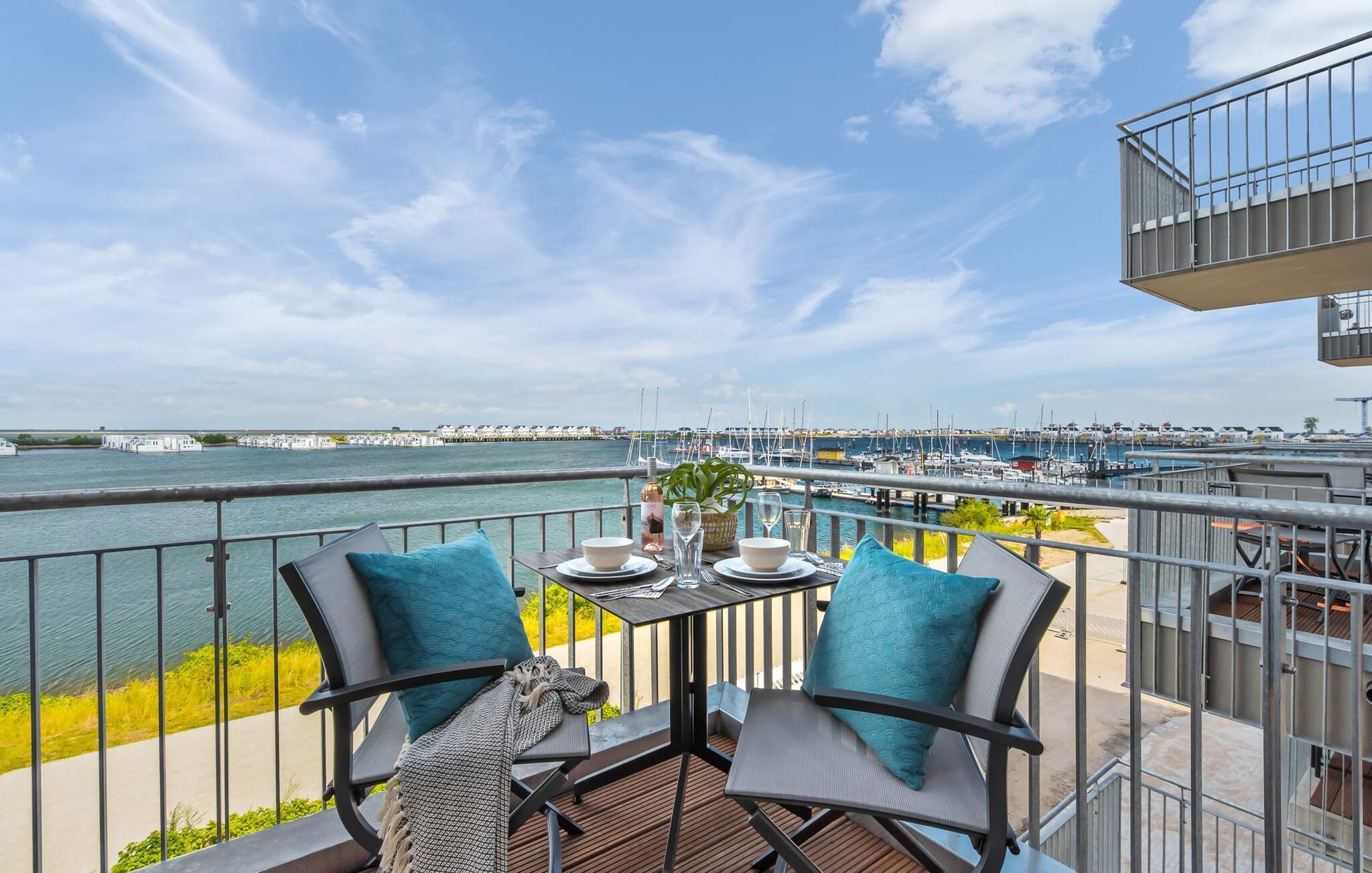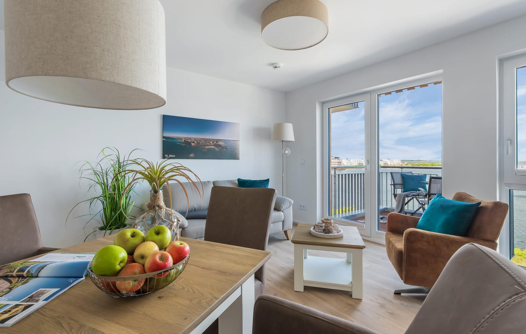 Moderne Ferienwohnung St. Malo direkt an der Hafenpromenade im OstseeResort Olpenitz mit Balkon und herrlichem Meerblick.