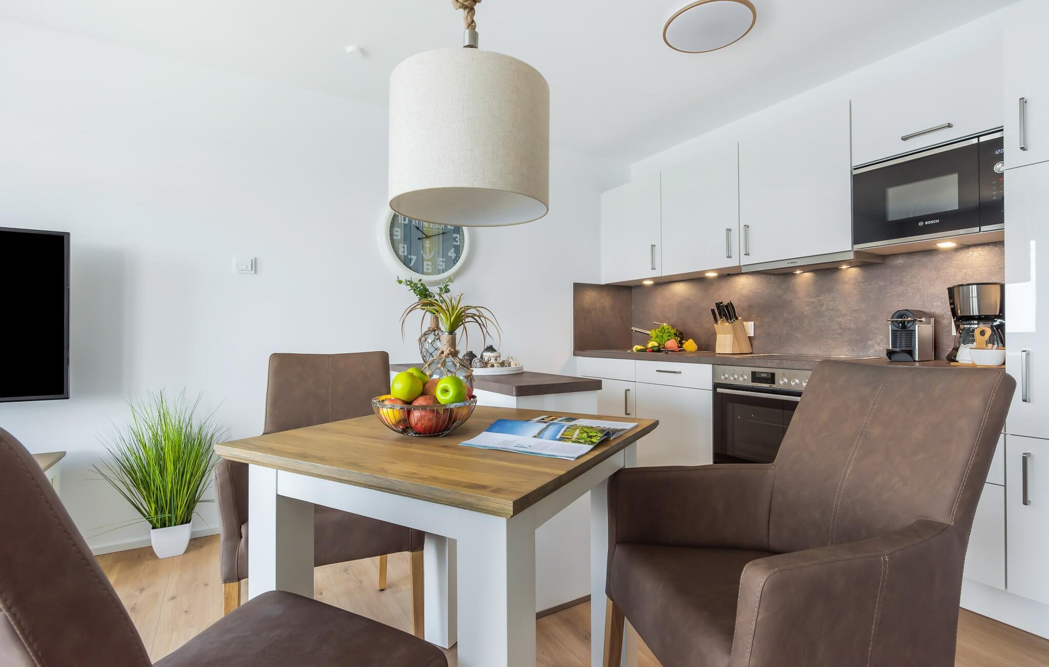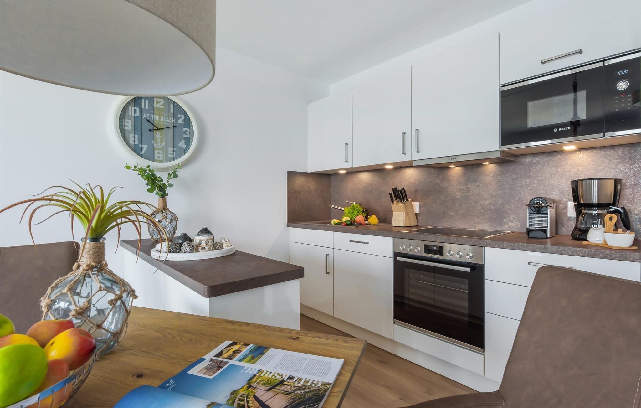 Der offene Wohn-/Essbereich mit seiner gemütlichen Wohnecke und Fernseher lädt zum Faulenzen ein und die bestens bestückte Küche verlockt zum fröhlichen gemeinsamen Kochen, insbesondere durch den integrierten Küchentresen. Der Essbereich lässt ebenfalls keine Wünsche offen und man bleibt gerne länger sitzen.