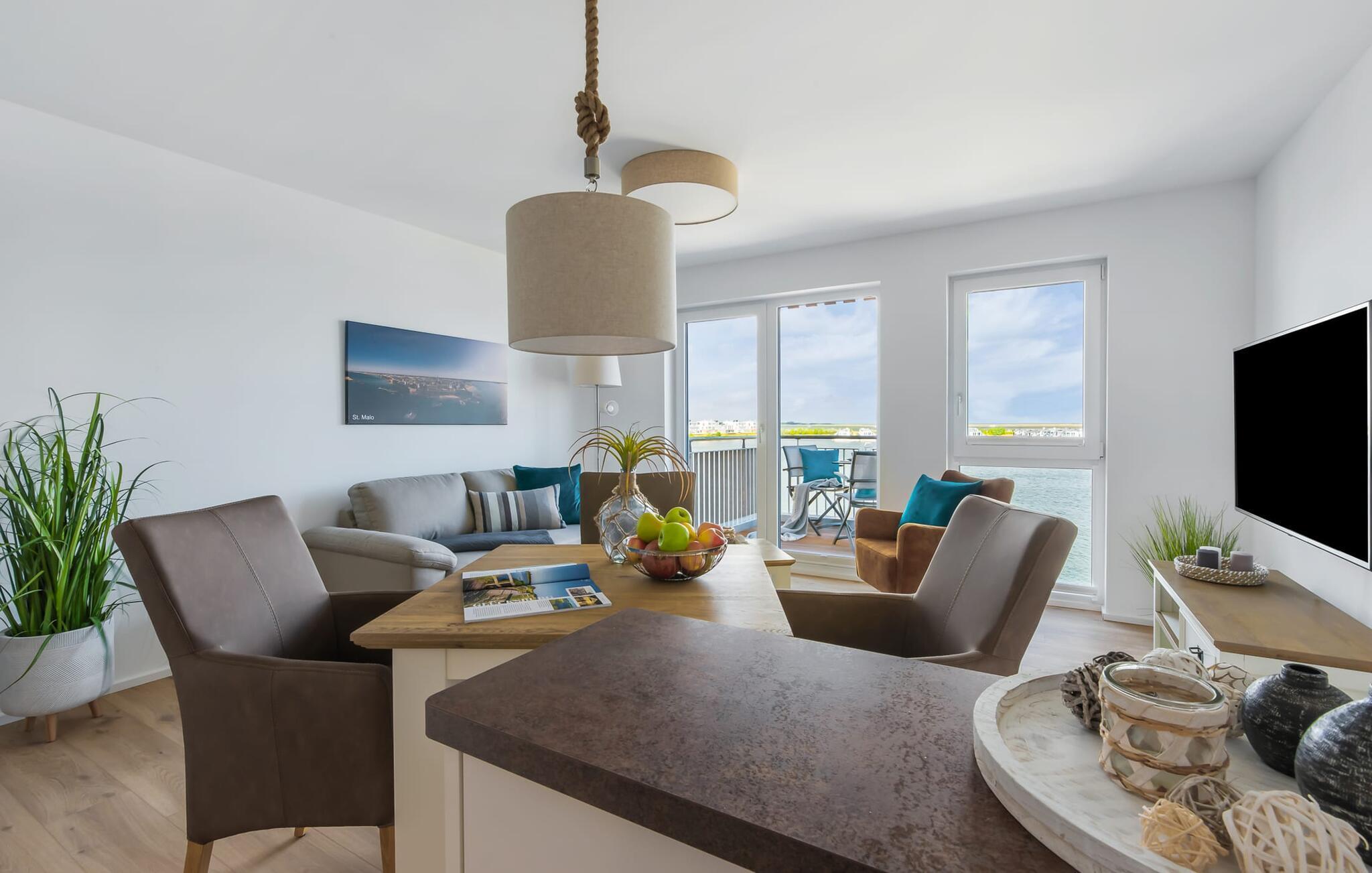 Schließt die Wohnungstür auf, tretet ein und fühlt euch einfach nur wohl in ST. MALO! Euer Blick fällt direkt durch die bodentiefen Fenster über den Balkon auf den Hafen und Wasser bis zum Horizont. Das ist Urlaubsfeeling pur!