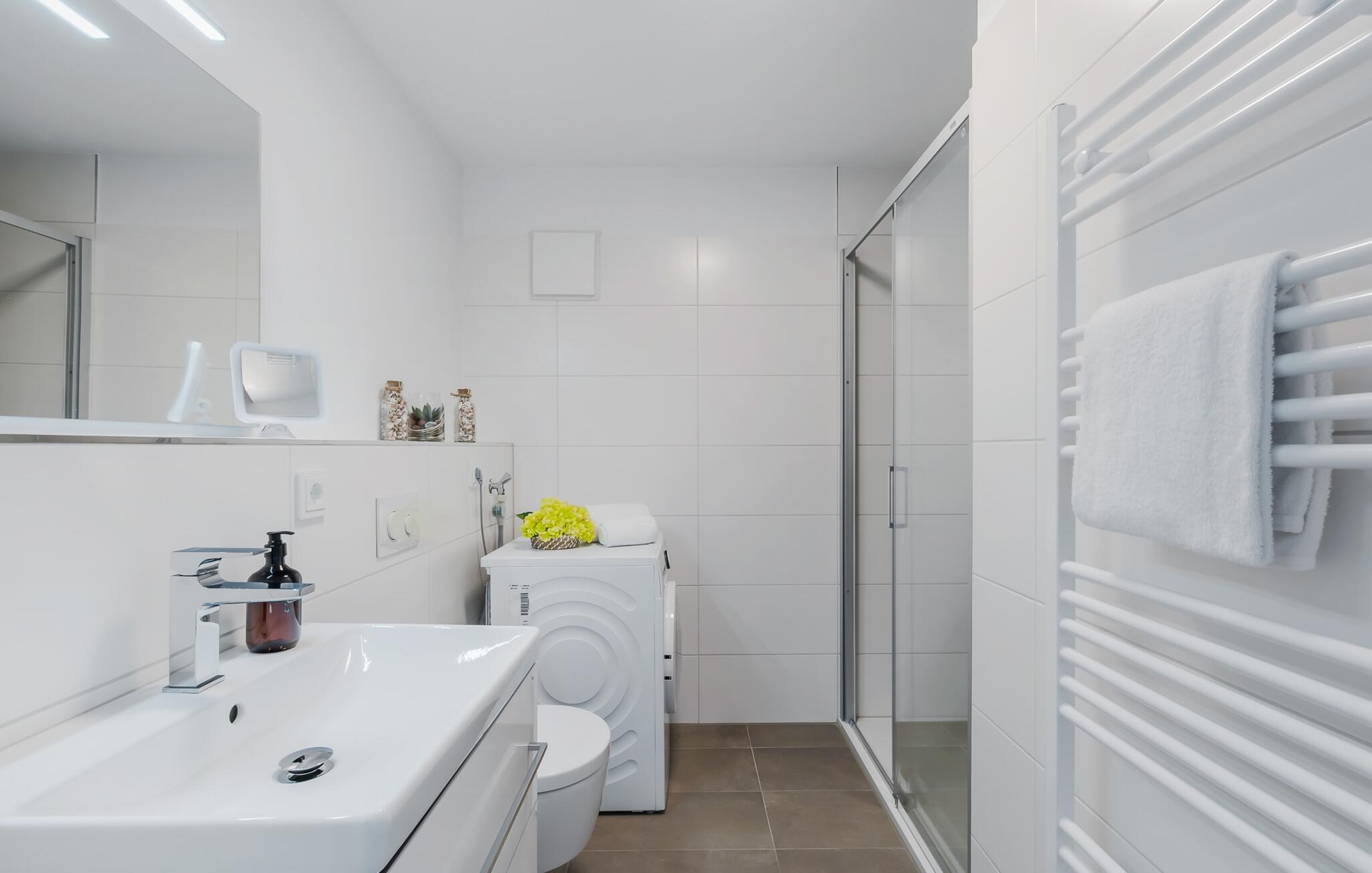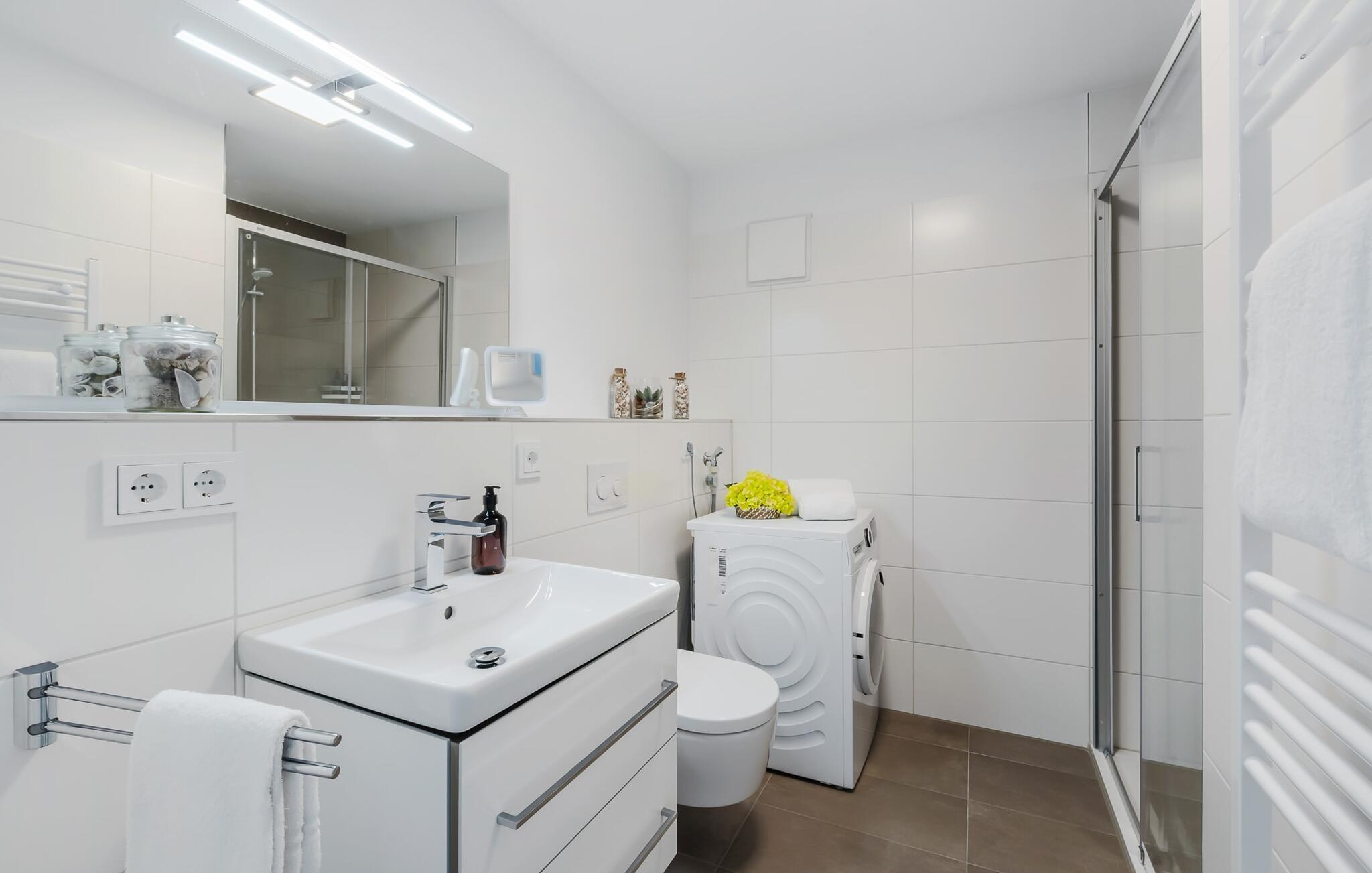Im Badezimmer befindet sich neben allem Nützlichen eine bodengleiche Dusche für den gelungenen Start in einen neuen Urlaubstag.