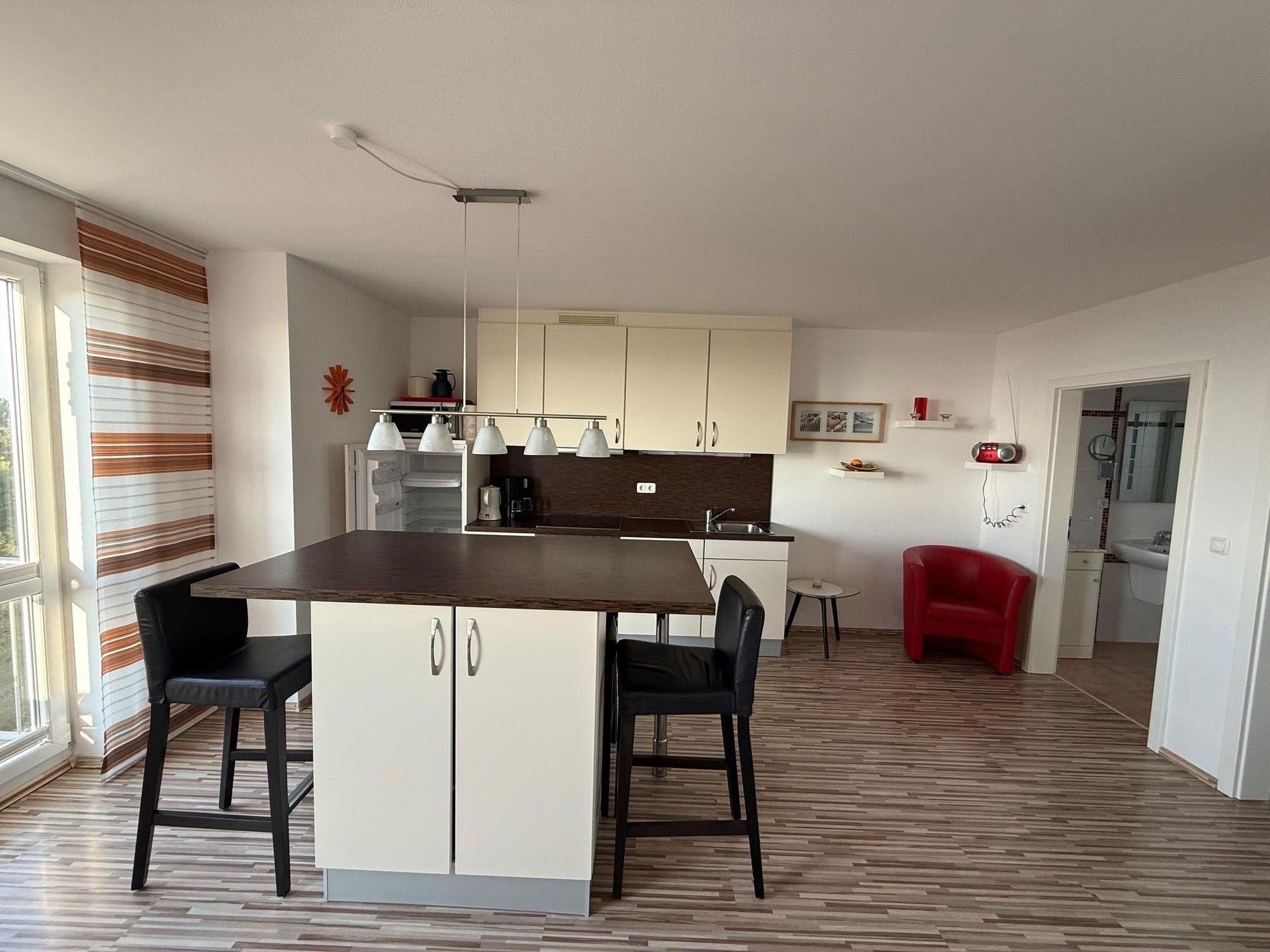 Die Küche ist komplett ausgestattet mit Cerankochfeld, Backofen, Geschirrspüler, Mikrowelle und Kühlschrank mit Gefrierfach. Zur Ausstattung gehört ebenfalls ein SAT-TV, Radio, Südbalkon haben Sie einen fantastischen Blick über die Ostsee, bis hin zum Festland. Für Kleinkinder Steht ein Reisebett und Hochstuhl zur Verfügung.