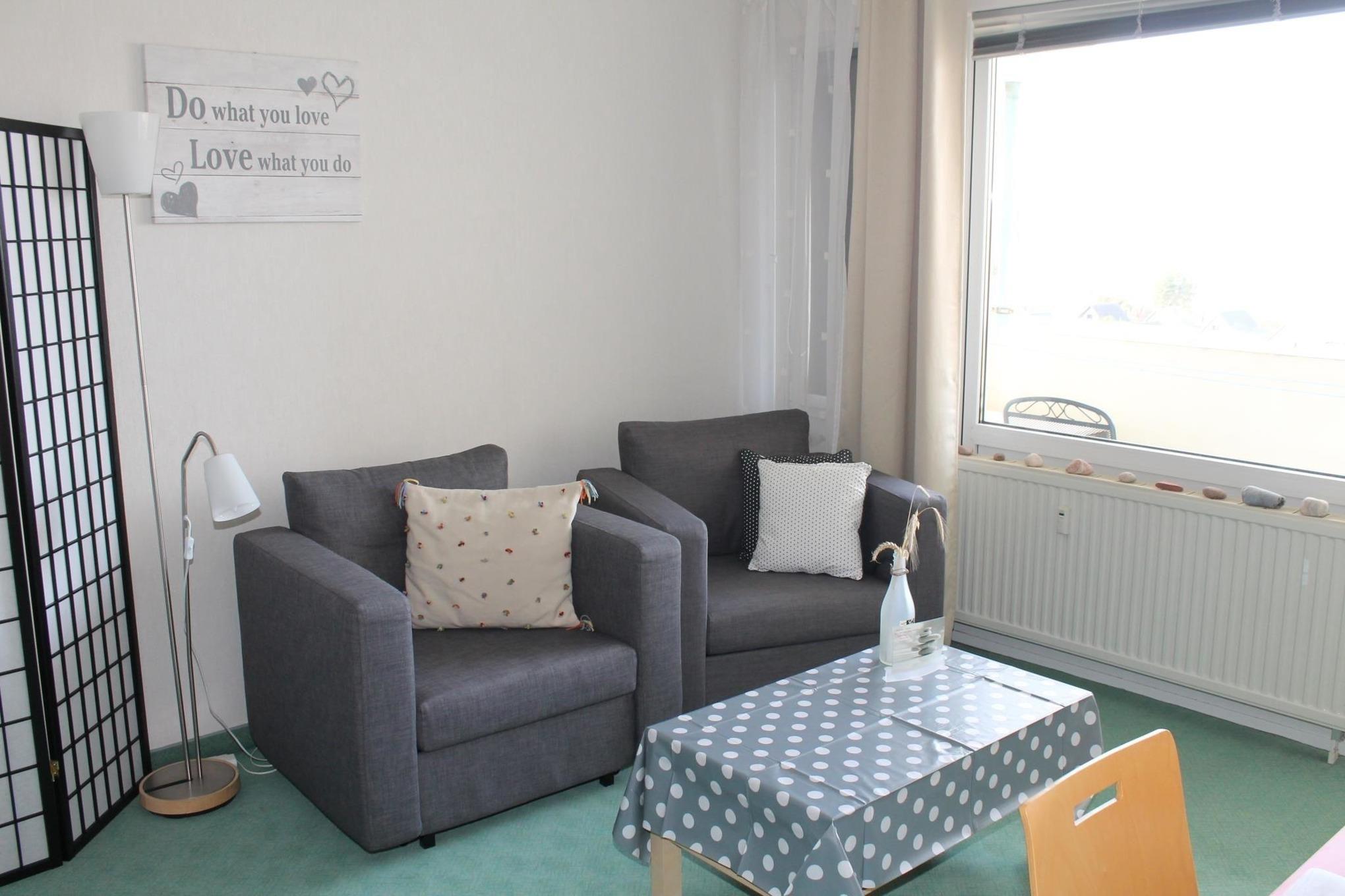 Die gemütliche 1-Zimmerwohnung mit Doppelbett, 2 bequemen Schlafsesseln und behaglichem Wohnbereich grenzt direkt an die Loggia.
