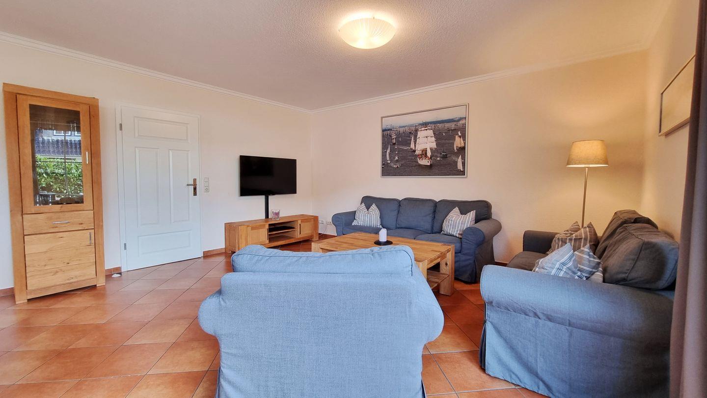 Wohn- Essbereich: Dreisitzer-Sofa / Zweisitzer-Sofa / Sessel / Fernseher / Esstisch / 8 Stühle / Vitrine / Kommode
