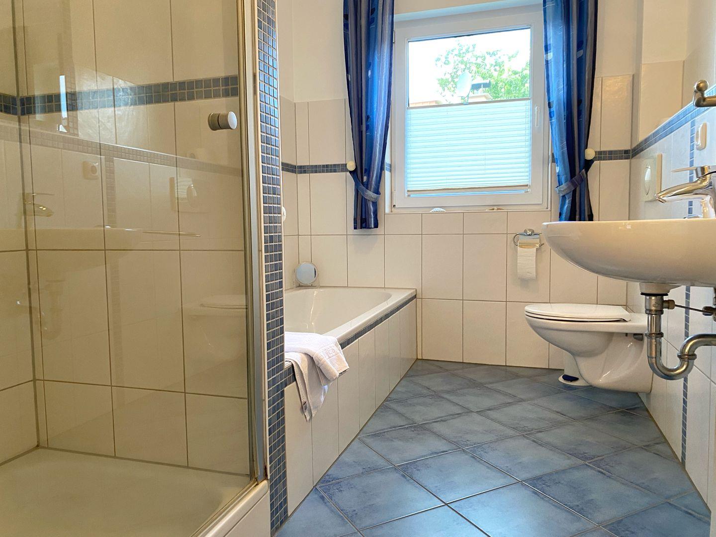 hochwertige Verfliesung in Küche, Bad und teilweise im Wohnbereich, in den Schlafzimmern liegt Laminat