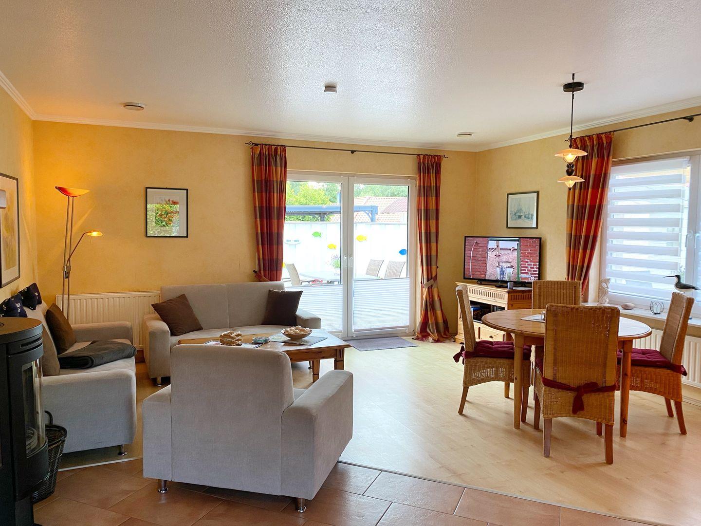großzügiger Wohnbereich mit Kaminofen und Zugang zur Terrasse und Garten