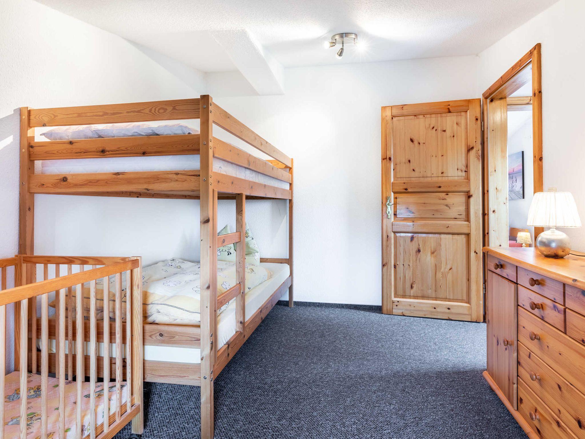 Oberer Bereich: zwei getrennte Schlafzimmer. Schlafzimmer 1 mit Doppelbett, Kinderbettchen und Kleiderschrank. Schlafzimmer 2 mit Etagenbett und Kommode.