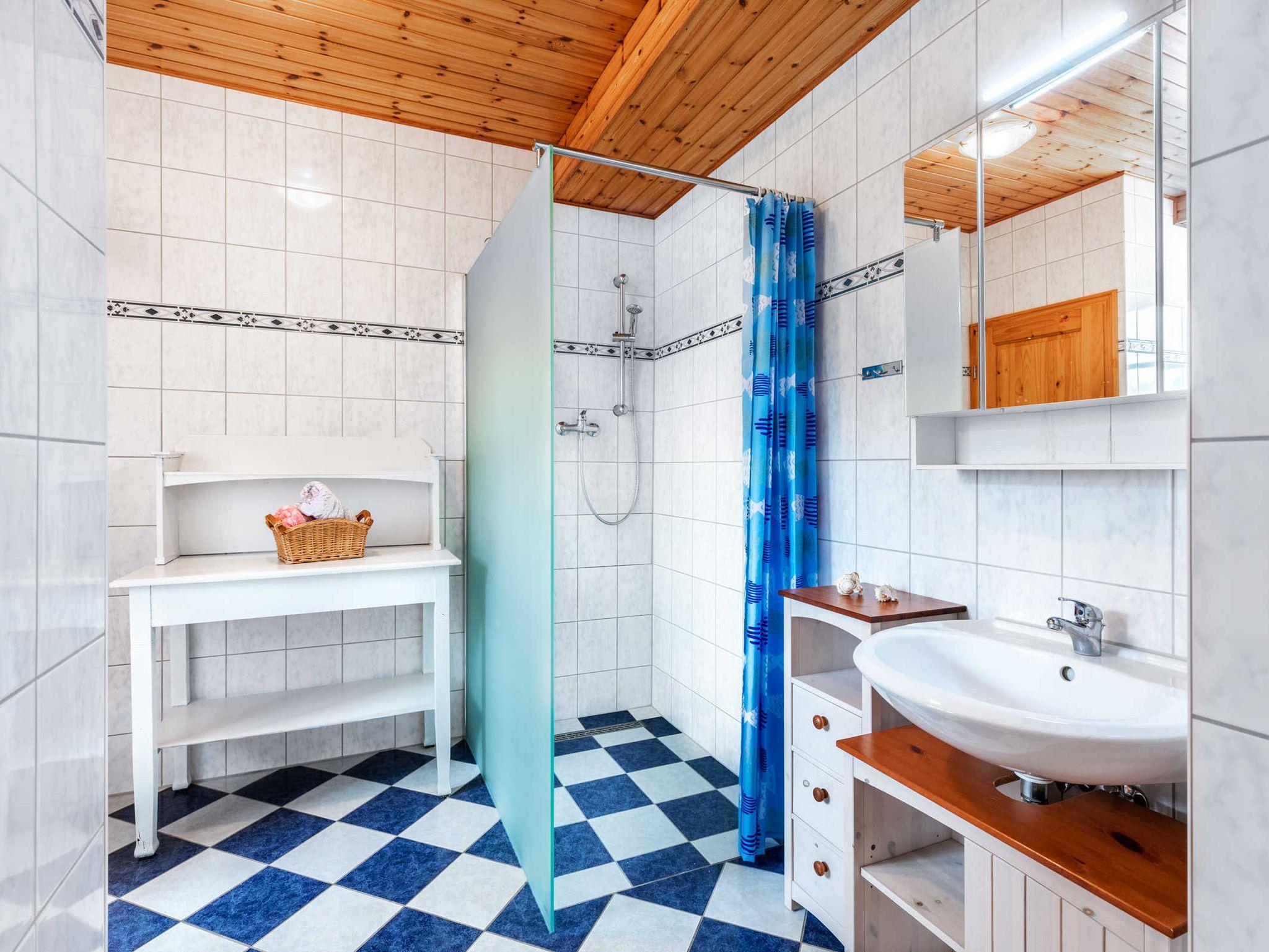 Oberer Bereich. Über eine stabile Treppe erreichen die Gäste den schönen oberen Bereich der Ferienwohnung. Hier befinden sich 3 großzügige separate Schlafzimmer. Schlafzimmer 1 mit Doppelbett und Kleiderschrank, Schlafzimmer 2 mit 2 Einzelbetten und Kleiderschrank. Schlafzimmer 3 mit Doppelbett sowie stabilem Holzkinderbettchen, Kleiderschrank.