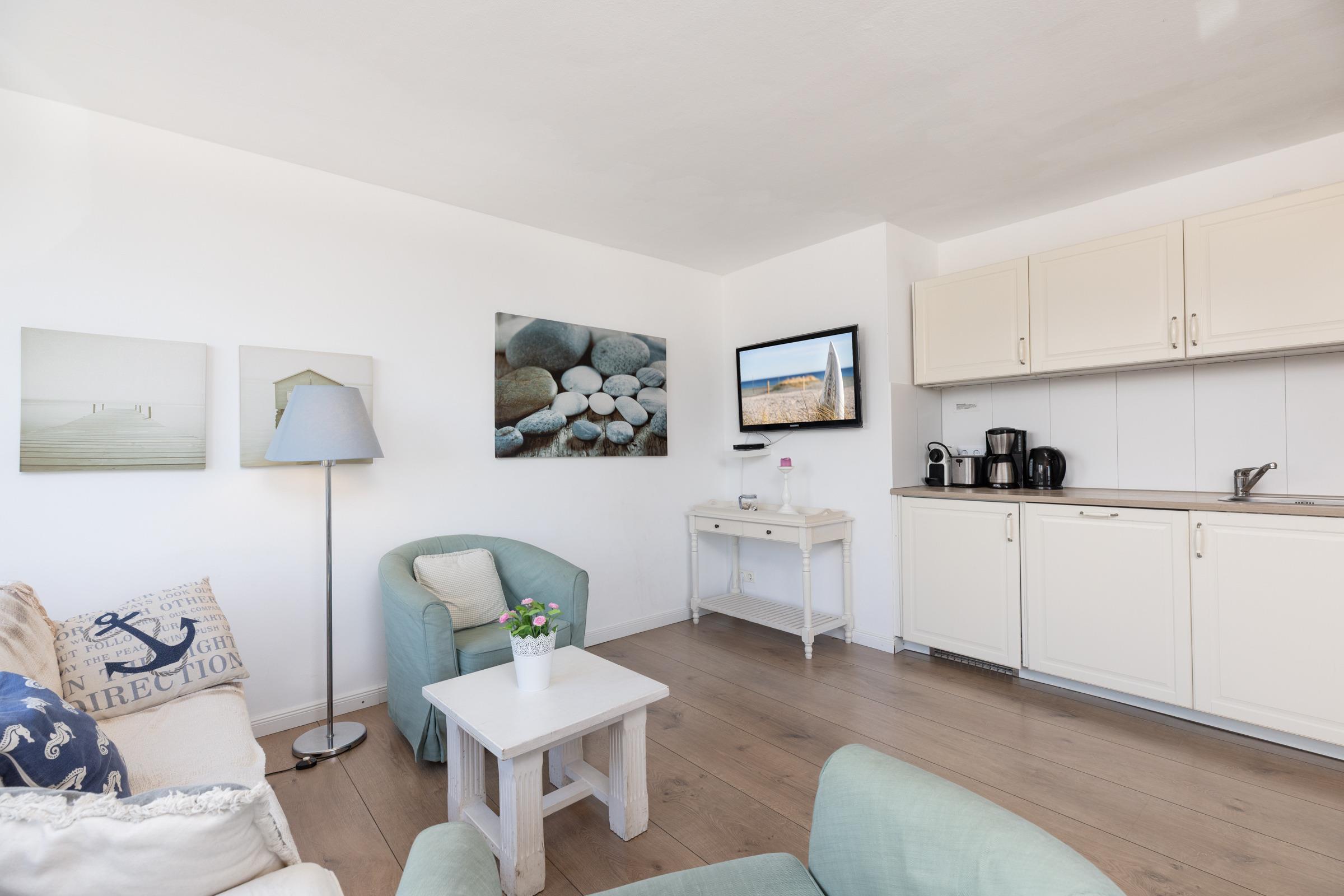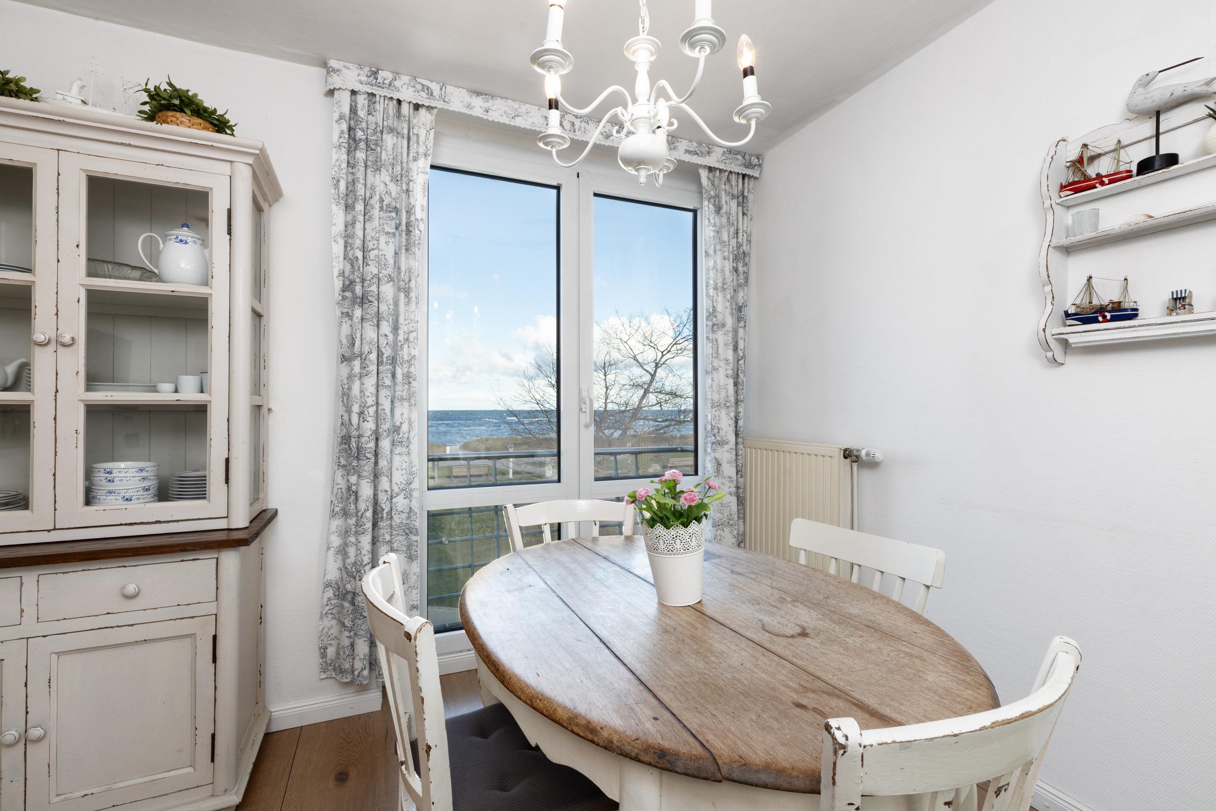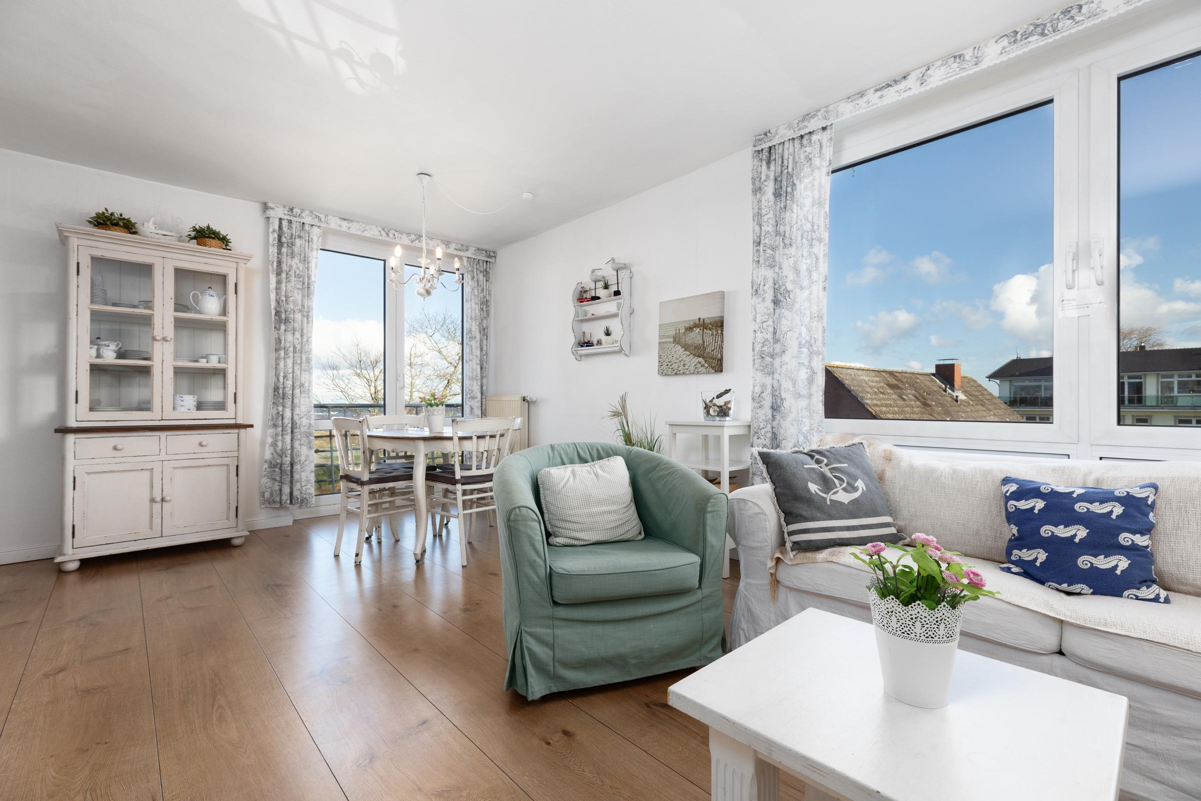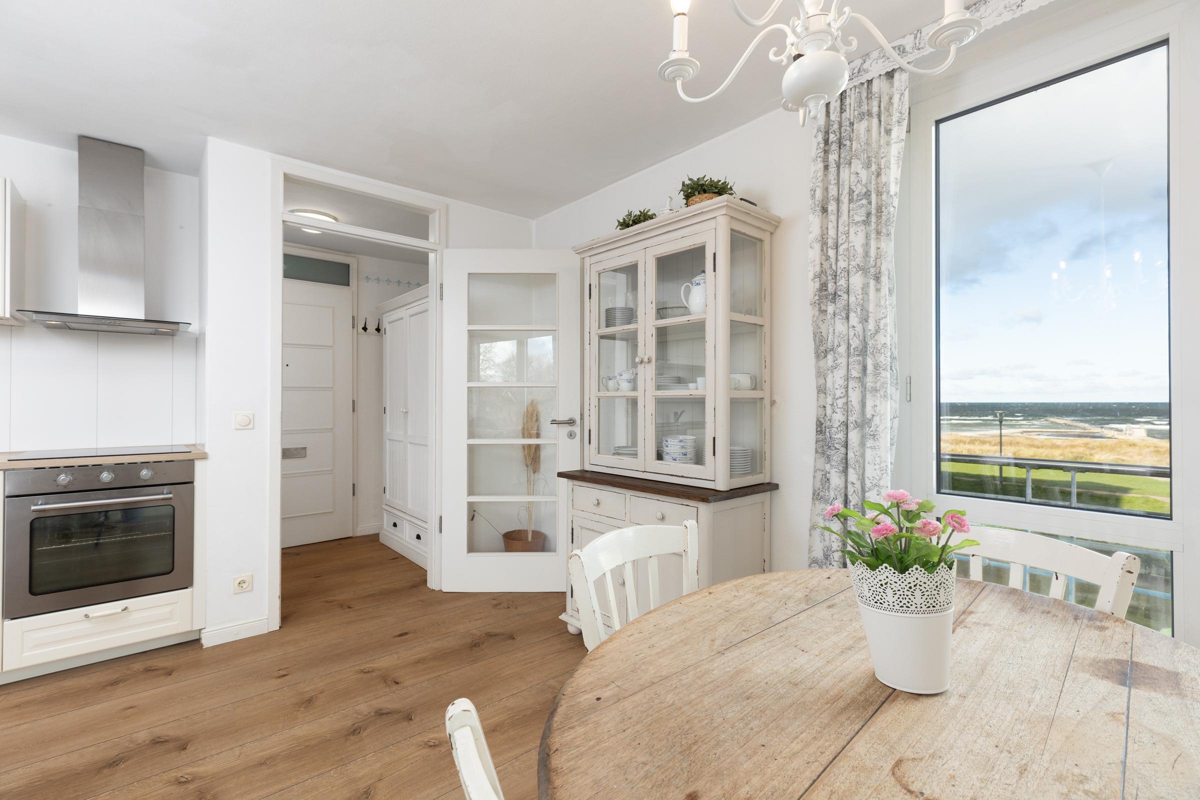 Nur rund 100 Meter vom Strand entfernt ... Die ideale Lage und die liebevoll ausgesuchte Möblierung machen diese Ferienwohnung zum perfekten Urlaubsdomizil an der Ostsee. Lassen Sie sich vom traumhaften Meerblick vom Balkon aus verzaubern - auch von Innen haben Sie die Ostsee im Blick. Das Appartement besteht aus einem kombiniertem Wohn-/Schlafbereich mit einer eingebauten Küchenzeile mit Ceranfeld und Geschirrspüler. Im separatem Schlafzimmer steht ein bequemes Doppelbett (2x 90x200 cm), in dem Sie herrlich träumen werden. Auch die Couch im Wohnzimmer bietet einen Schlafplatz (ca. 130x190 cm). In dem großen Badezimmer mit Duschwanne und Handtuchtrockner können Sie entspannt in den neuen Tag starten.