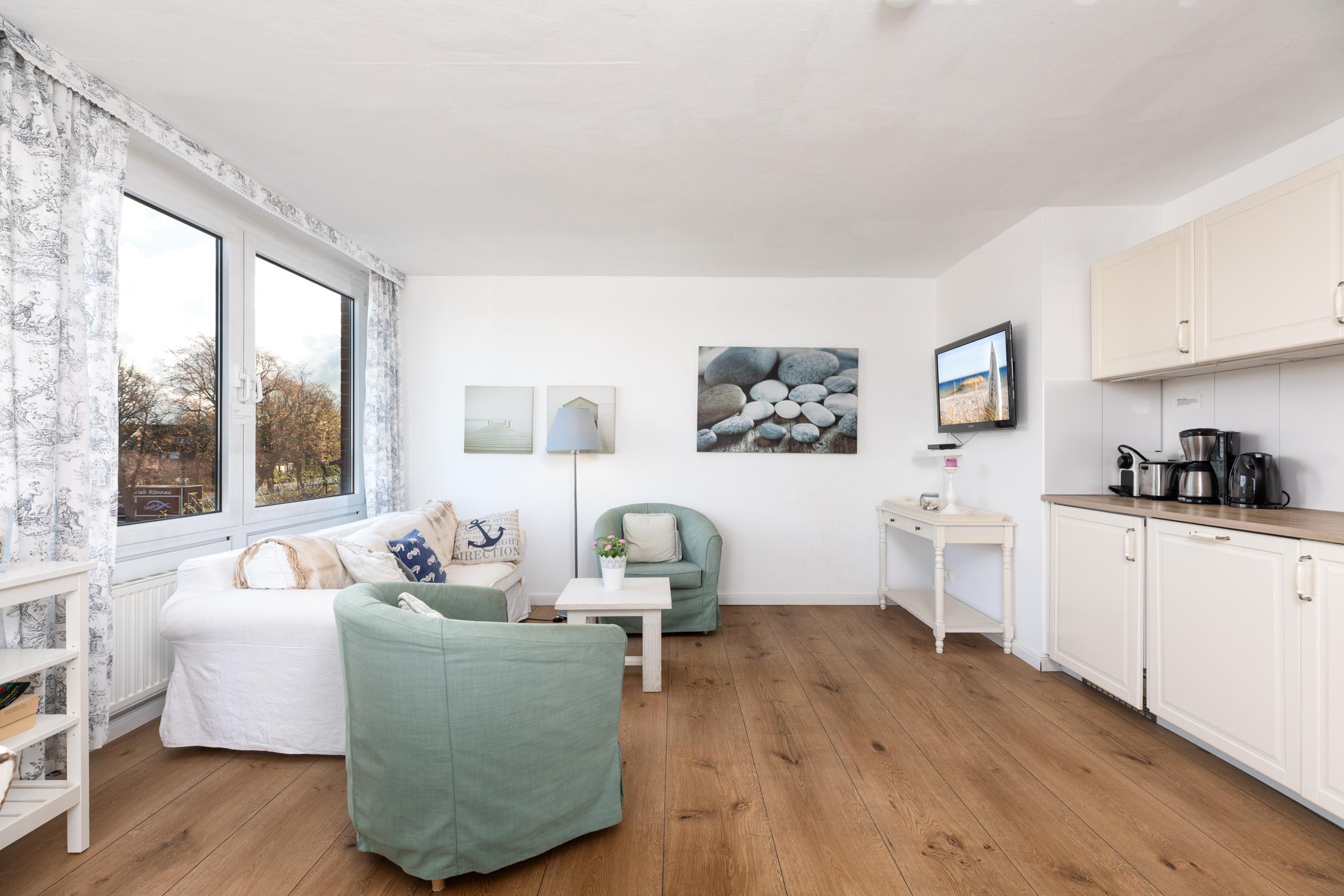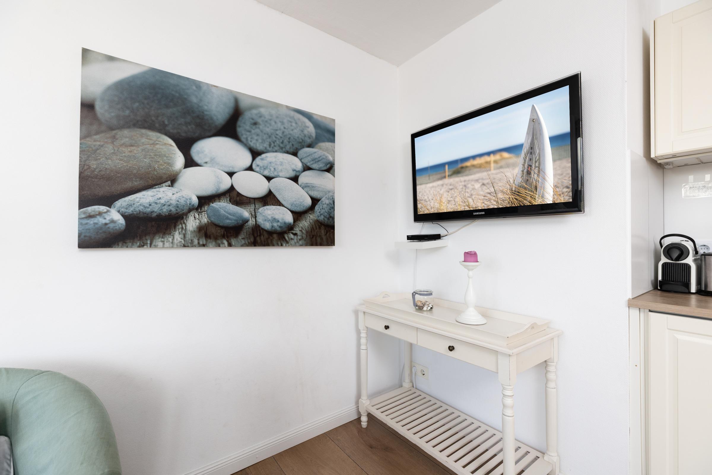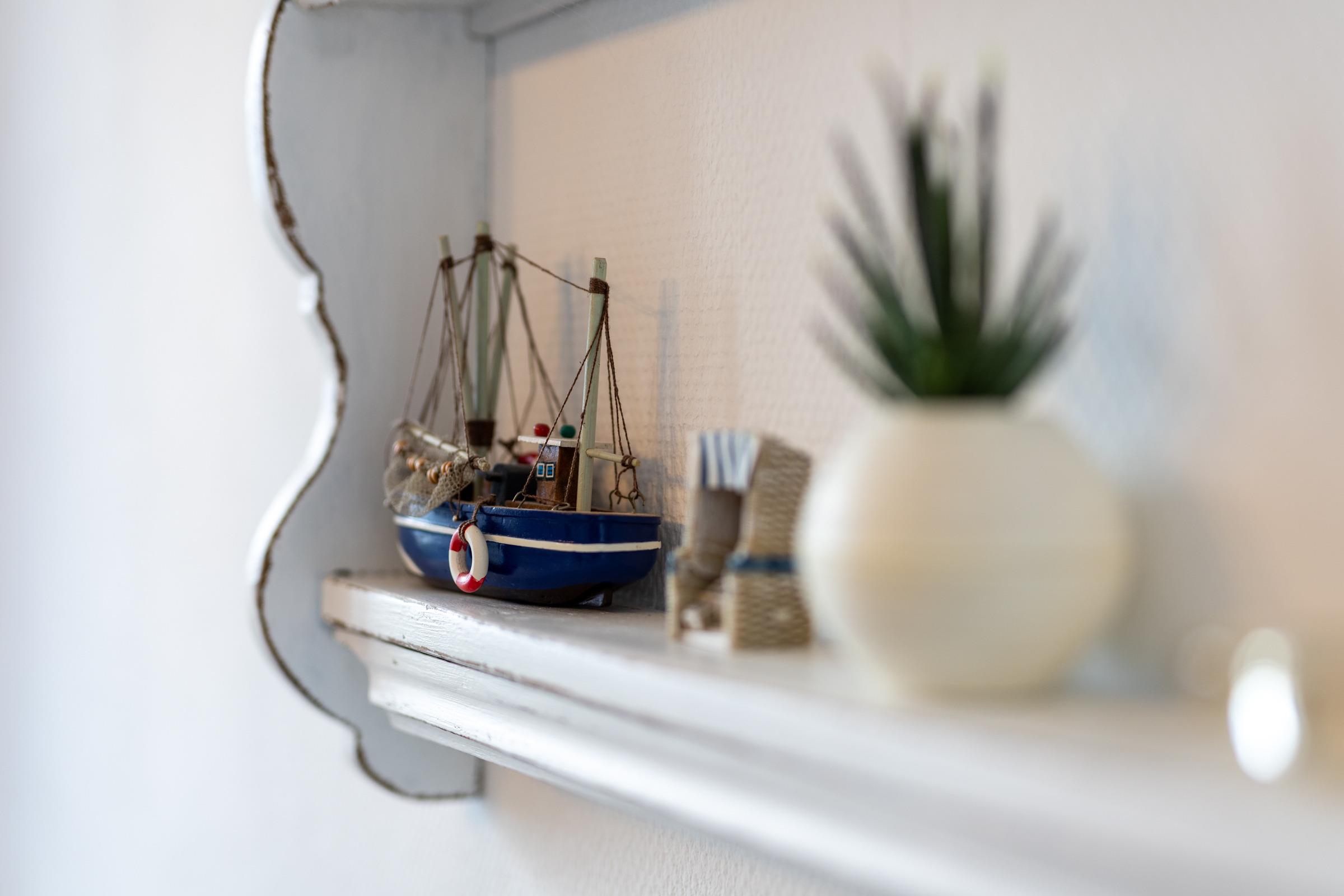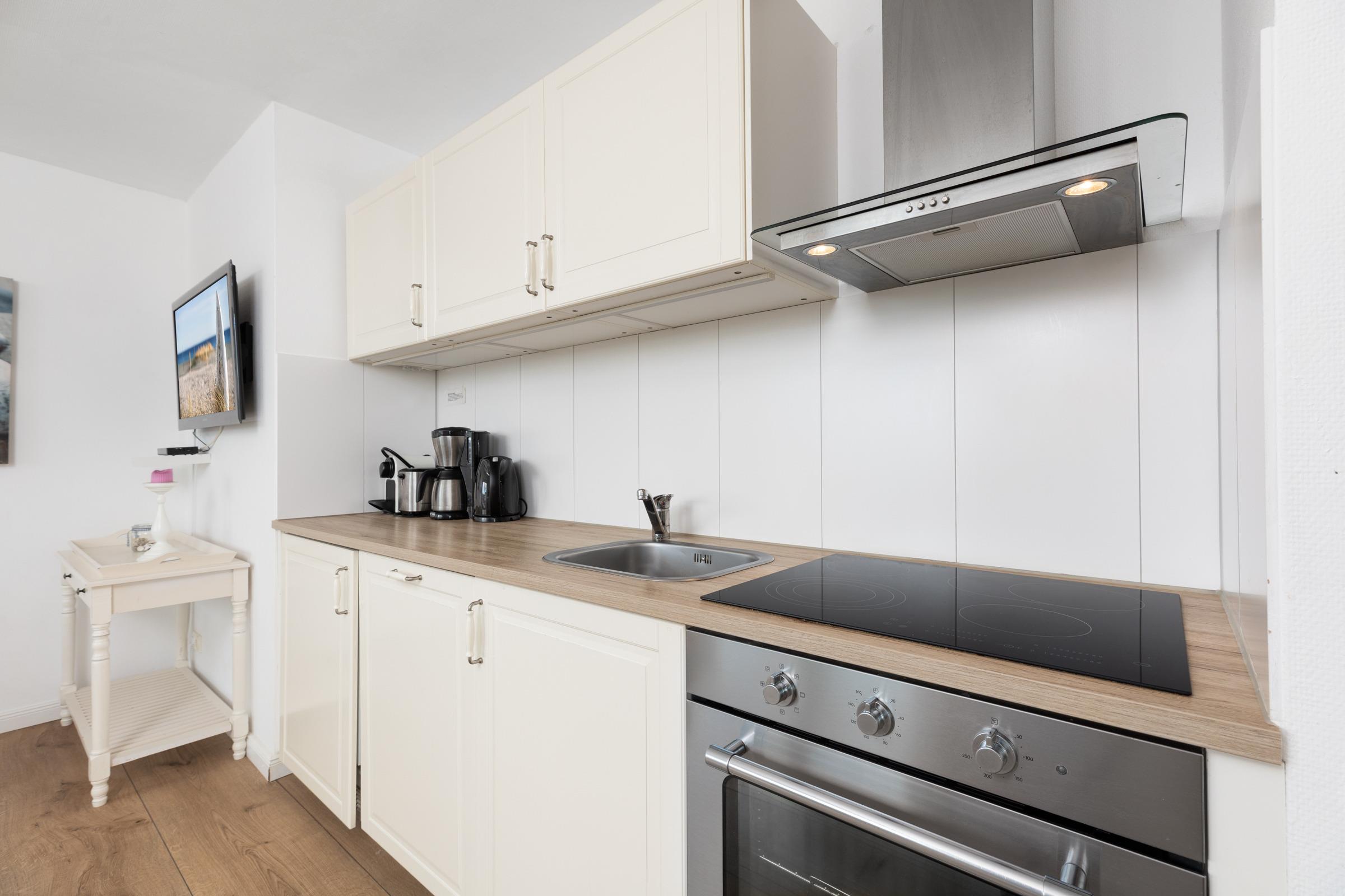 Nur rund 100 Meter vom Strand entfernt ... Die ideale Lage und die liebevoll ausgesuchte Möblierung machen diese Ferienwohnung zum perfekten Urlaubsdomizil an der Ostsee. Lassen Sie sich vom traumhaften Meerblick vom Balkon aus verzaubern - auch von Innen haben Sie die Ostsee im Blick. Das Appartement besteht aus einem kombiniertem Wohn-/Schlafbereich mit einer eingebauten Küchenzeile mit Ceranfeld und Geschirrspüler. Im separatem Schlafzimmer steht ein bequemes Doppelbett (2x 90x200 cm), in dem Sie herrlich träumen werden. Auch die Couch im Wohnzimmer bietet einen Schlafplatz (ca. 130x190 cm). In dem großen Badezimmer mit Duschwanne und Handtuchtrockner können Sie entspannt in den neuen Tag starten.