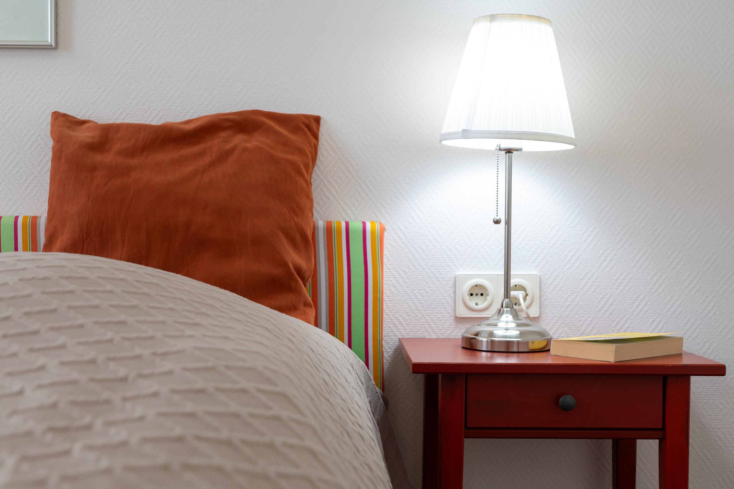 Schlafzimmer: Doppelbett (<170 cm), Verdunkelung: lichtdurchlässiges Plissee