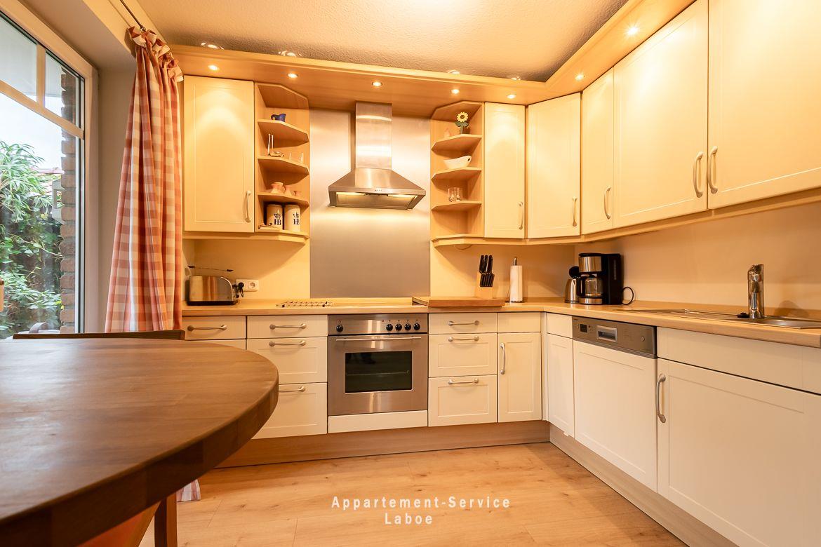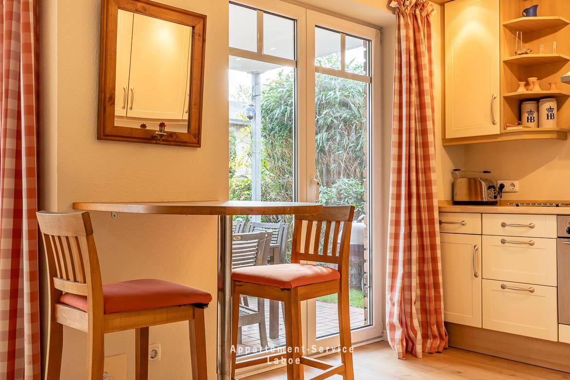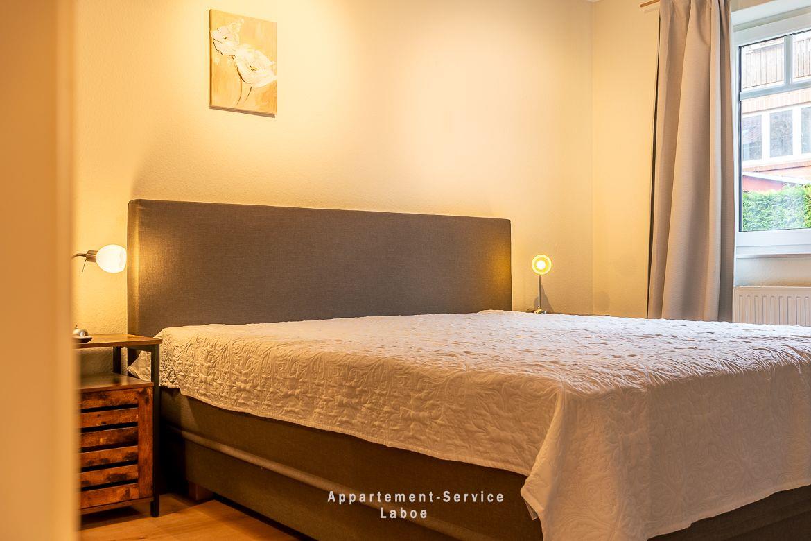 Zwei Schlafzimmer mit großen Doppelbetten (180 x 200 cm) sorgen für erholsamen Schlaf nach einem langen Tag am Meer. Der Wohnbereich ist gemütlich eingerichtet mit einem Sofa, einem Sessel und genügend Raum zum Ausruhen oder Lesen. Die offene Küchenzeile mit Esstisch ist gut ausgestattet und bietet alles, was du zum Kochen und Genießen brauchst.