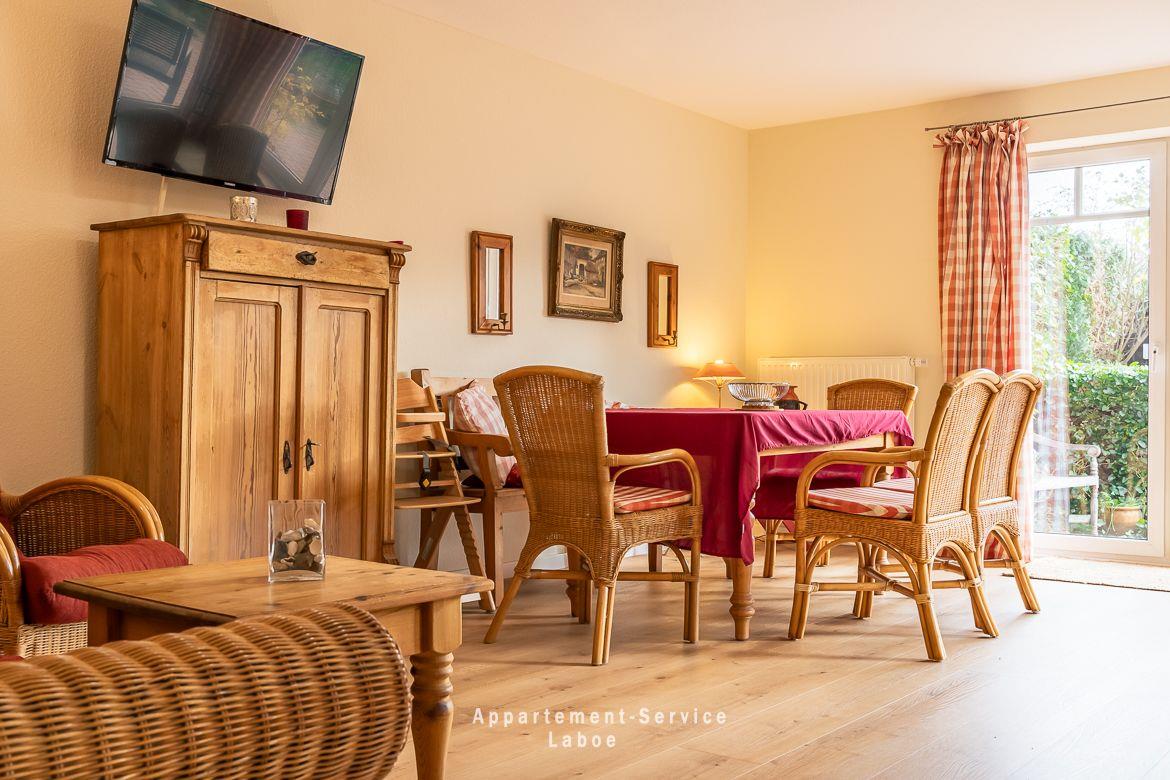 FeWo Dorfring: 3-Zimmer-Wohnung, über 90 m², im Erdgeschoss, für bis zu 4 Personen. Zwei Schlafzimmer mit Doppelbetten (180?x?200?cm). Wohnbereich mit Sofa, Sessel, WLAN. Offene Küchenzeile mit Esstisch und vollständiger Ausstattung. Badezimmer mit Dusche und WC. Möblierte Terrasse mit Elektrogrill, zusätzliche Sitzecke im Garten. Eigener Strandkorb am Kurstrand in Stein (Mai–September). Waschmaschine, Trockner. Pkw-Stellplatz direkt an der Unterkunft. Ruhige Lage, strandnah, gut erreichbar.